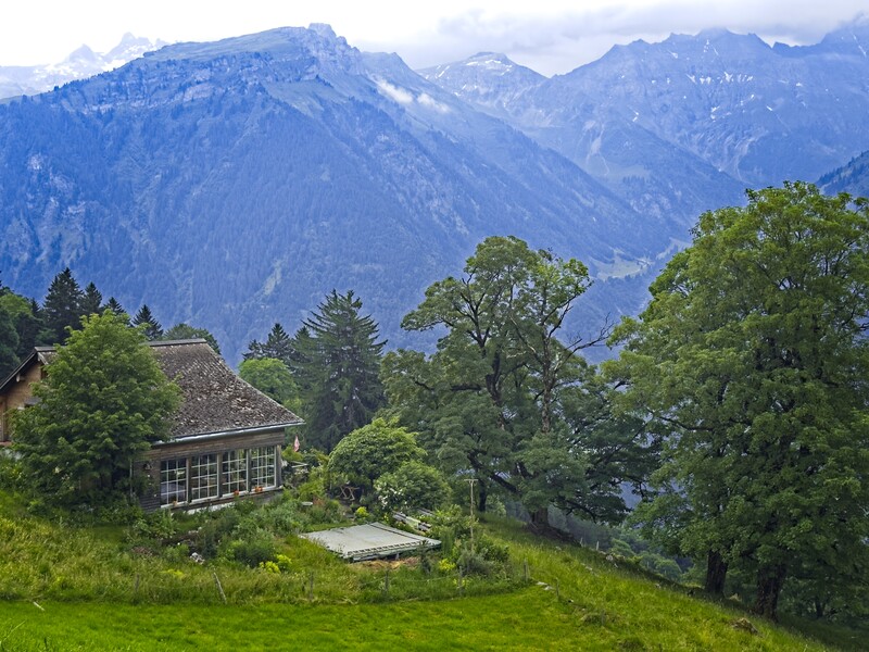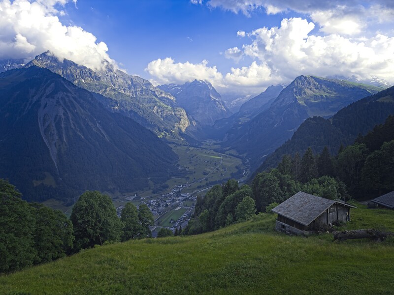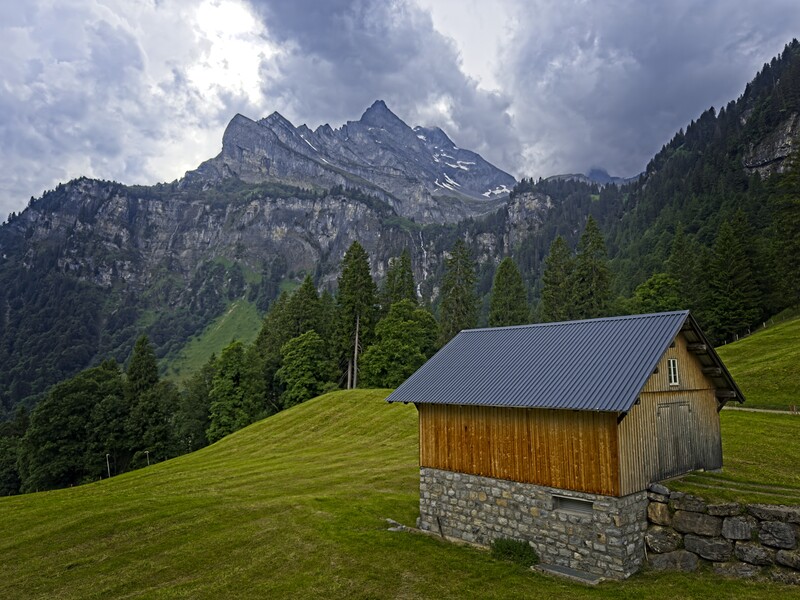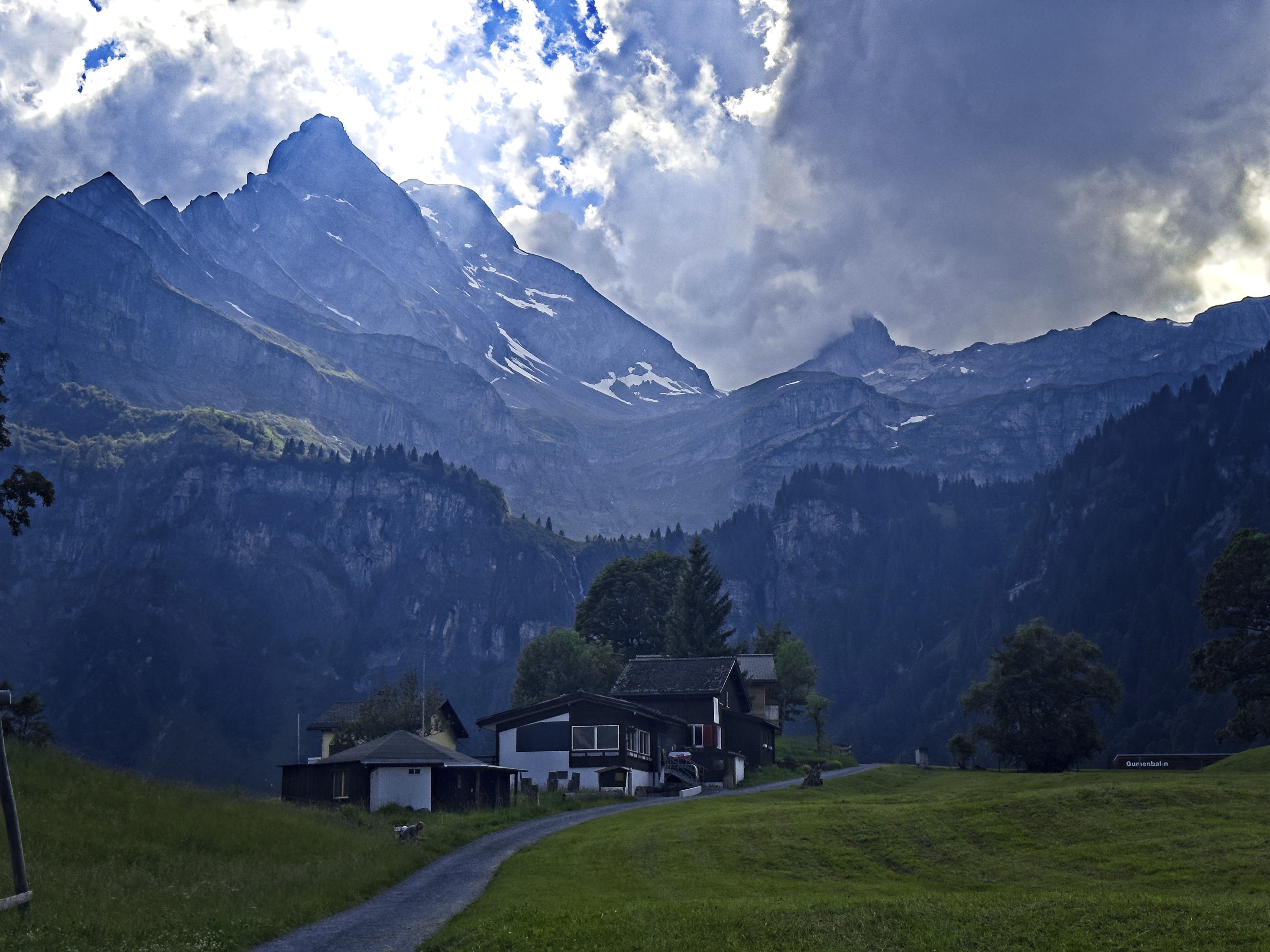 The valley was slowly filling with clouds. As I came back to town it started to rain. I sat at a restaurant by an older lady who said her father had been a hunter and mountain guide -- he'd climbed Tödi 200 times! She said she'd been on the Ortstock 20 years before, but liked the mountains better from the valley. Nearby, a table of older men sang beautiful alpine melodies. I had pesto and beer, watching clouds appear and burn off around my mountain.