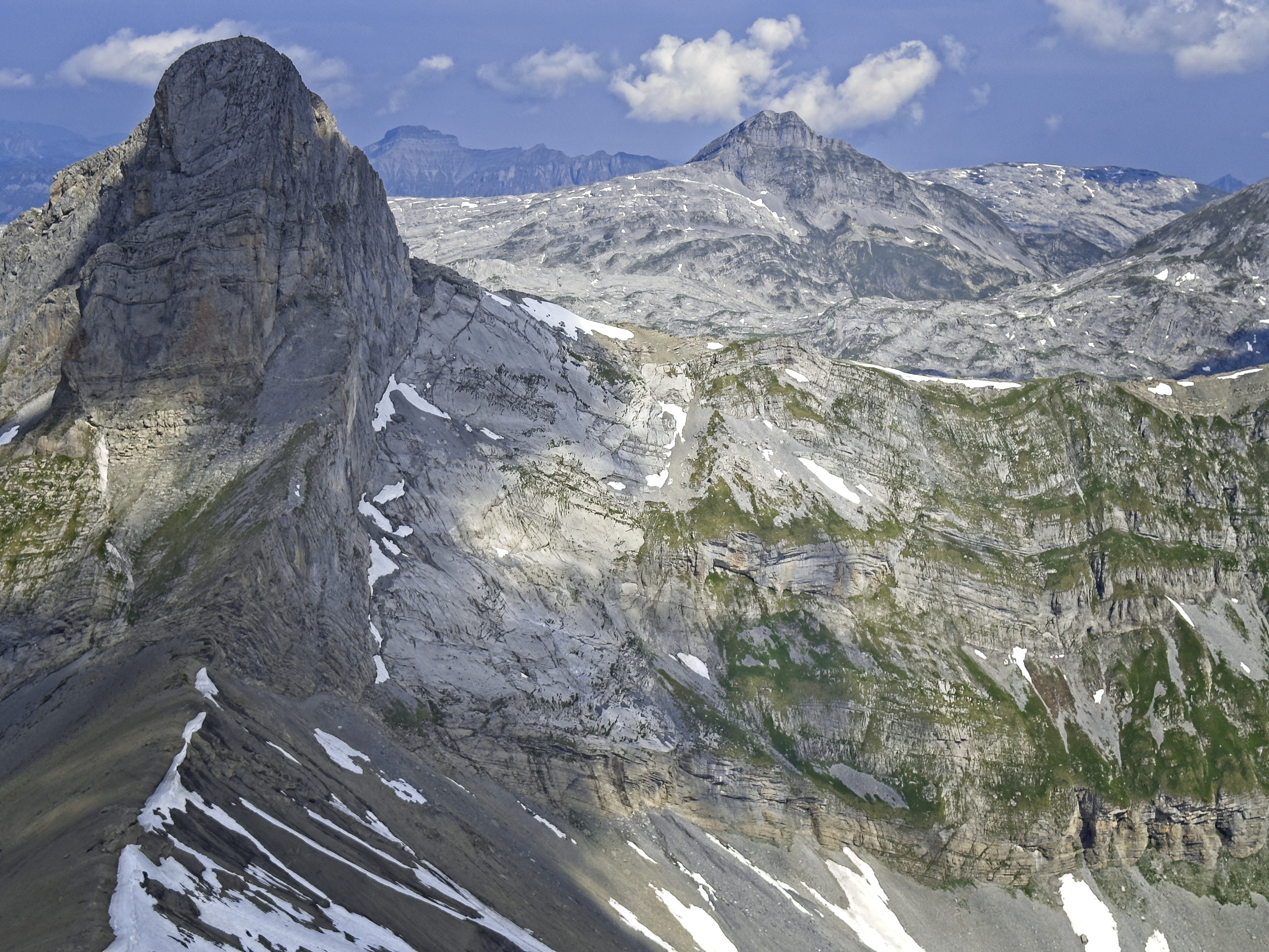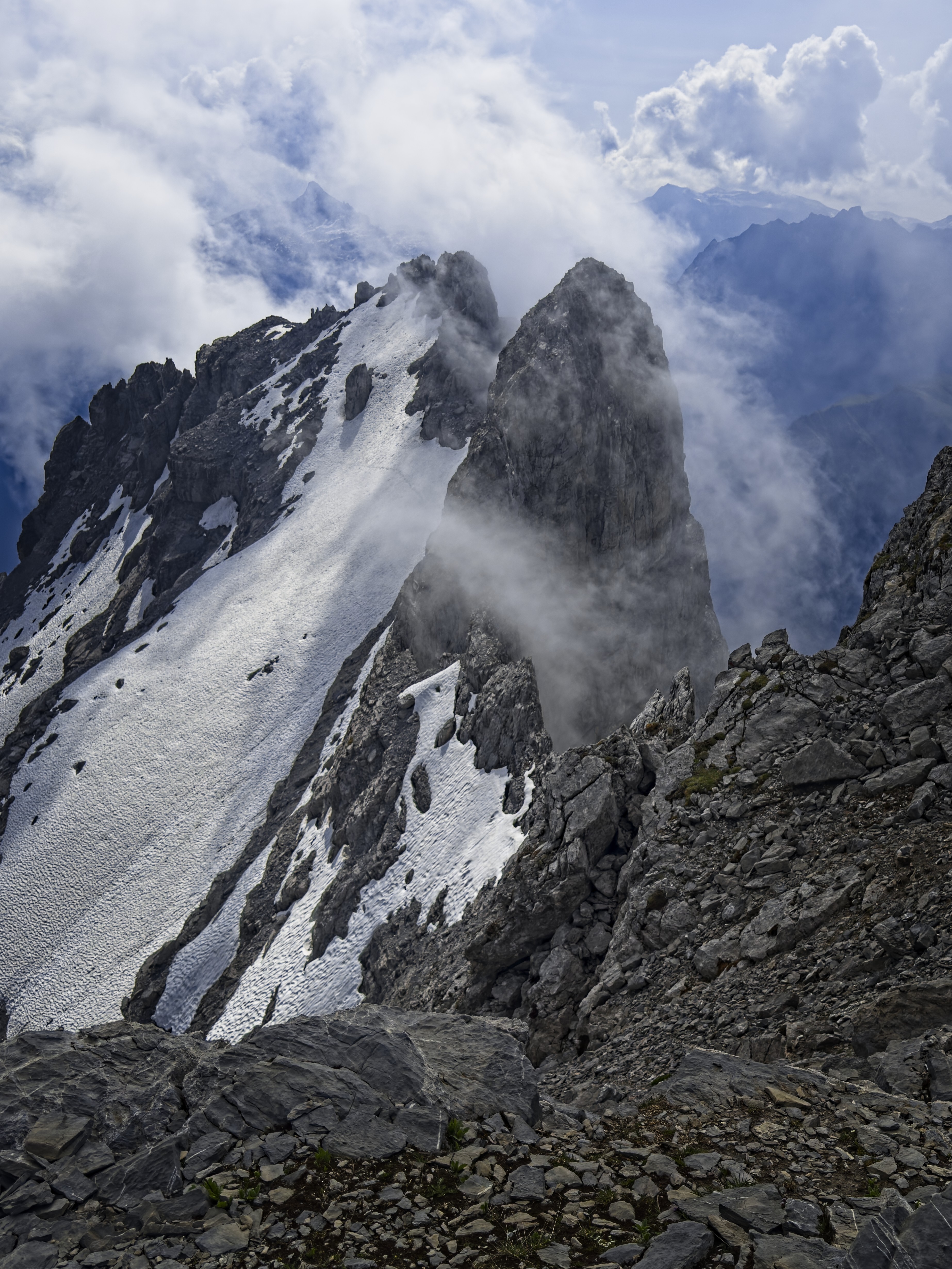 From this summit, the Ortstock off to the south is very impressive. I borrowed some binoculars from some Italian guys, and tried to determine if there were steps kicked into the snowfield which gains the northwest ridge of that peak. I couldn't tell. It looked steep and snowy. But if I could reach the Furggele Pass, then the last 300 meters to the summit along the ridge looked to be clear.