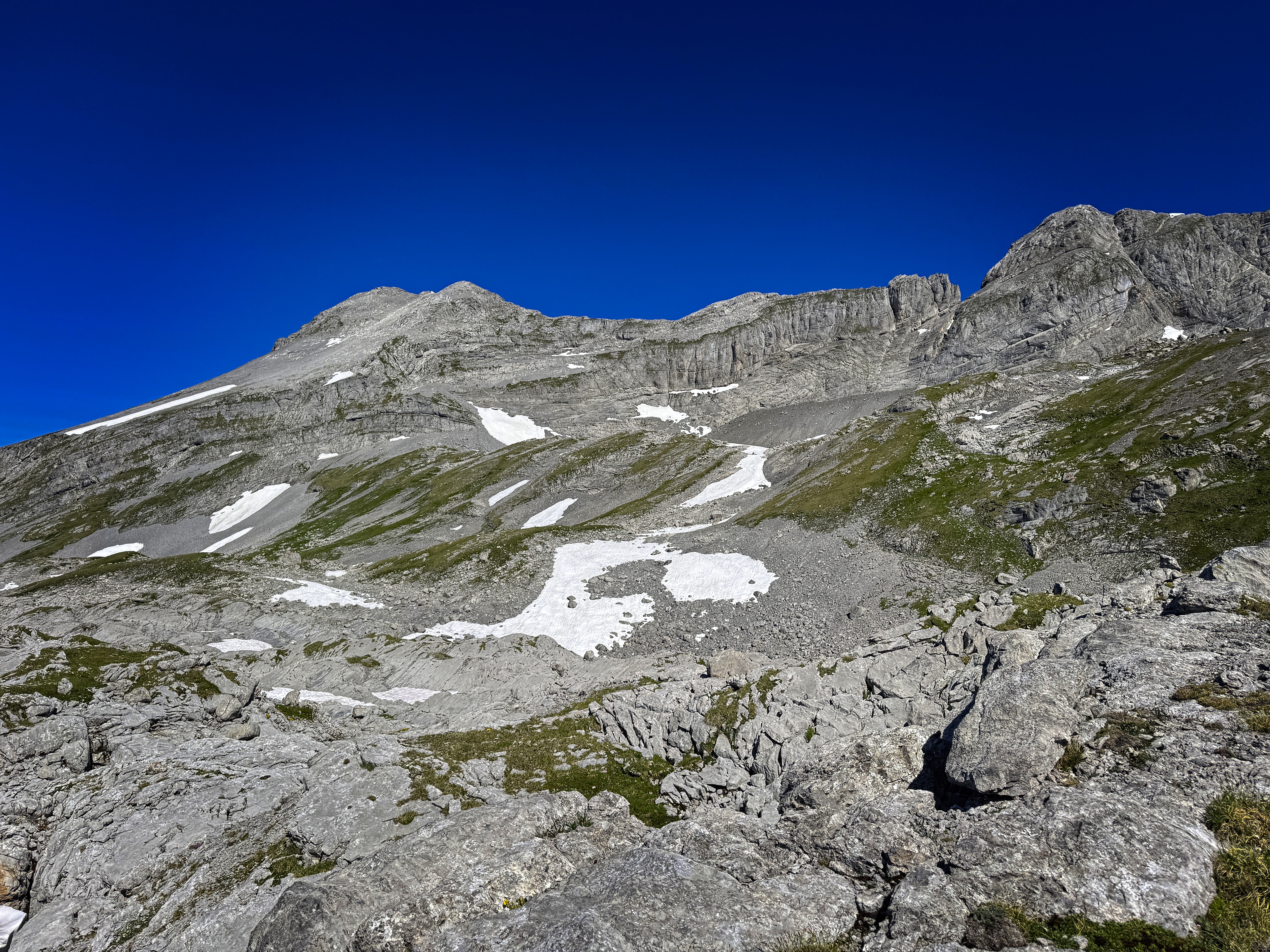 Todays plan was to climb Grisset. Again, I started early. This time I had breakfast at the Gumen lift station, then traversed over. At Ober Boden I started traveling a little north of west over heather and boulderfields with slight descends on a generally ascending line. Eventually snowfields made it easier, and I was standing on the final moraine above an old glacier between Grisset and Bös Fulen.