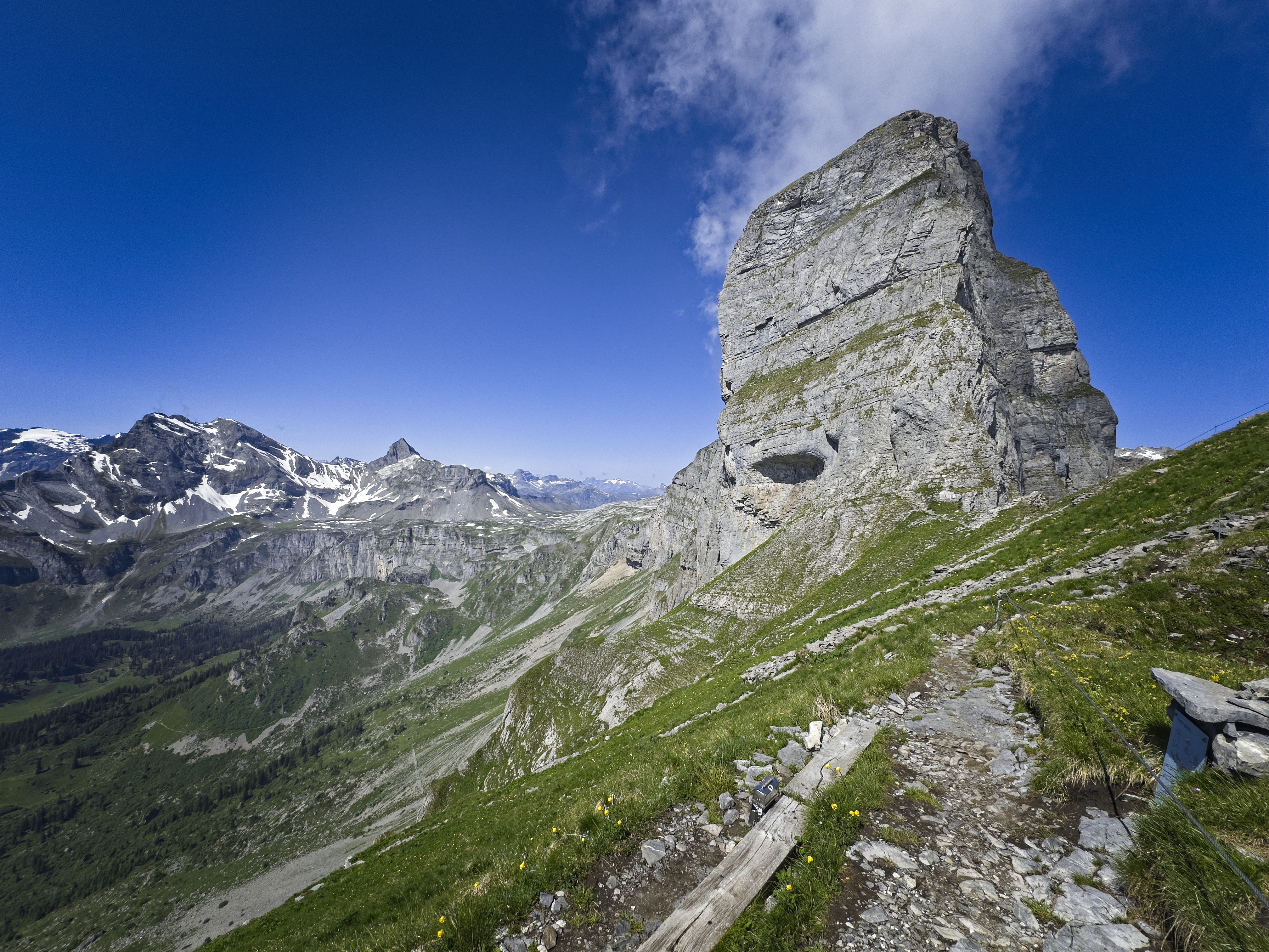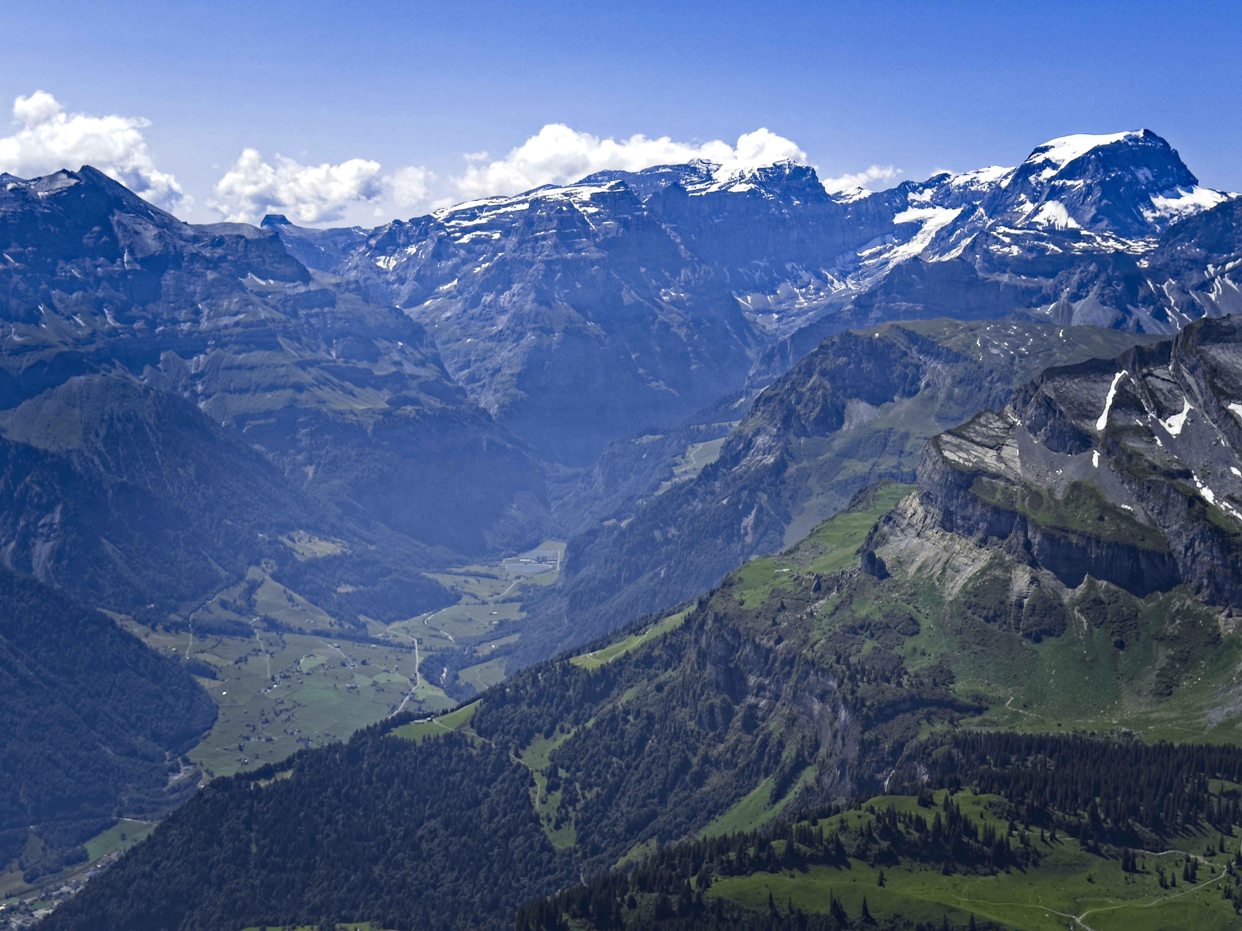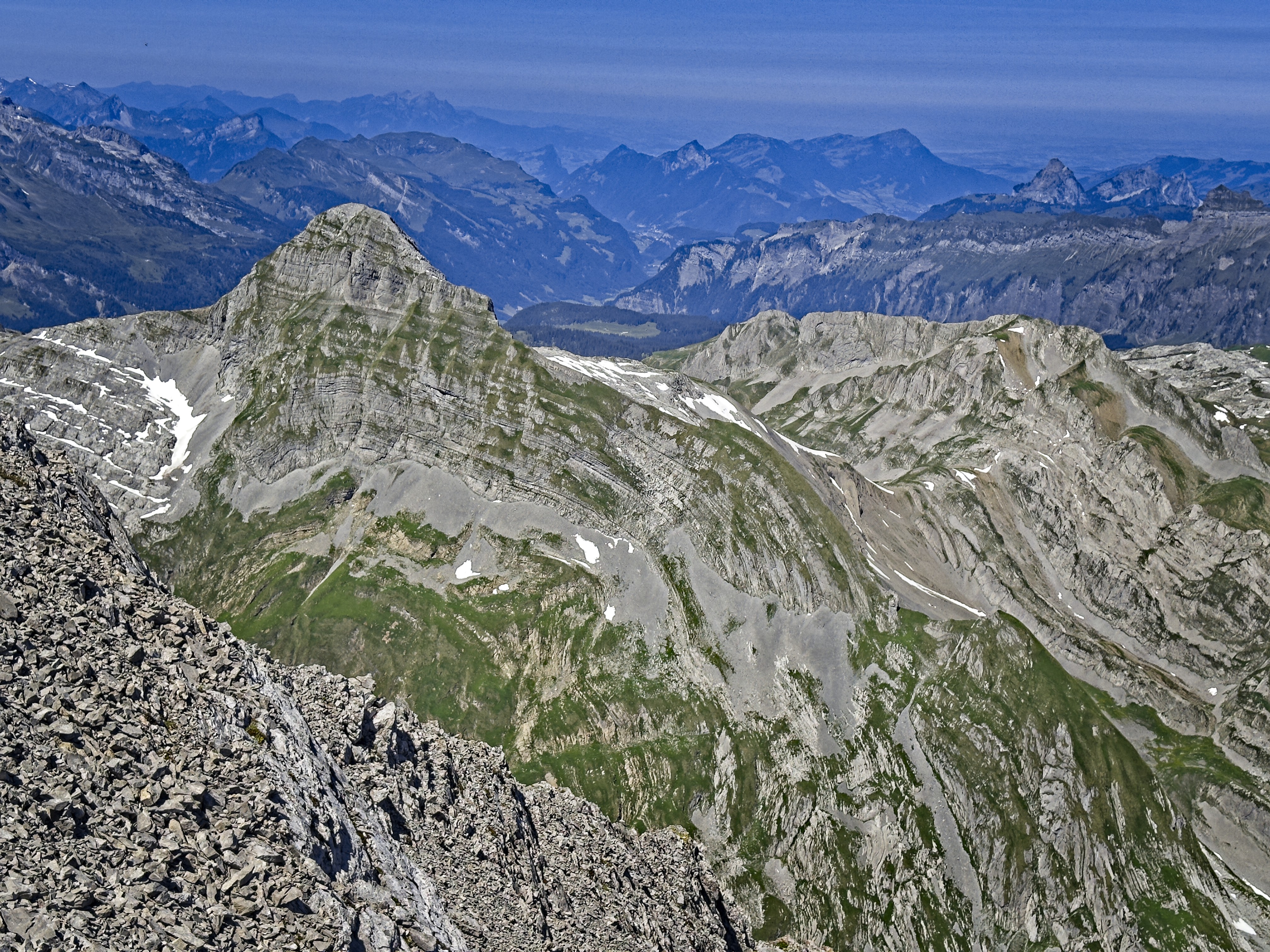 Now the way was clear to the summit, although steep. Soon I stood on top admiring the views to Tödi and other mountains of the Klausenpass region. On the way down, a woman was trying to get her big white fluffy dog to climb a rock wall which had a chain for assistance. I got under the dog and tried to lift him up but he was certain he didn't want to do it!