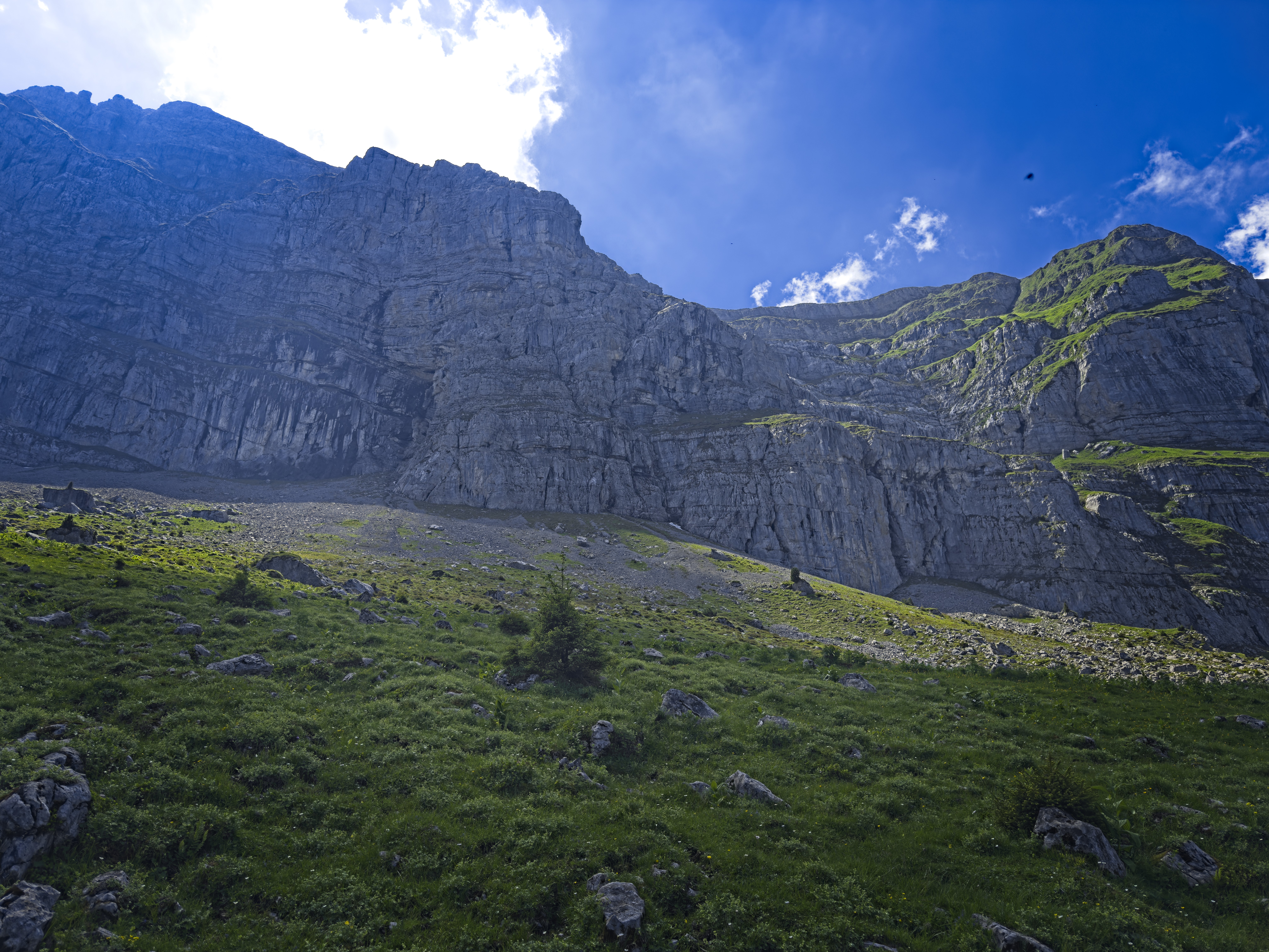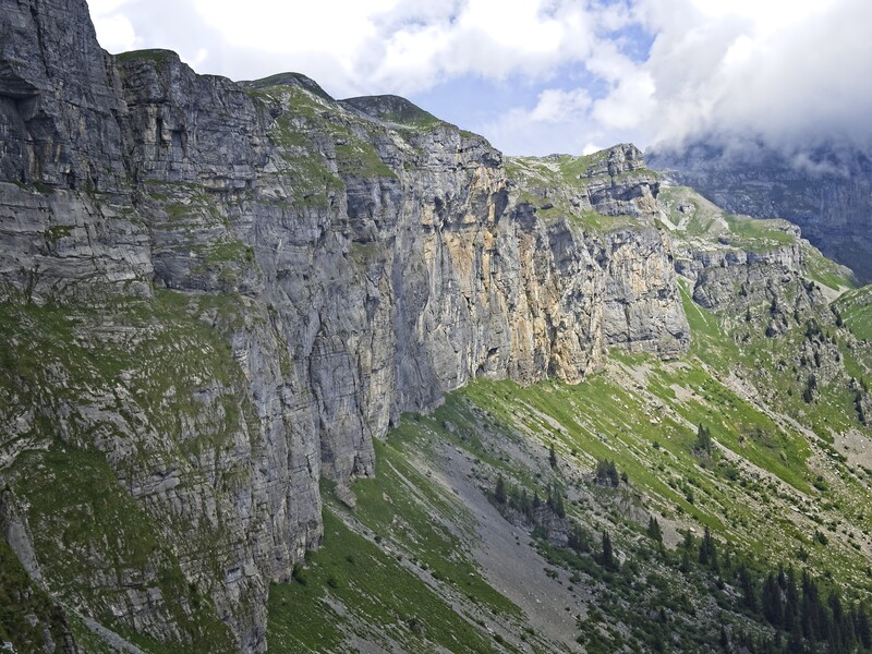 After sleeping in Mantra nearby, I decided to scramble up a peak I could see from the parking lot called Rautispitz via a route called the Troosweg. I only got a few minutes of trail, then it was scrambling up a gully on latschen game trails and scree slopes. Then a long traverse to the base of the wall.