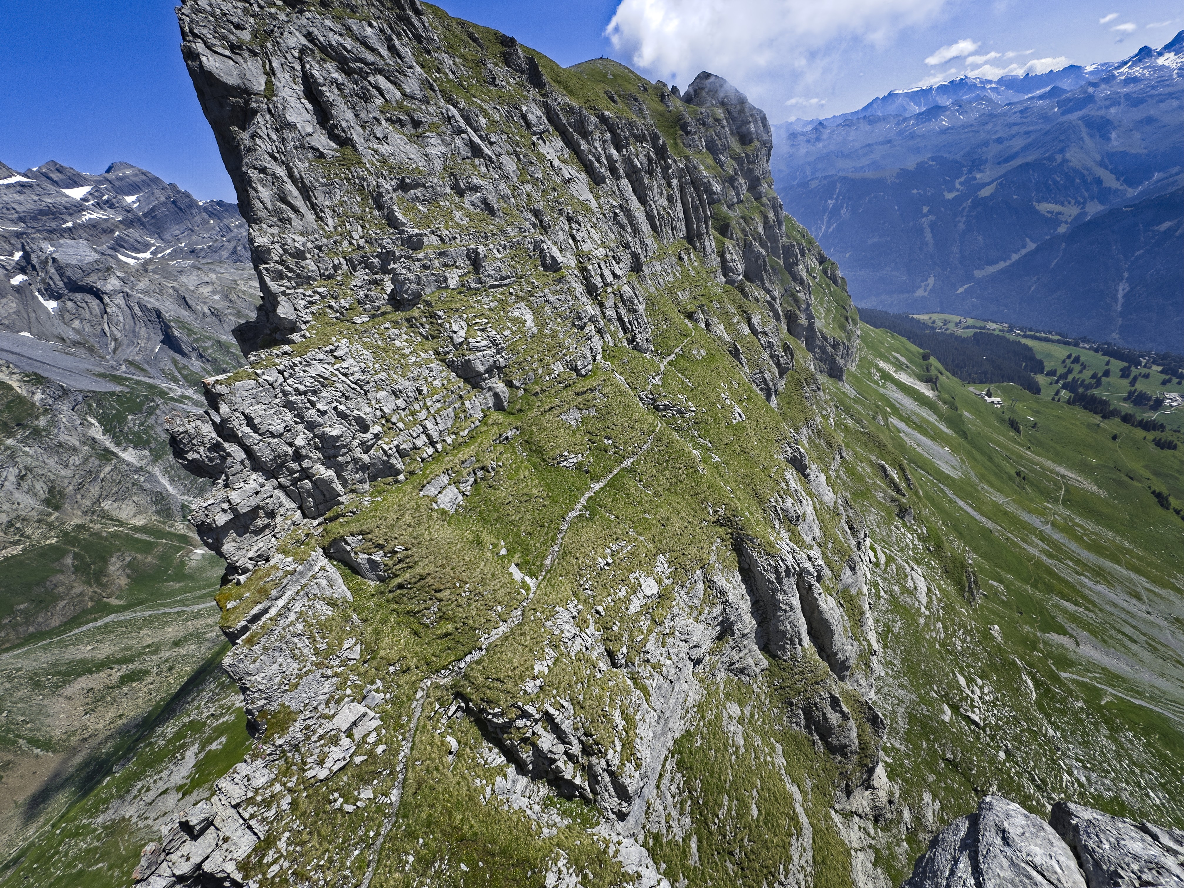 I wanted to do the Braunwalder Klettersteig today. I was walking at 9, which is actually too late in the heat. I resolved to skip breakfast the next two days so I could gain elevation in the cool morning. Working my way up, I reached the Gumen lift station, bought an Iced Tea drink, then walked up to the klettersteig at the east ridge of the Eggstock summits. There were a few people on the route, but not many despite the good weather. I started up, enjoying the pleasant climbing. I'd decided to climb the easier route right on the ridge because it seemed more scenic than the harder one, buried off in a corner on the south side of the ridge.