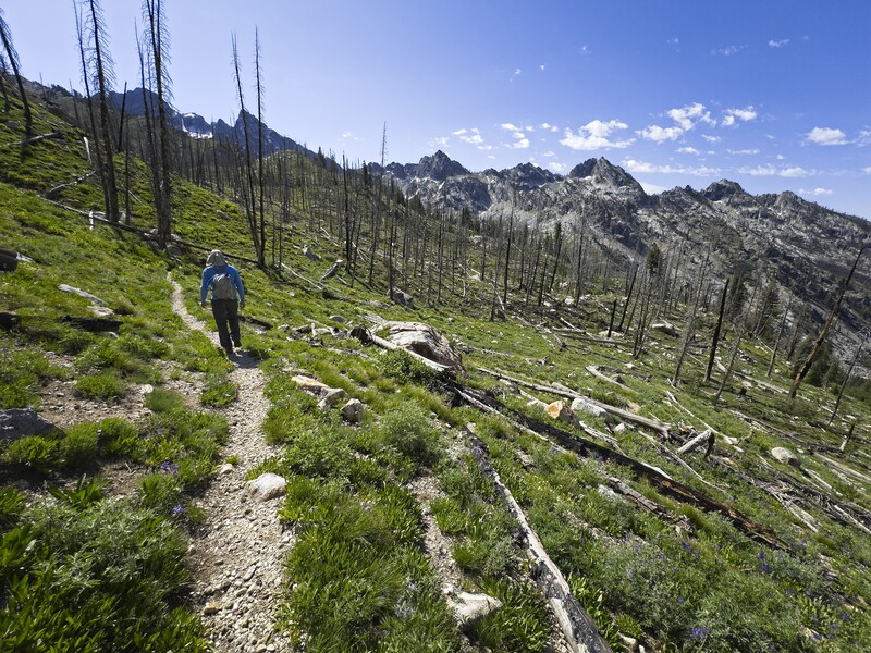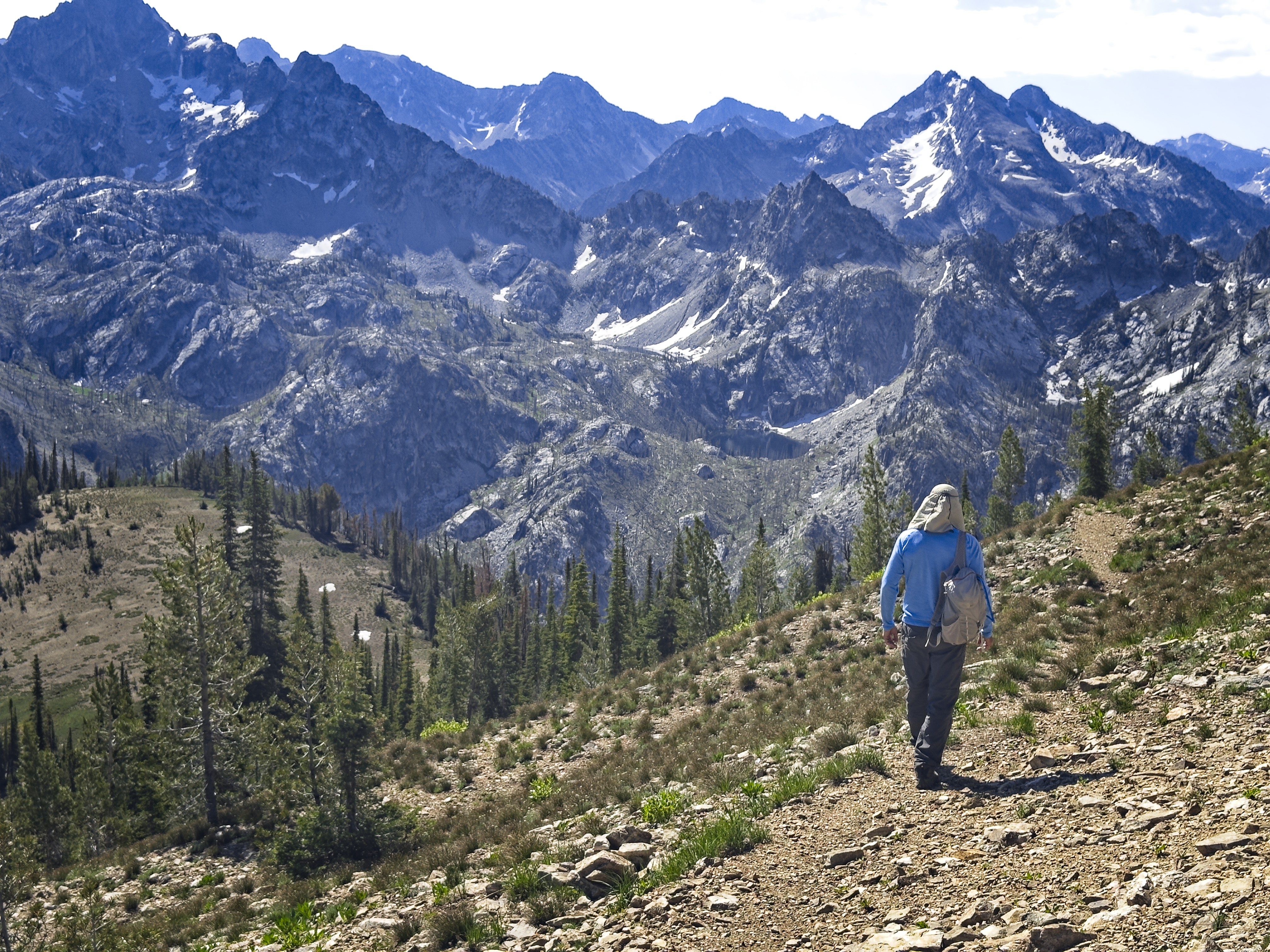 For our first hike in the Sawtooths, Steve and I chose Observation Peak, reachable by good trail from the Grandjean Campground. We loved the alpine country, though we were surprised how often we had to cross the river! I think we made it up on logs, but on the way down we just waded across the river at one point, since one of the crossings had been sketchy.