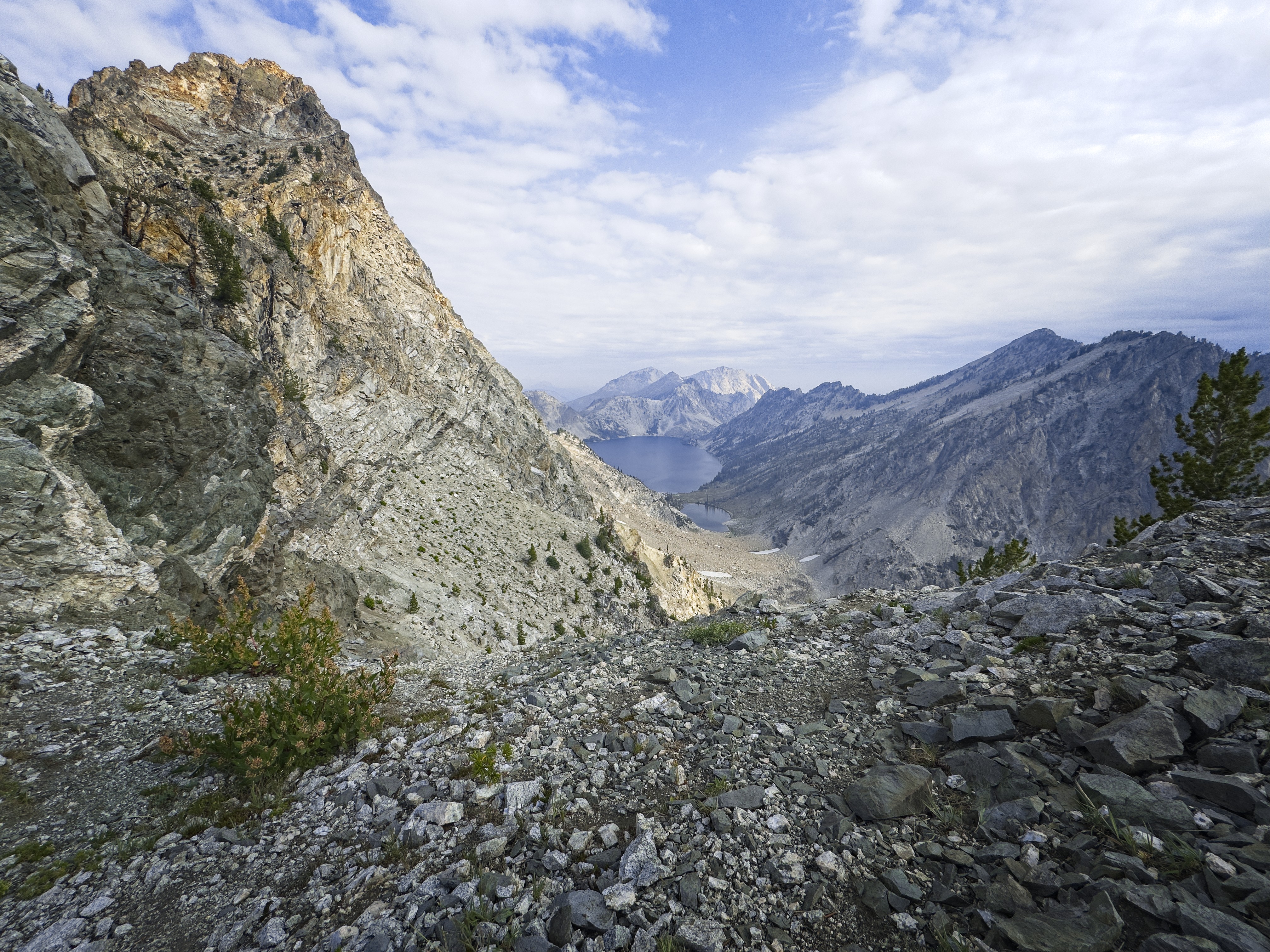 We started hiking from the Iron Creek Trailhead at 6 am, slightly dismayed by clouds in the sky. Within an hour, we could smell smoke, and noted a brown haze in the air with some alarm. As we approached Sawtooth Lake, some backpackers coming out told us the smoke was a surprise to them as well. Oh well, we thought we'd just continue until something stops us.