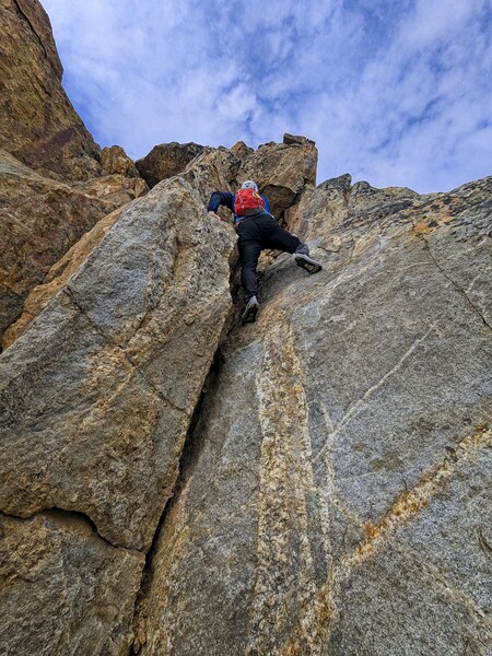 This worked out well. Now we could hike steep terrain on or just left of the crest for several hundred feet. Higher, we rounded a rocky buttress on the left, seeing occasional faint signs of passage or use. Another 20 minutes or so brought us to a point below the final headwall to the summit. We'd read that we should follow a ledge around the right side of this for up to 50 feet, then turn up. Indeed, we found the ledge, and after checking out a few options, we picked a likely spot to head up.