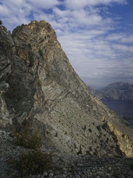 At the lake, Steve took off, having earned a fitness bonus over the last week with Ever in Tahoe. We met again below lake 8271, where we crossed the stream and started contouring up the hill to round the lower cliffs of the Southeast Ridge, here presenting as a rocky buttress. After a few minutes of this, we found an opening -- a broad gully less steep than surrounding cliffs. We started up here, using our hands occasionally and following our noses up and somewhat left to what appeared to be the ridge crest.