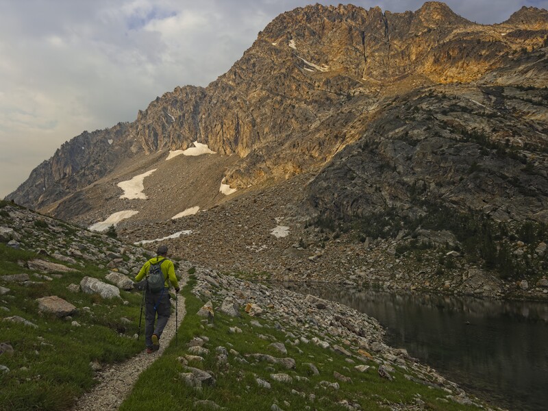 Steve approaches Sawtooth Lake, with Mount Regan behind