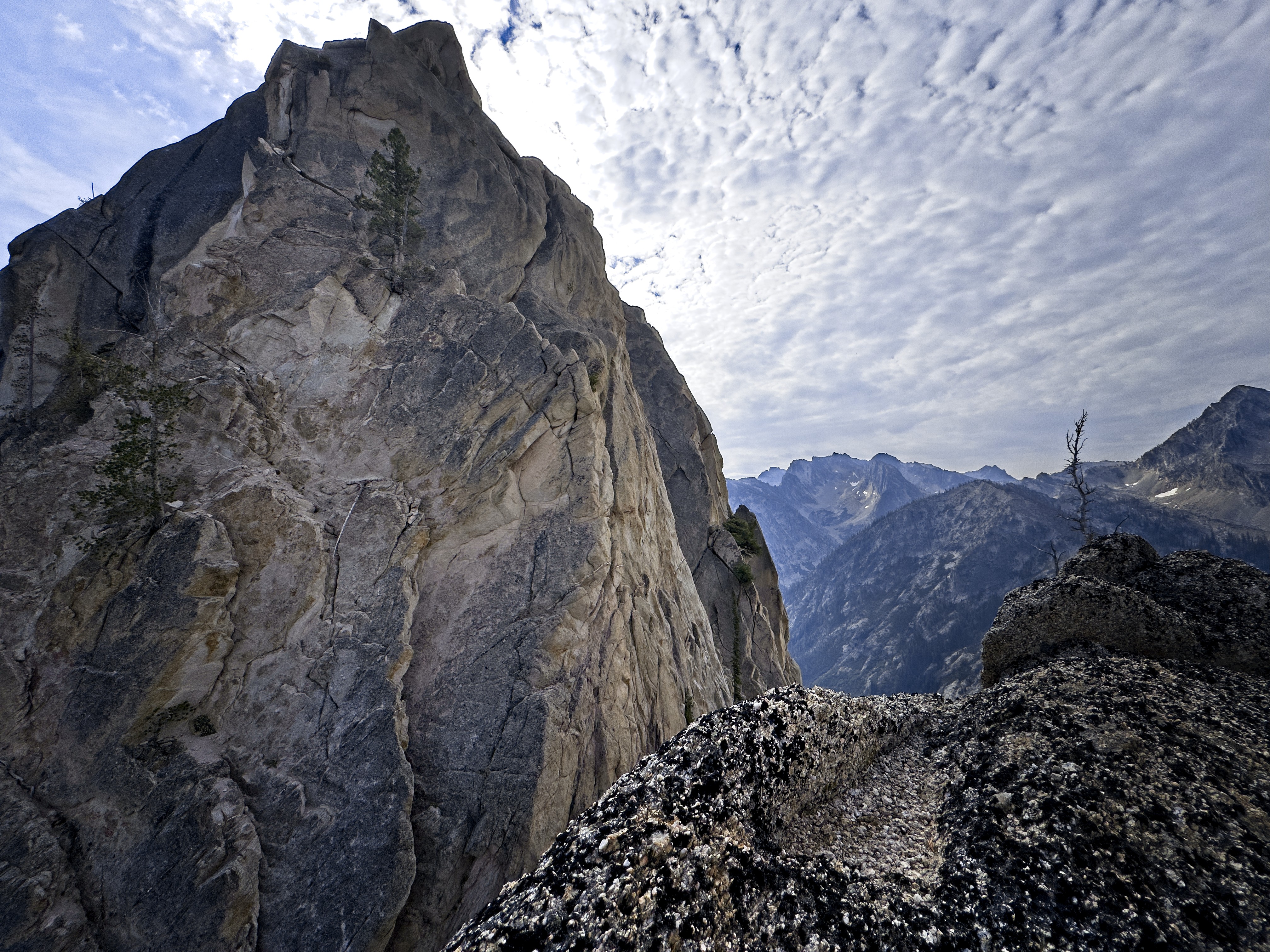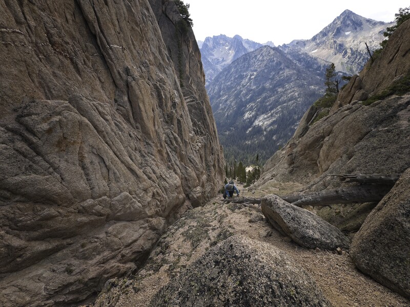 Steve and I explored a rocky gully on the north side of Iron Creek on the approach to Sawtooth Lake. We hoped to establish a new route on one of the towers of the striking, light-colored granite rock. Although we attained the ridge crest, we left the summits untouched. The rock was too friable to place protection in, unfortunately. Any attempt at climbing it would break off an outer later. The rock could be sculpted with your hands!