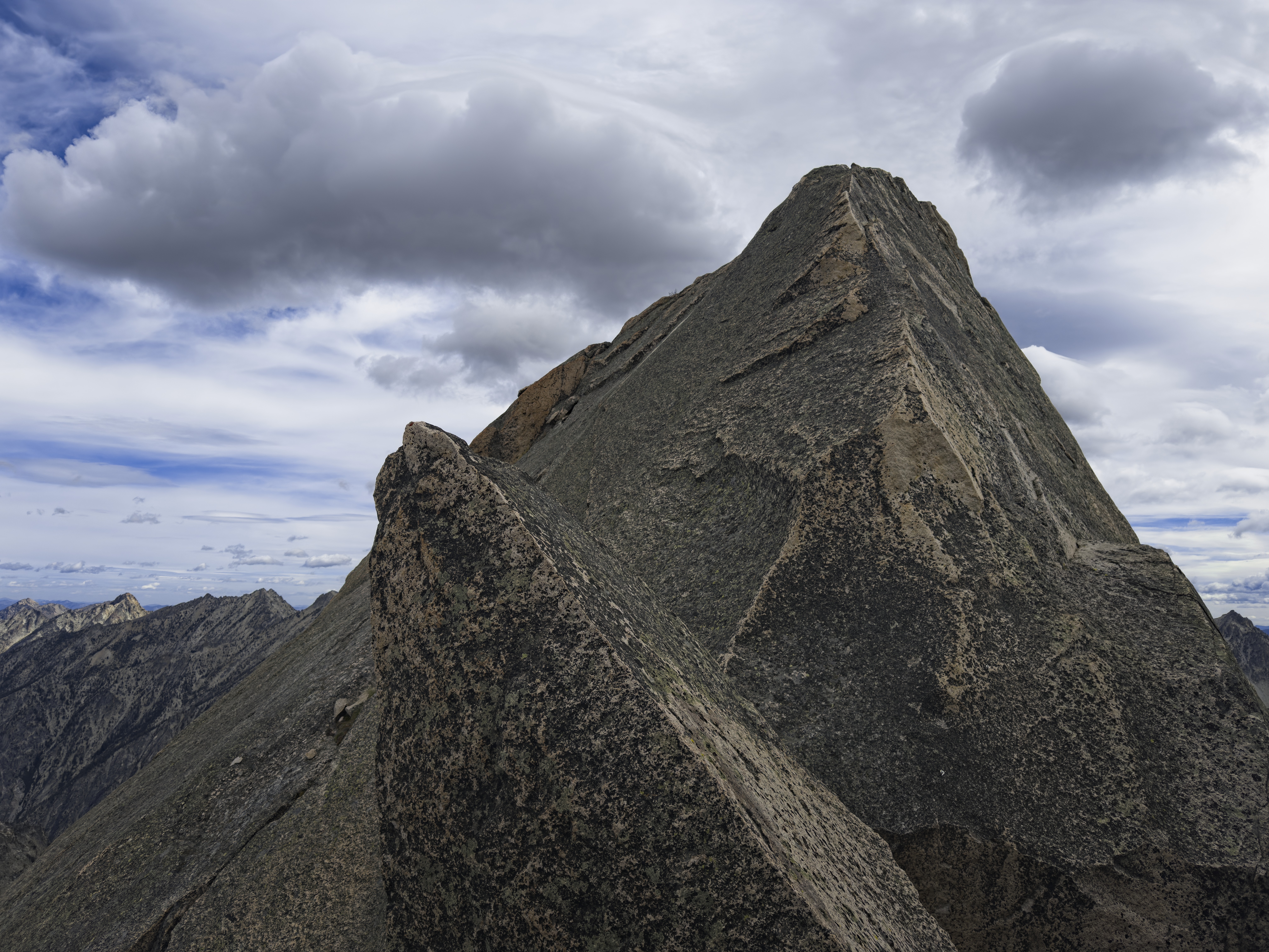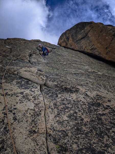 I could see the final pitch to the summit as I belayed Steve up in the strong wind and blowing clouds. We knew that an earthquake in 2020 had disturbed the final pitch, but we had information about a bypass. However, the wind was worrying us. We thought it might storm. The bypass involved slab climbing directly over a cliff-edge with no protection. And then, we'd also have to rappel from the summit directly down the ridge, which seemed a bit sketchy in the wind. Plus, I was very cold.