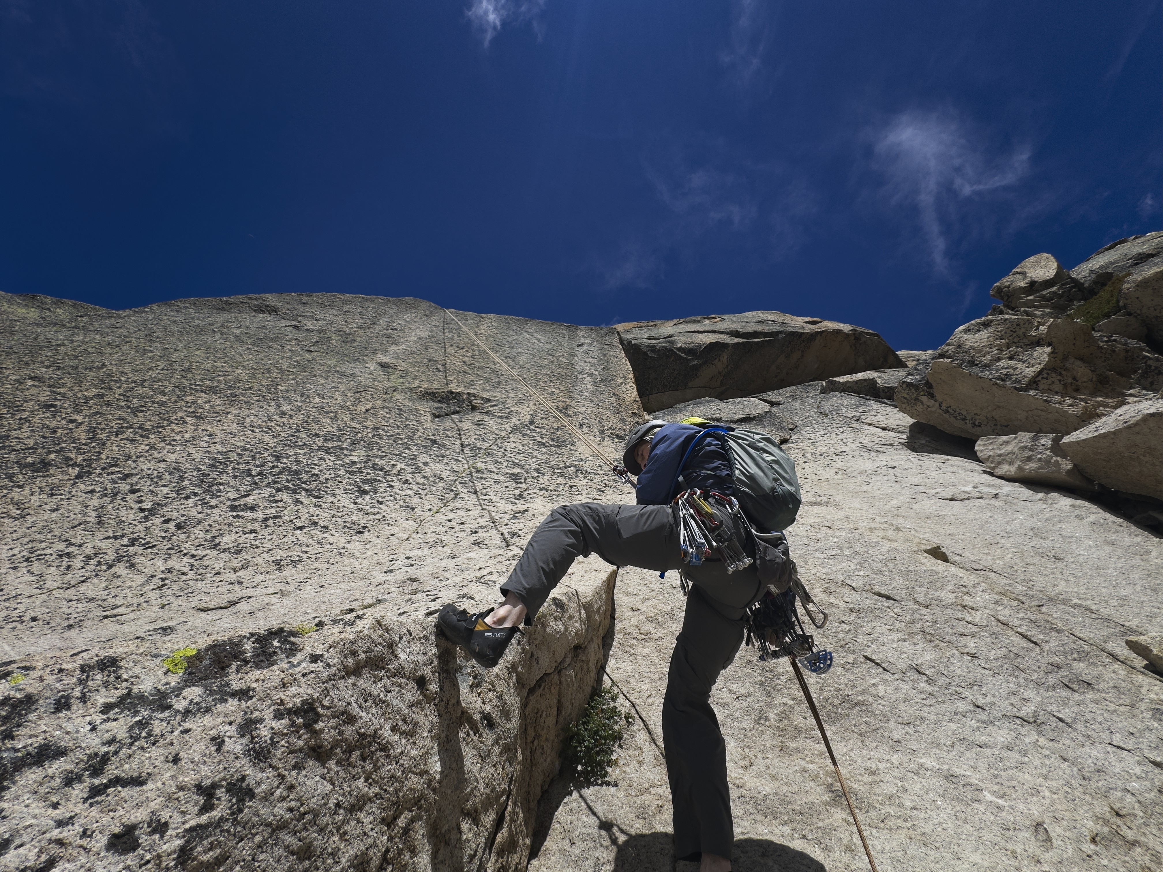 Steve set off for this last pitch, peeking gingerly around a great block to the unprotected face traverse he'd have to make for ~8 meters until reaching the single crack on the whole summit block where he could place some gear. He mentioned the bolt above his head and out of reach, formerly part of the final pitch before the earthquake destroyed a block necessary to reach it. Steve started out, invisible to me behind the great block...then the rope went slack as he came back somewhat more rapidly (I belayed him in). He came around the corner and said "no way."