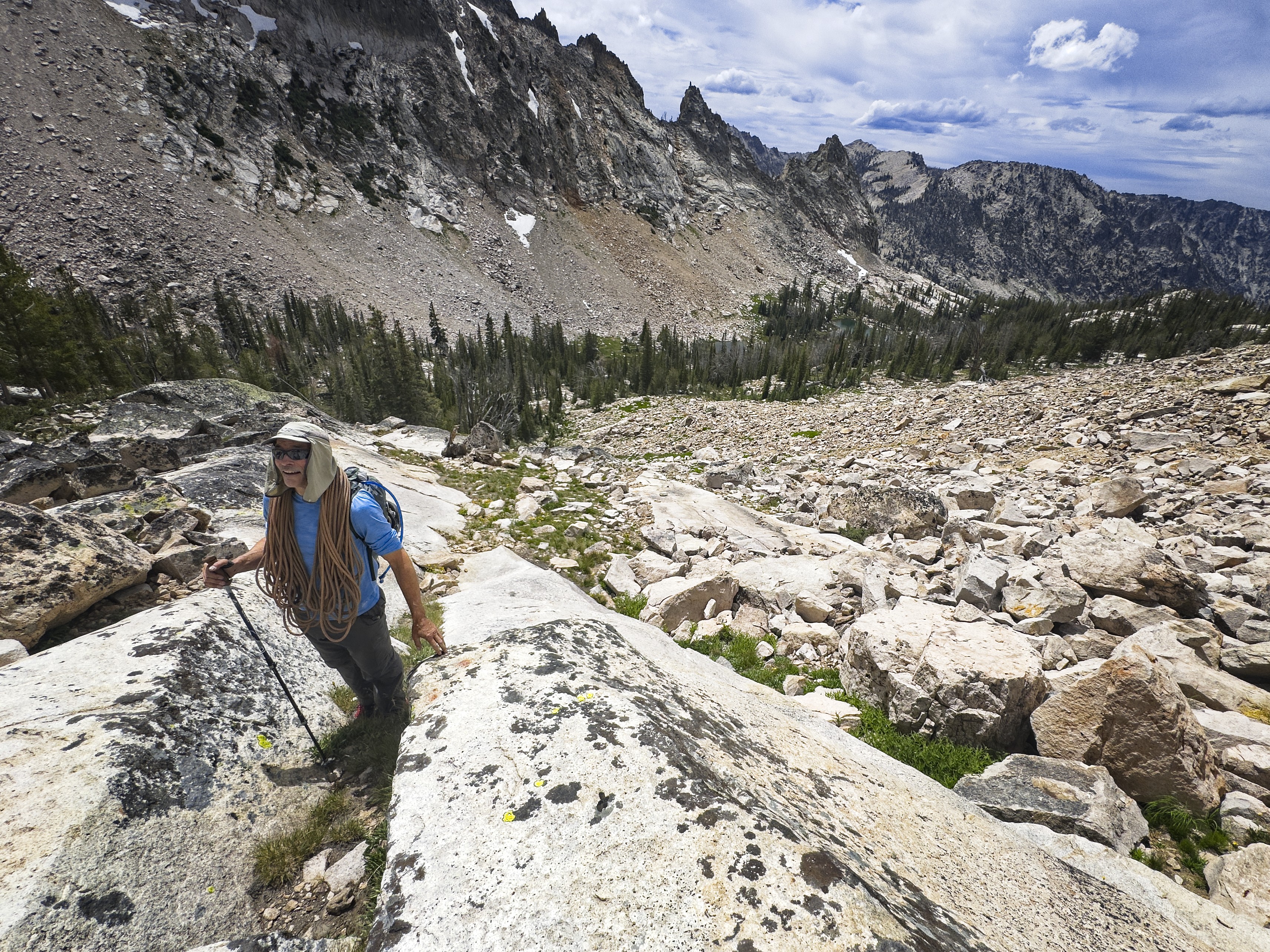 What an adventure...not the most satisfying climbing, and it was frustrating to be denied the summit. However, as we reversed our approach route, we took joy in finding the best way down, then across and above the lakes. Then to the first and second passes, and finally down to Alpine Lake. Always with care, and lots of discussion about the best way. In the end, this is my favorite thing about Warbonnet Peak -- the overall off-trail adventure and route-finding challenge.