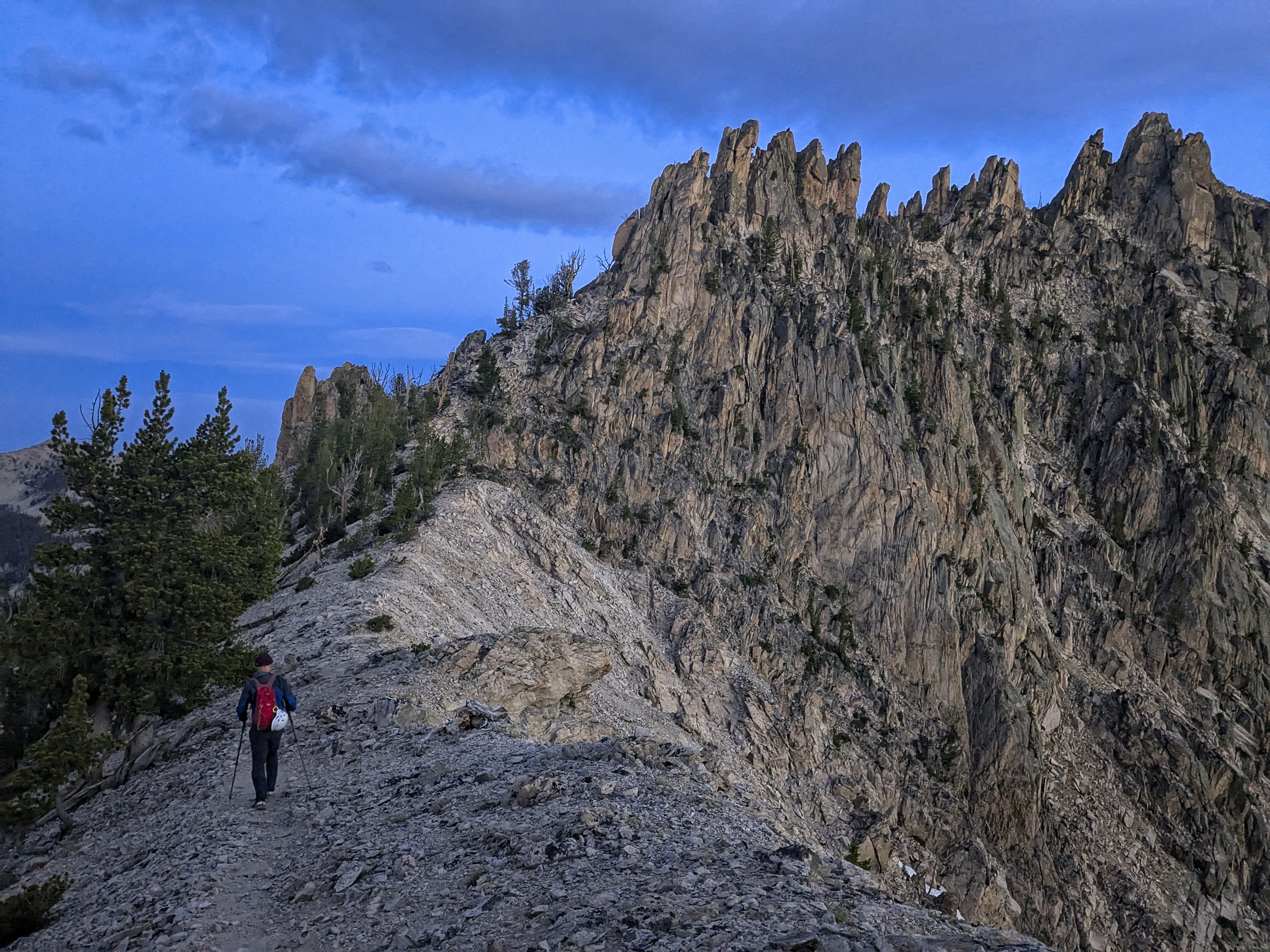 We were walking at 5 am, easily navigating the climbers trail and traversing the hillside in the darkness. We were aided by one piece of advice to gain the high pass -- we should stay left, rather than aiming for the lowest point of the pass as seen from below. This was a good idea. It allowed us to discover a climber's trail (again), and deposited us on the Northwest Face of Old Monte Verita (aka Peak 9769) exactly where a climbers trail traverses the scree/boulderfields. This trail was extremely helpful. It would have been much harder without it, so it's worth searching and finding it!