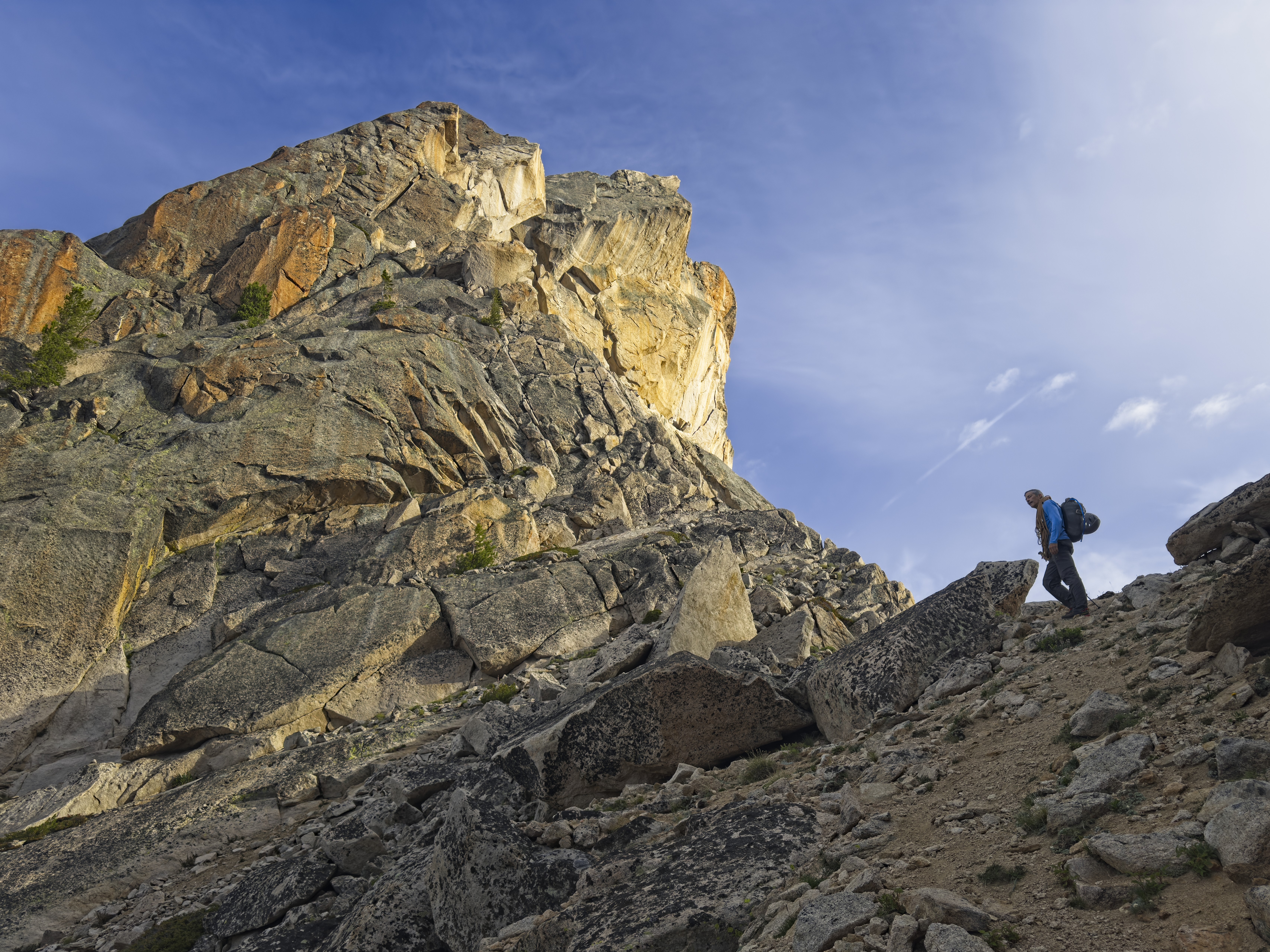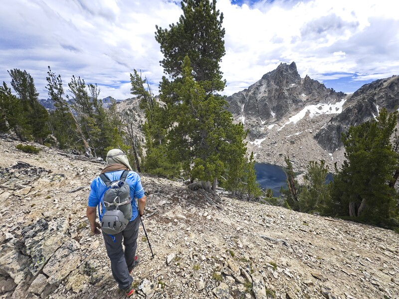 Michael on the ridgetop, about to drop down to a bench above the Warbonnet Lakes