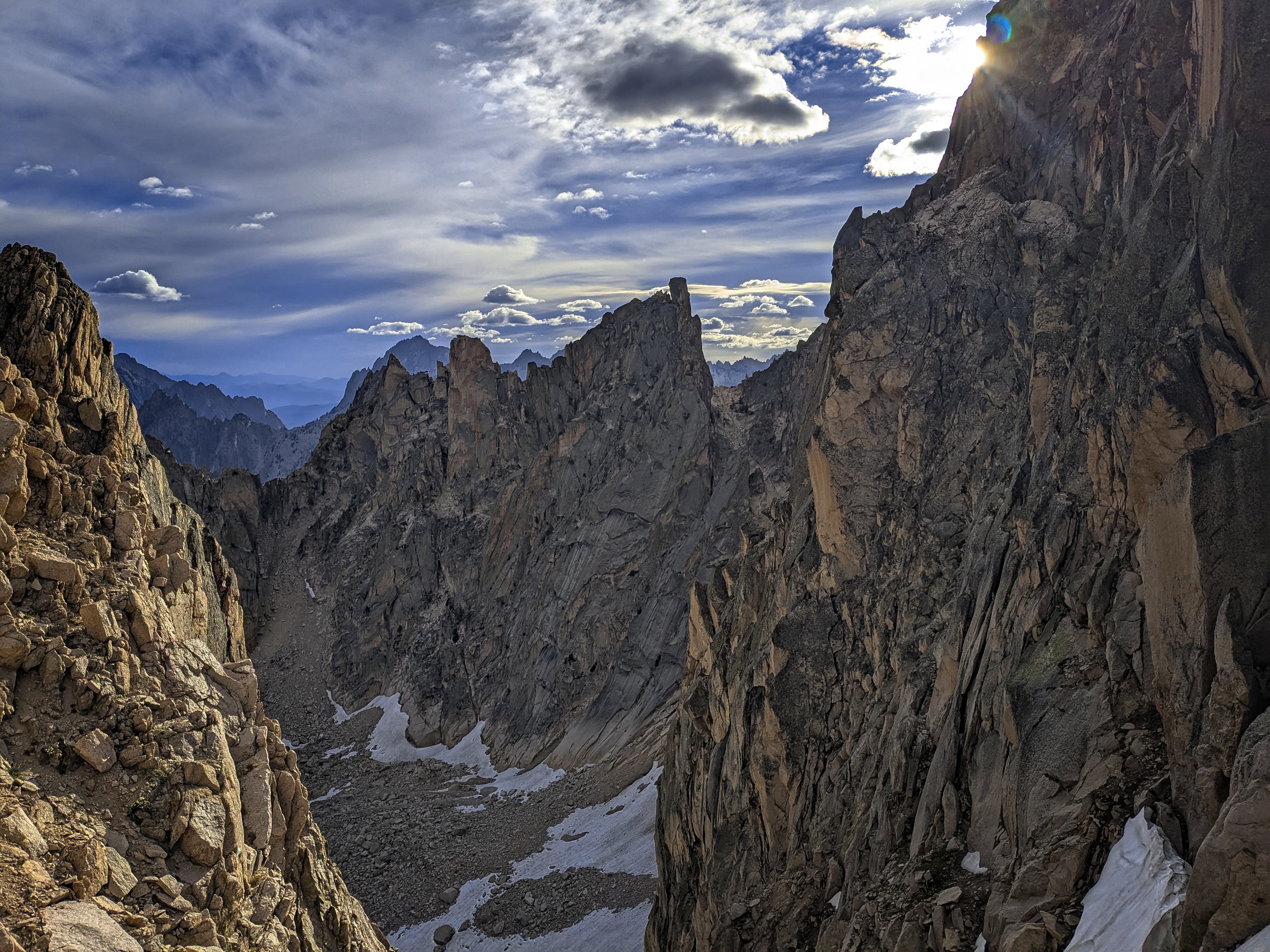 Many folks carry over and camp at Warbonnet Lake, or the Feather Lakes or the Bead Lakes right under Warbonnet Peak. But we'd heard that the long approach was rough, so we decided instead to stop at Alpine Lake and make a bigger day for ourselves on climb day. All we had to do was navigate that approach in the dawn, do the climb and make it back to our tents here at Alpine Lake. Bit of a gamble for conservative older folks like us, but we thought our systems were fairly dialed on the technical stuff, so even if we are slow on the approach and descent, we should have enough time.