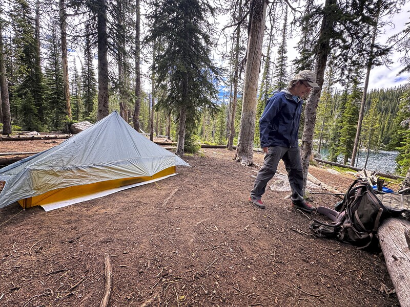 We hiked in to Alpine Lake, and set up our camp. We were becoming old hands at this Sawtooth routine! Before settling in for an afternoon of napping and reading (Steve had a crossword puzzle to do), we hiked further up the trail to explore the start of the climbers trail which led up to a pass on a shoulder of Old Monte Verita. We followed it until the trail petered out after about 10 minutes. But we saw the line of it, and were sure we could find it in the dark.