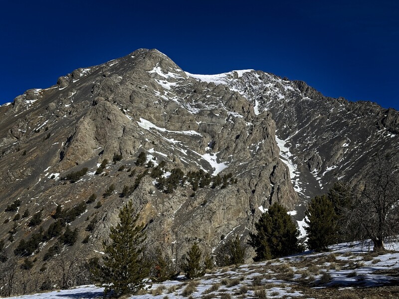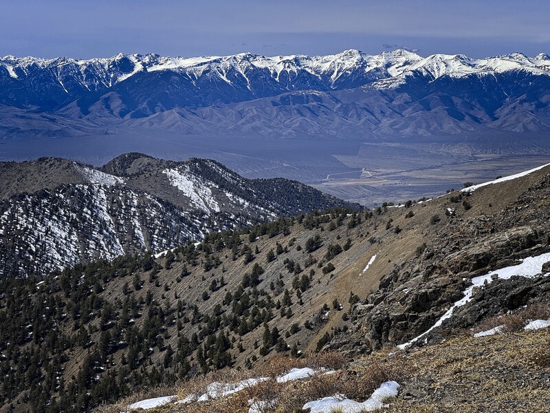 Leaving my tennis shoes and a water bottle, I continued up-canyon in boots for about 1/2 a mile, then picked a likely point to head up. Footing was tricky on the steep slope, and the mud was still frozen. Firm snow-patches were preferred for climbing. About 300 feet up, the forest had burned, so the trees were sparser, and I was beginning to get some views. Gradually, the slope curved into a broad ridge, which I followed to get my first views of the summit, which looked quite far away, across a valley on my left. My ridge would keep rising and curve around to become the Southeast Ridge to the summit.
