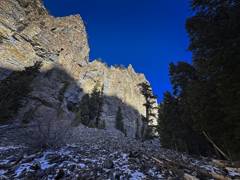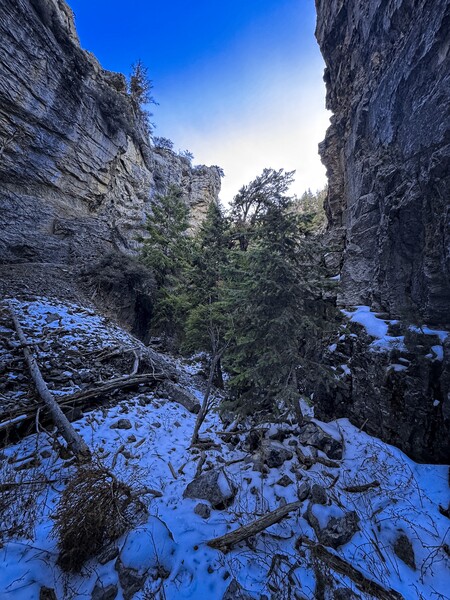 Well, gee, that sounds fun! A few weeks before I'd hiked a few hours back into Middle Canyon, but I was tired from a climb the day before and didn't have any snow gear. This is a beautiful hike. Now that I've covered the ground of it four times, I like it even more. Miles of high walls, where each time you look up you spy a different little cave or interesting ledge system than you've seen before.