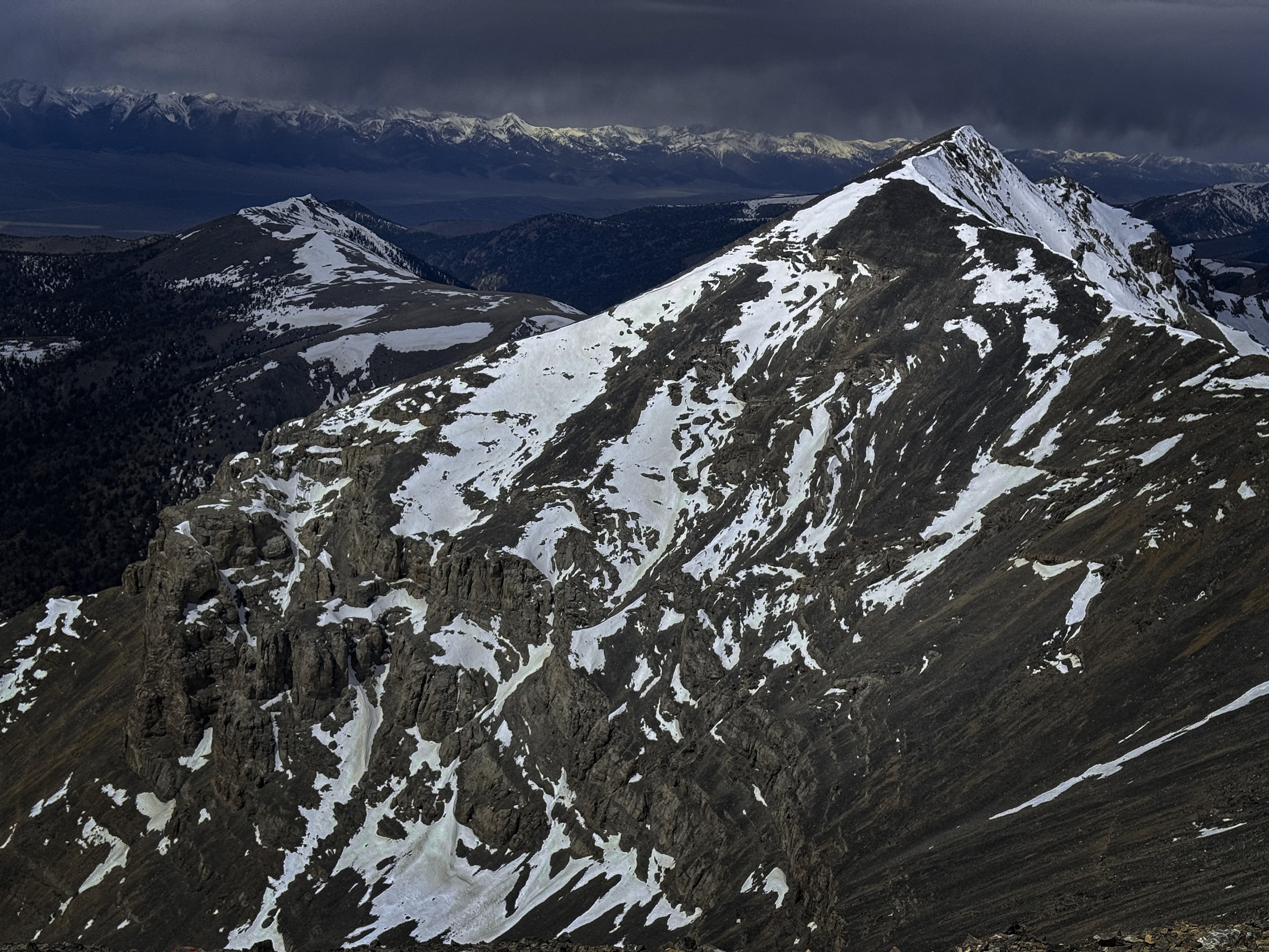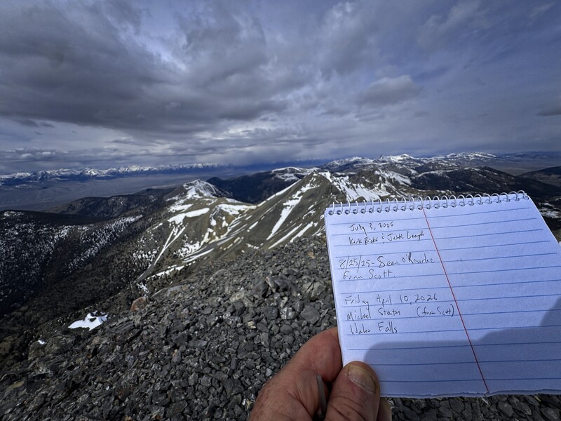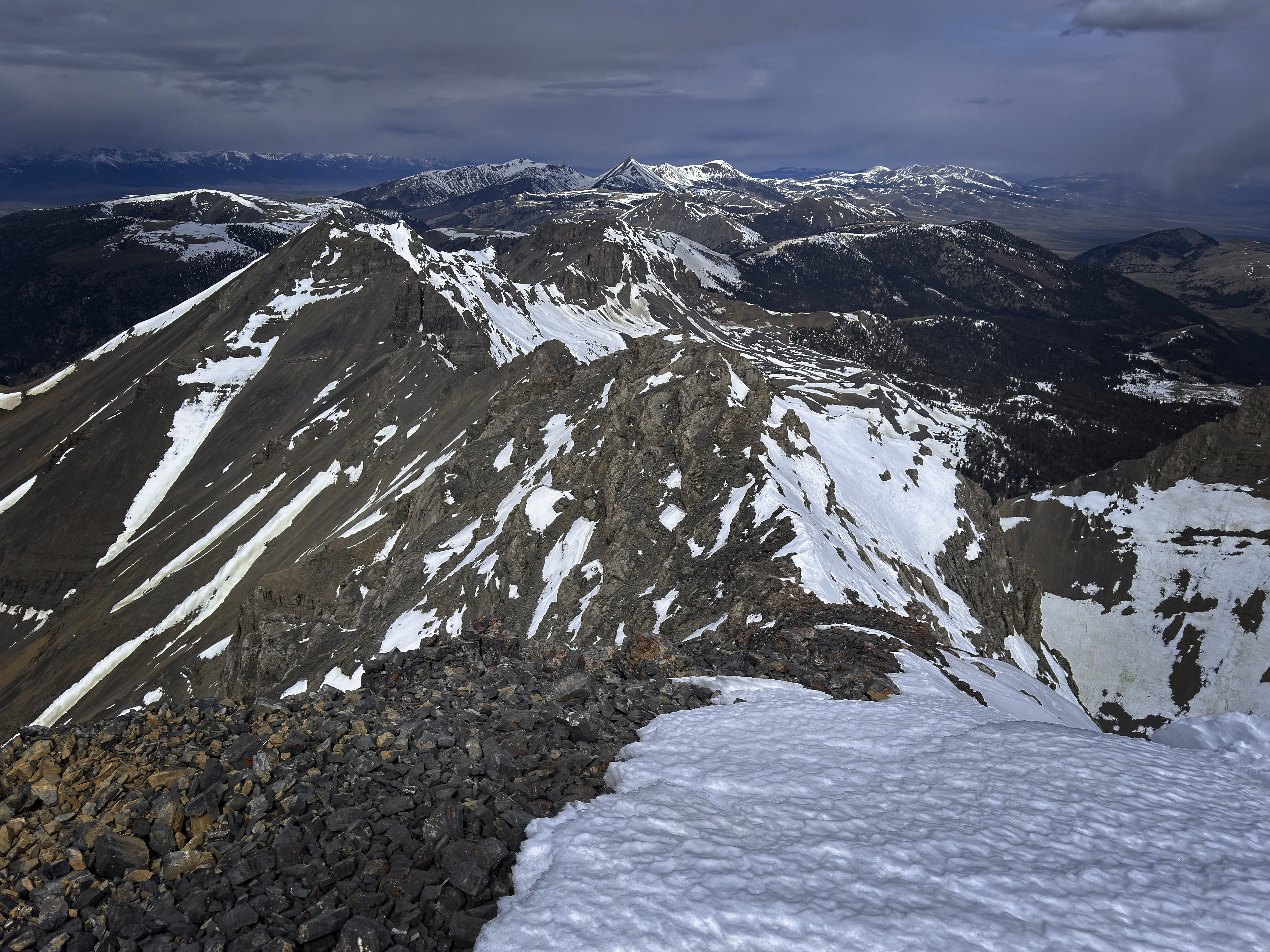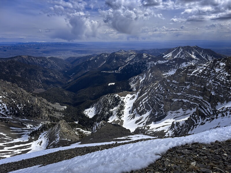 Rather suddenly, it seemed, I was at the ridge crest. I turned left and marched to the summit on snow and rock. I was the first to sign the register since last year. Being careful of the cornice, I could look down east into the Webber Creek valley. I could also see the weather coming in from the West. Diamond Peak looked amazing, though clouds were beginning to cover it. It seemed I should have just enough time to visit Huhs Horn and come back.