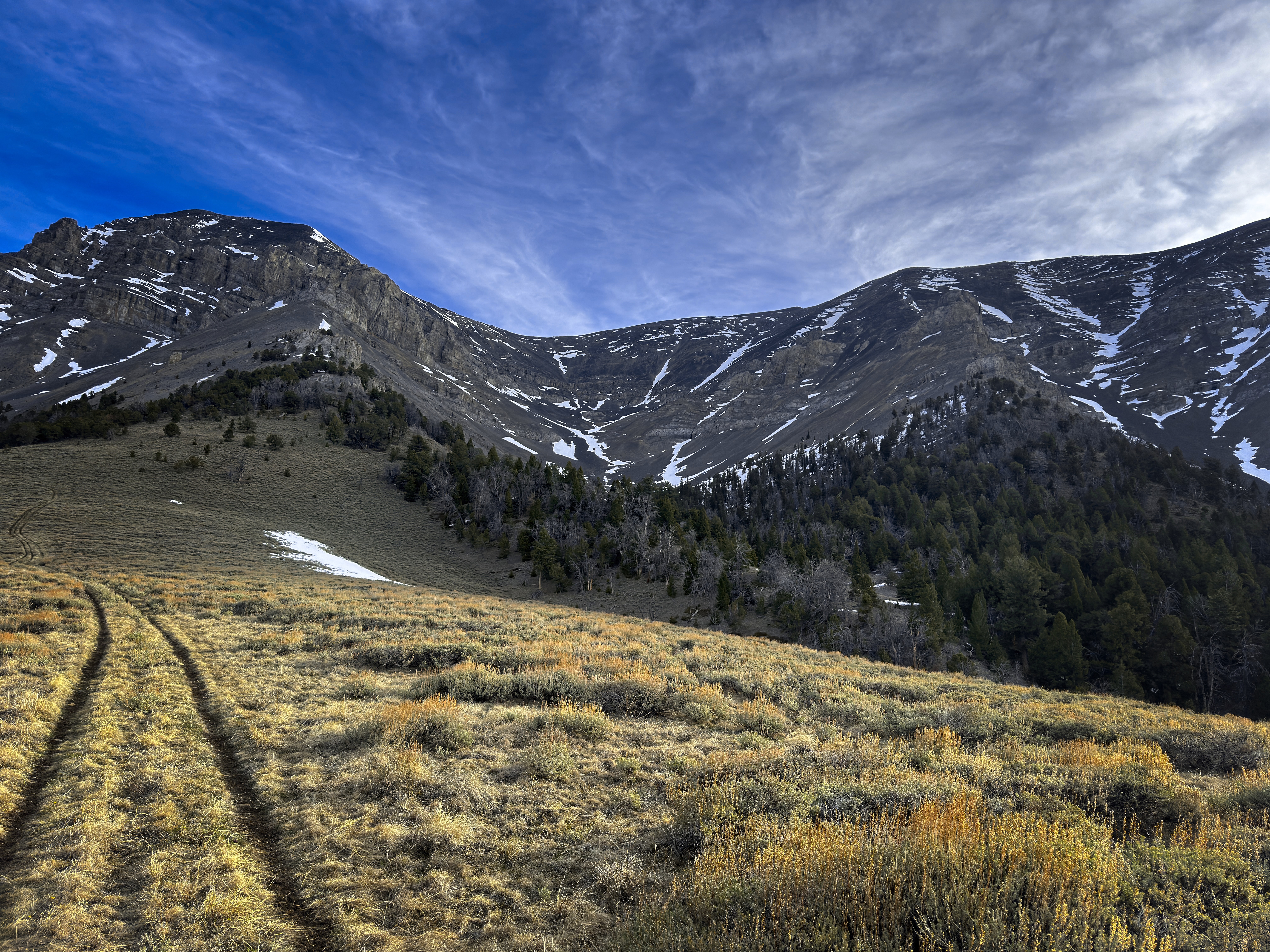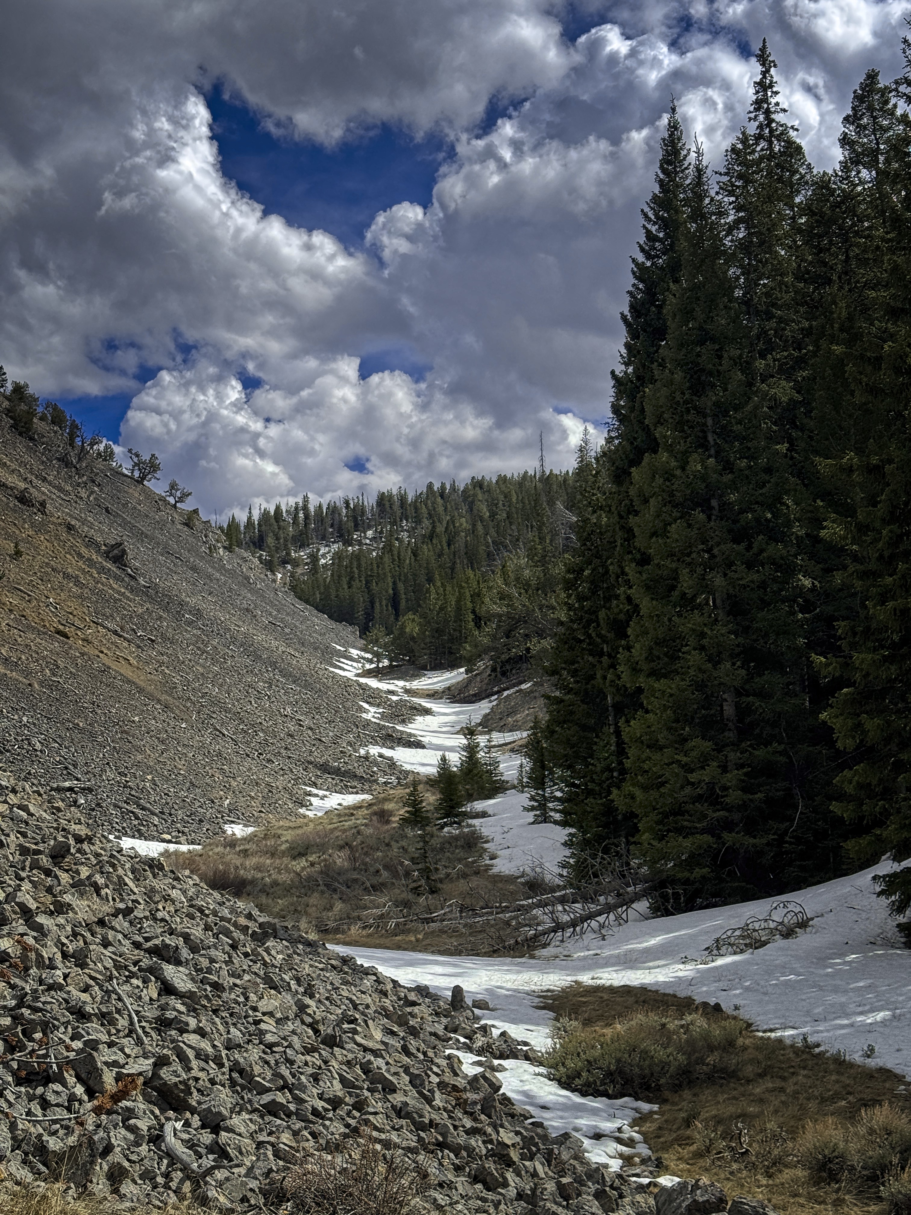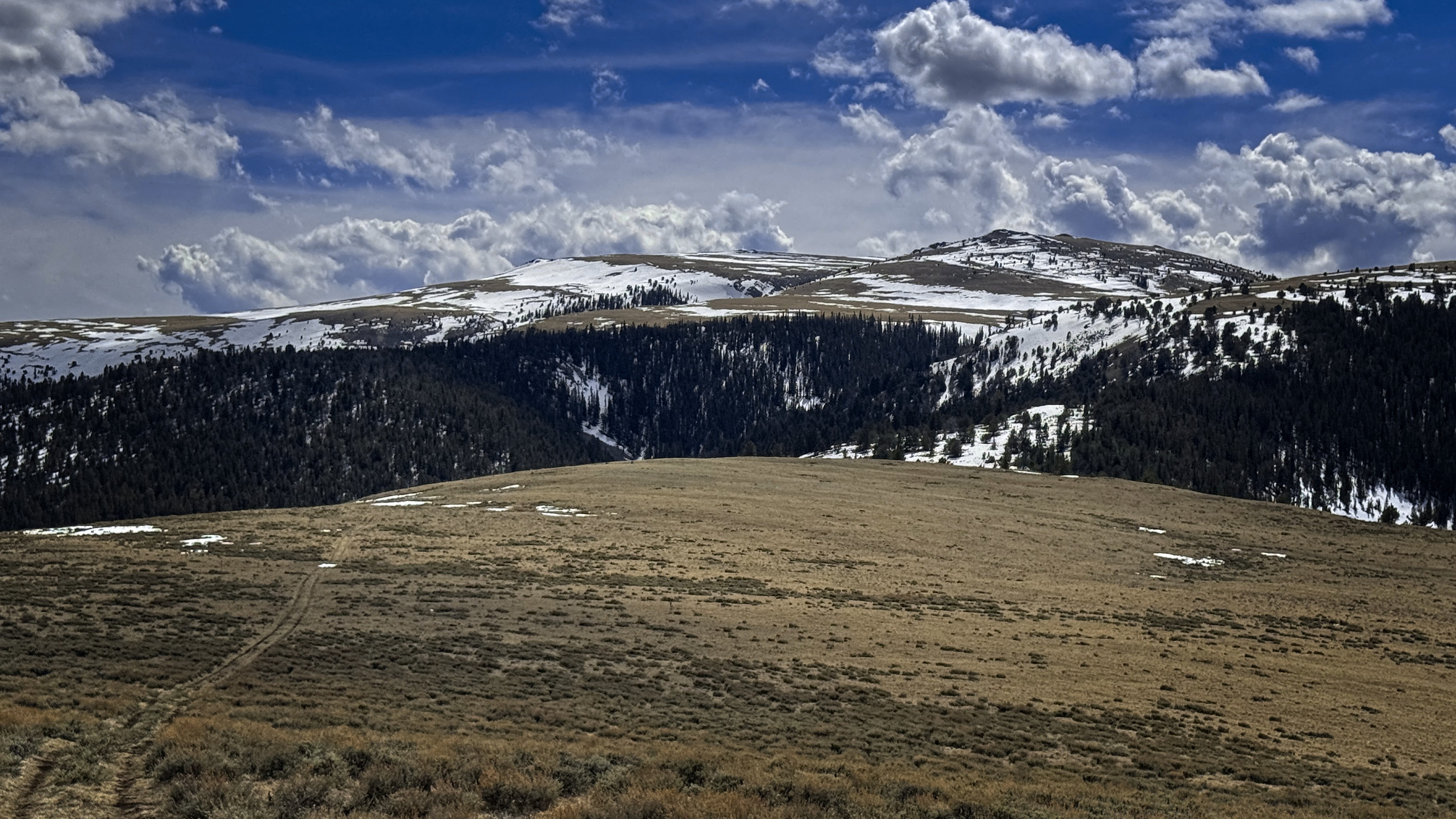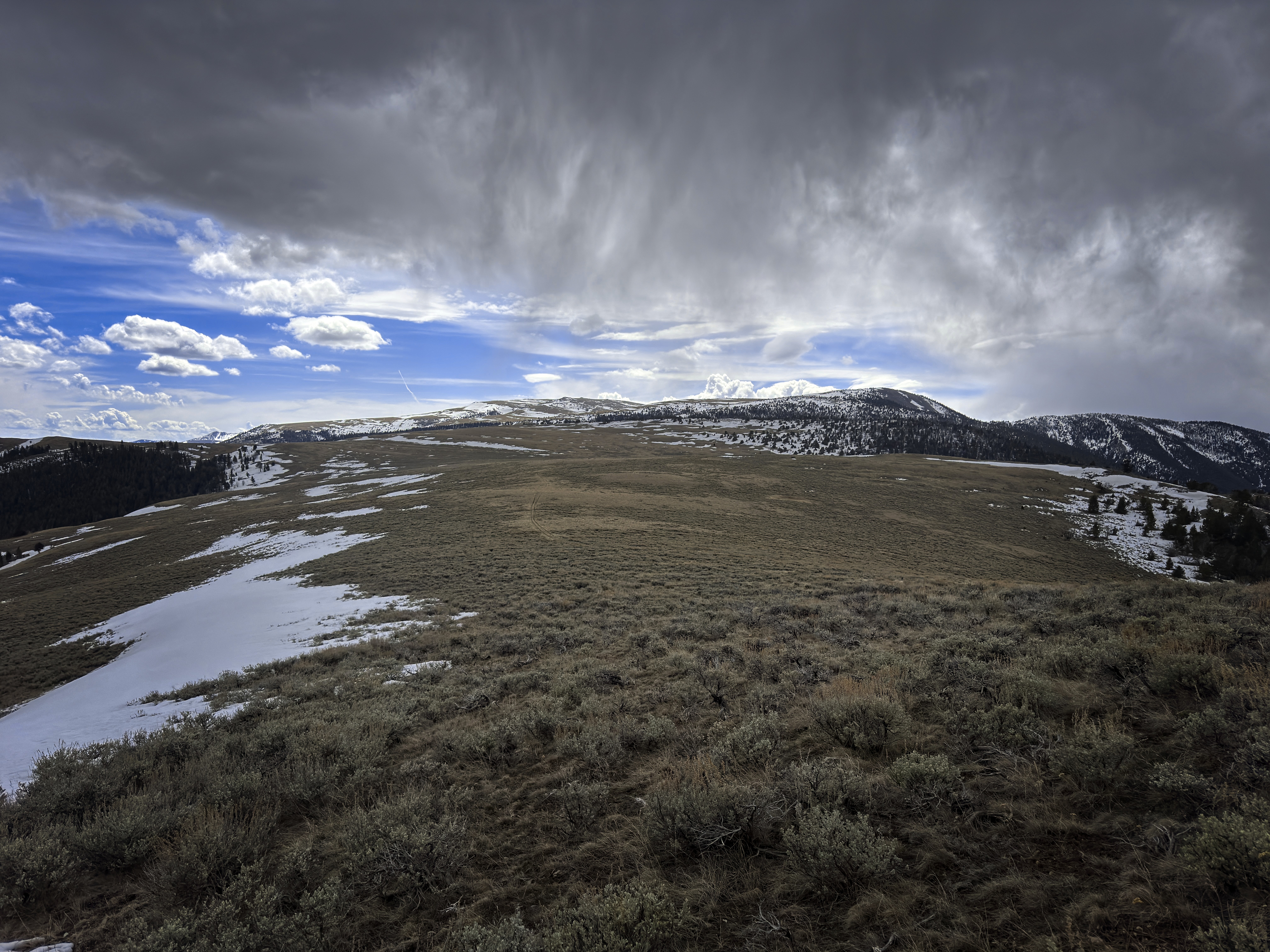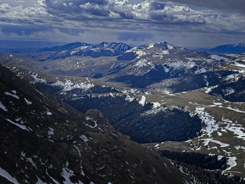 Once back to the trail, I decided to head south along the broad, grassy Beaverhead crest for a couple of miles and then turn down a valley to reach the trailhead from the east instead of the north. Sun and cloud alternated beautifully. I saw a whitetail deer running in the grass, or maybe it was an elk? Turning into the valley, I'd have a gap with no trail between the high country and a trail in the narrow valley. This was only a little bit tricky, with deep and rotten snowpatches, steep forest, and the need to avoid rocky outcrops. Elk tracks helped me out.