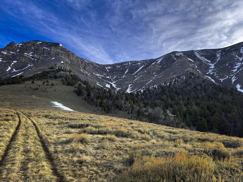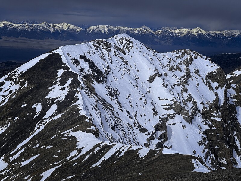 I drove down in the evening, making for an interesting drive on the dirt roads at night. The directions on the site were perfect, and I was able to park at the official Scott Canyon trailhead. In the cold morning I hiked quickly to warm up, and soon I was looking across at Tower Rib. If there was sufficient snow, I thought I'd just kick steps up the West Face, but alas, there was not! I left the trail, traversing sagebrush mountainside to a little forest, then began following Tower Rib up, easily in open forest. I switched to boots at the highest trees, and soon was traversing on the west side of the lower tower. There was a faint trail, you can just follow your instincts when it occasionally disappears. Such trails look so much more well-defined on the descent!