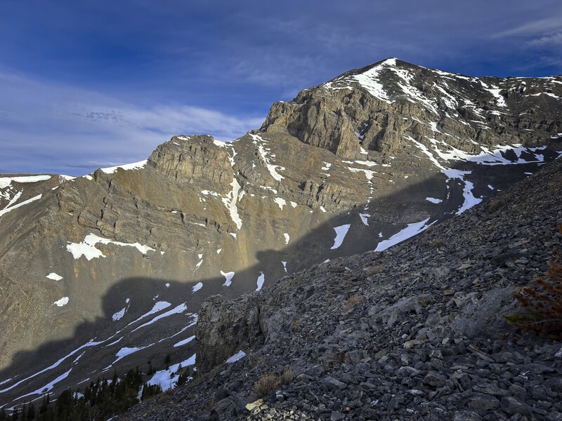 At the massive second tower, I again traversed on the left, and the bulk of the only-occasionally-unpleasant scree and talus ascent followed. I think I was often to the left of the best line on the way up, which meant more slippery scree. Eventually I stuck to the top of the rib proper, and enjoyed the rare climbing move at short, vertical steps. Fantastic views all the way up, especially of the cliffs of the South Ridge of Huhs Horn (aka Peak 11292).