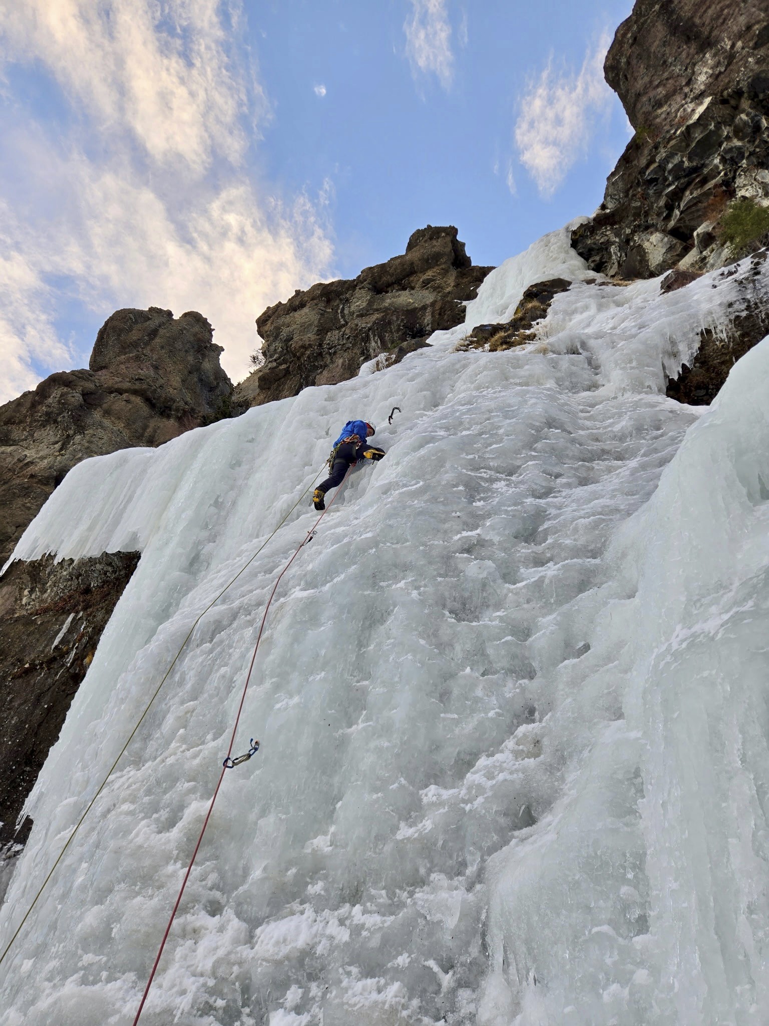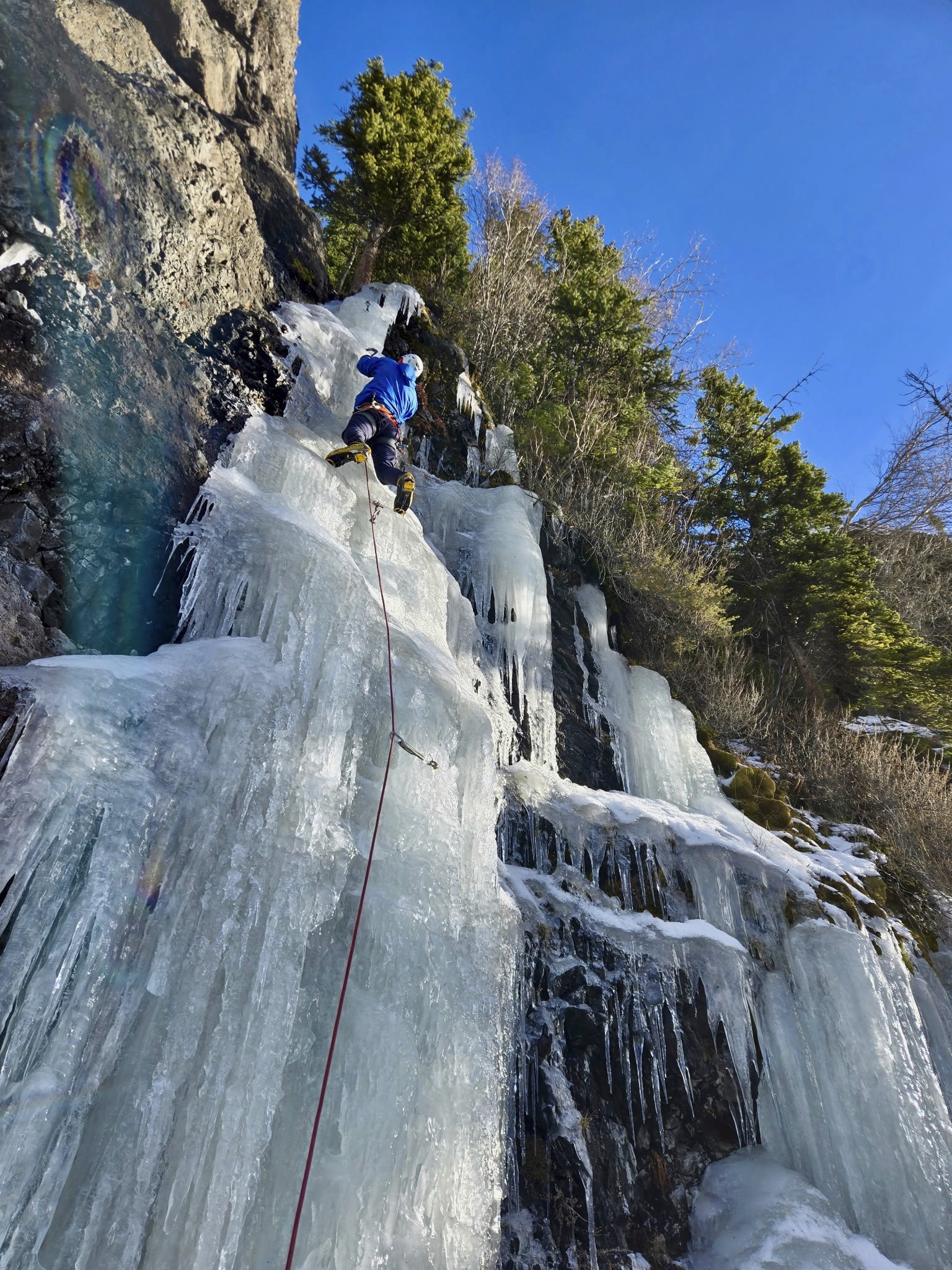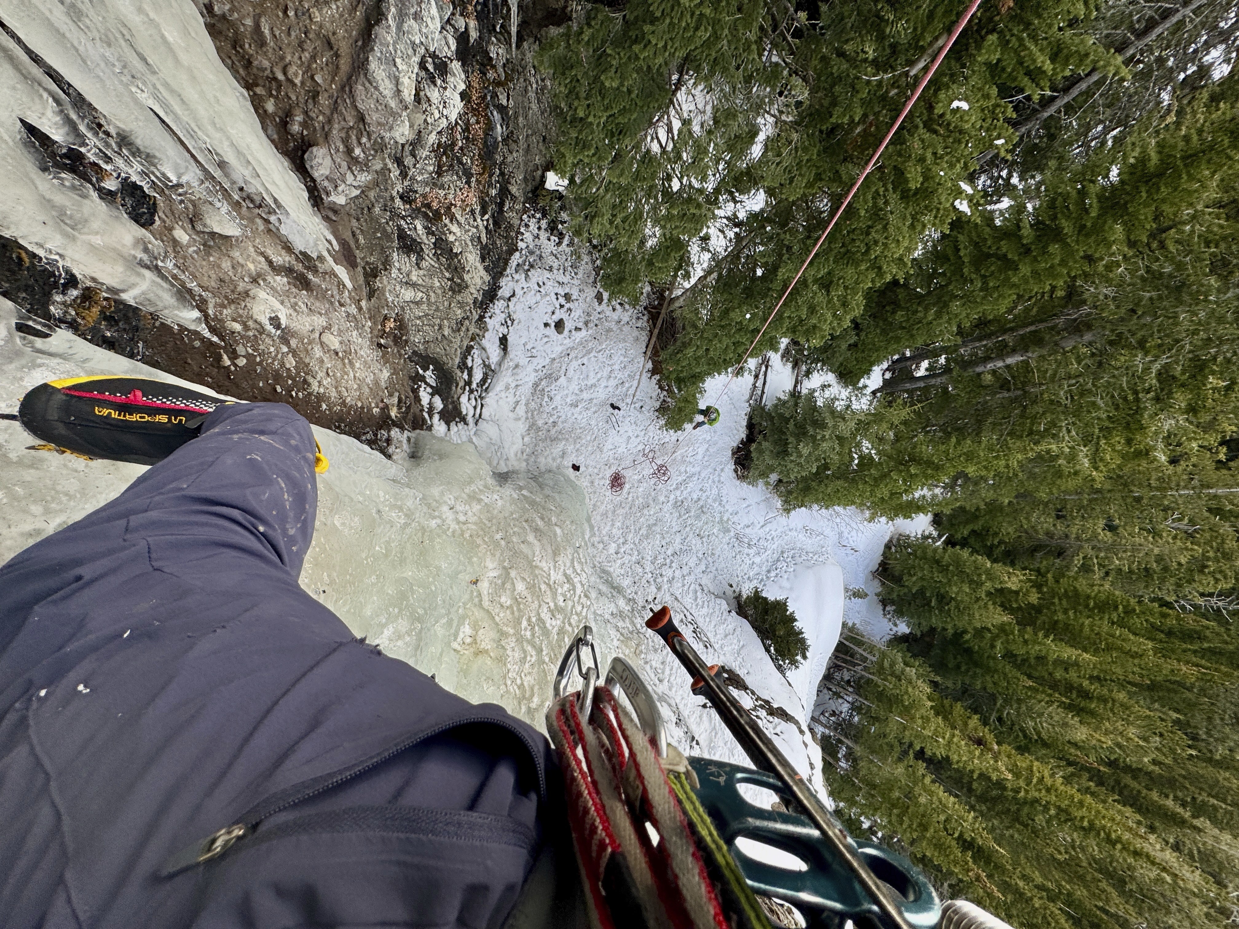 Next we got on The Matrix (WI4-), which sometimes needs some rock gear, though on this day there was sufficient ice. What a fun climb! Robert brought up a haul line. I reached him at the belay, then abseiled on that line. We saw that he could abseil on the single lead line with stretch, only just barely! He could touch down at the base of the initial vertical pillar perfectly with stretch. A really nice cave to belay and hang out in for snacks and hot tea.