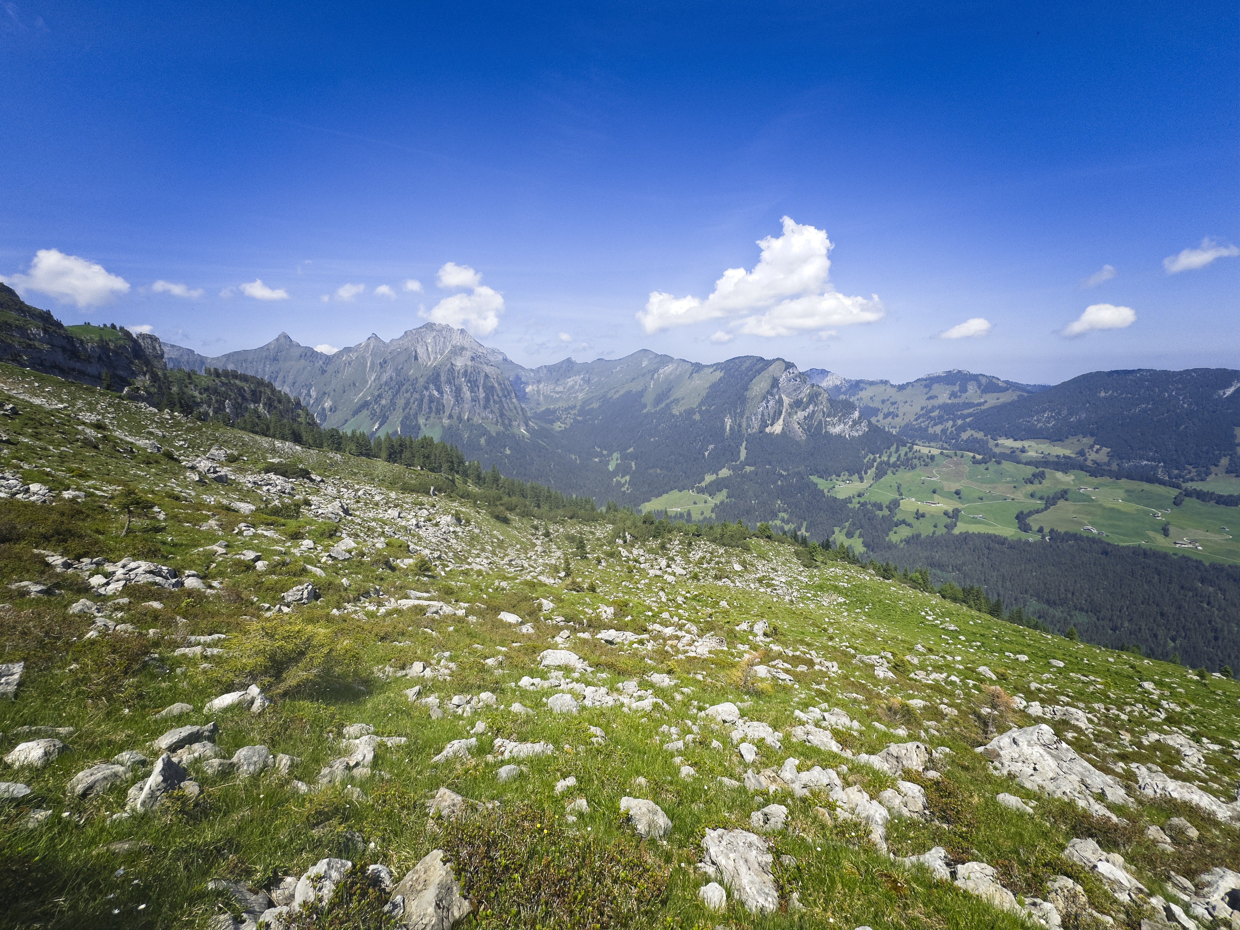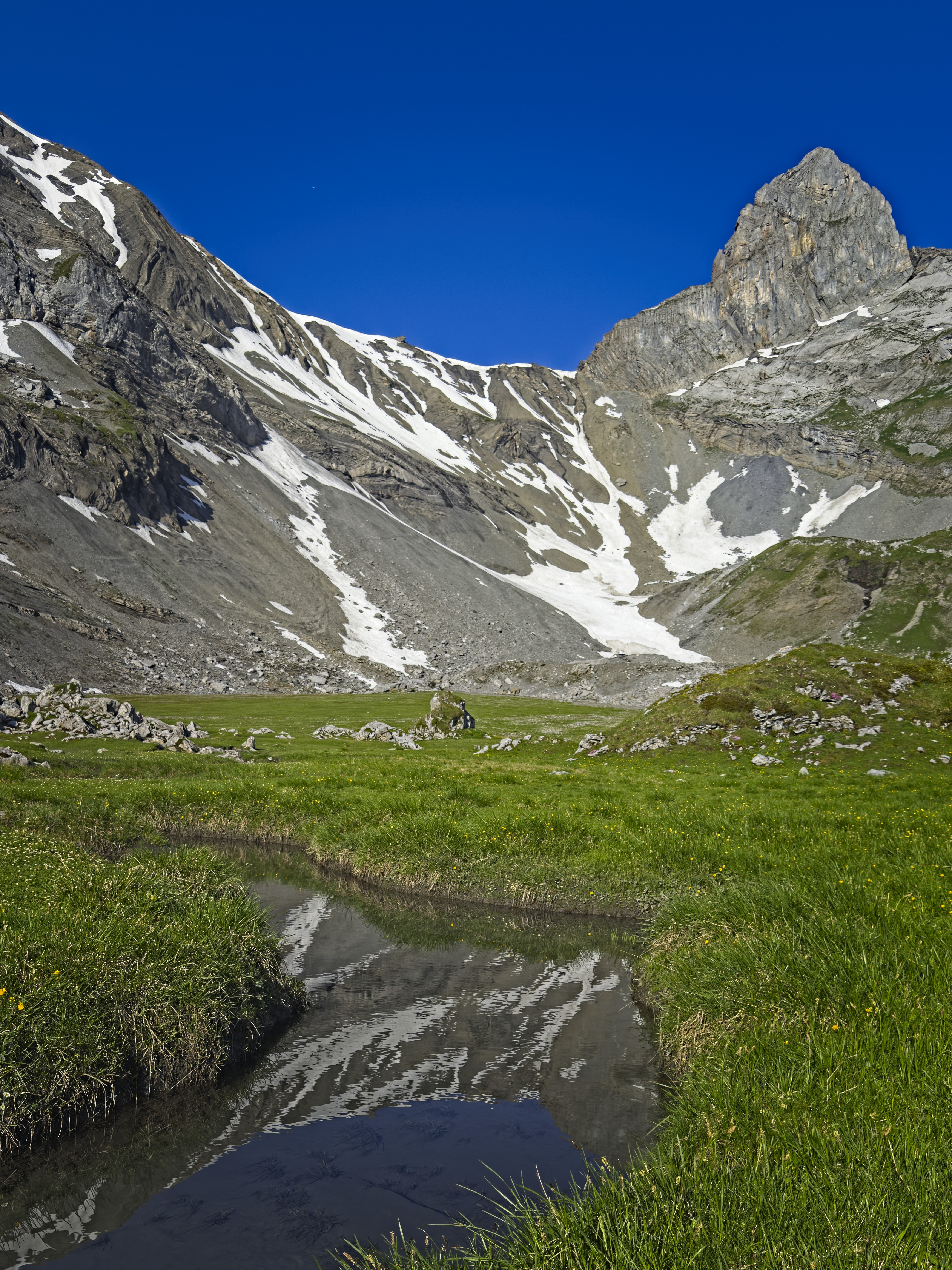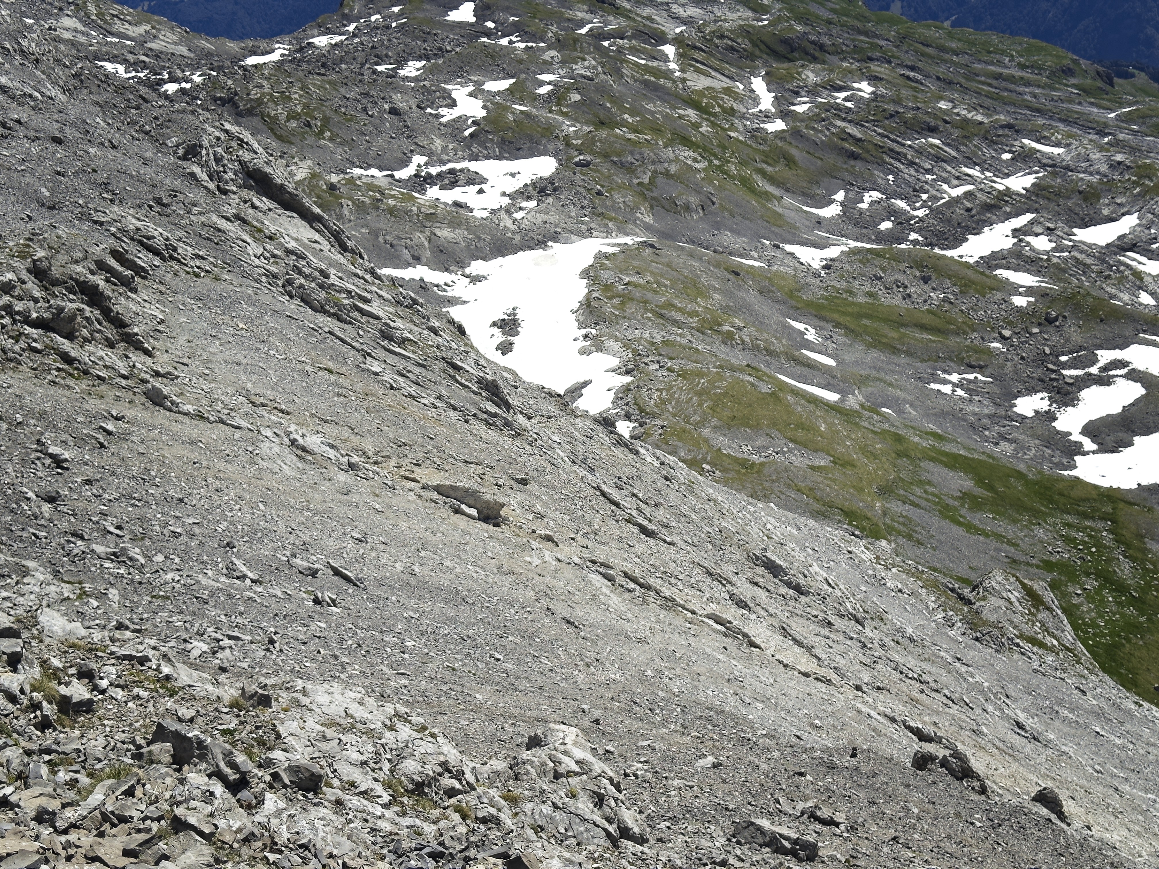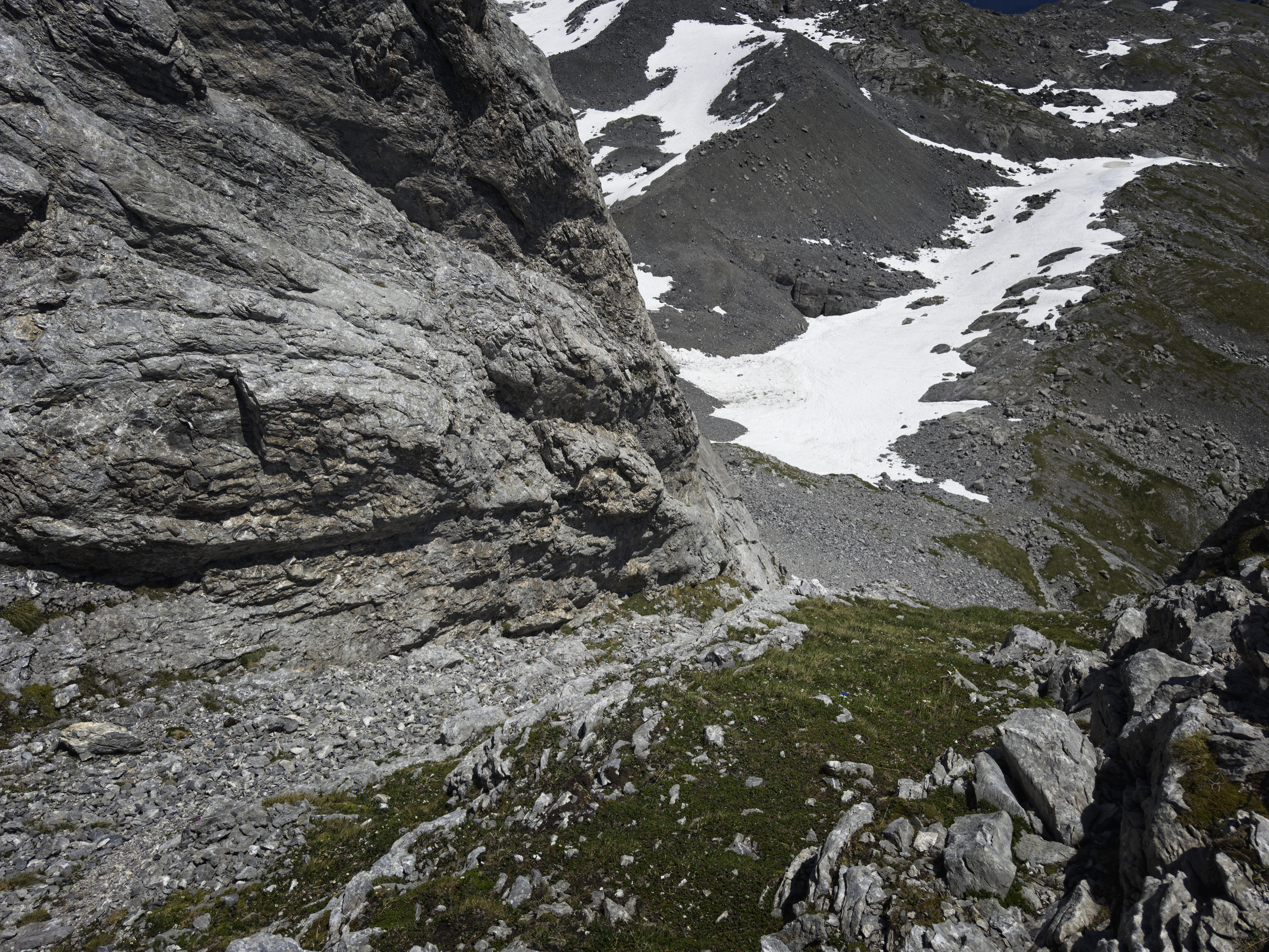 Going down was harder. I opted for the scree, but gosh, it was unpleasant! It really took me a while to make the many decisions about which way to weave. Finally I was at the top of the rock climb, which I carefully reversed. Getting down the snowfield was probably the most difficult part of the day. I ended up kicking many steps and facing in to downclimb. Occasionally I would traverse, but the snow was both slick and a bit too hard underneath to feel like I could arrest if I slipped. Tired out, I reached hiking terrain, then marched back towards the trails 2 kilometers away. This time I took a different route because I wanted to visit a place called Bützi, which I did and it was nice.
