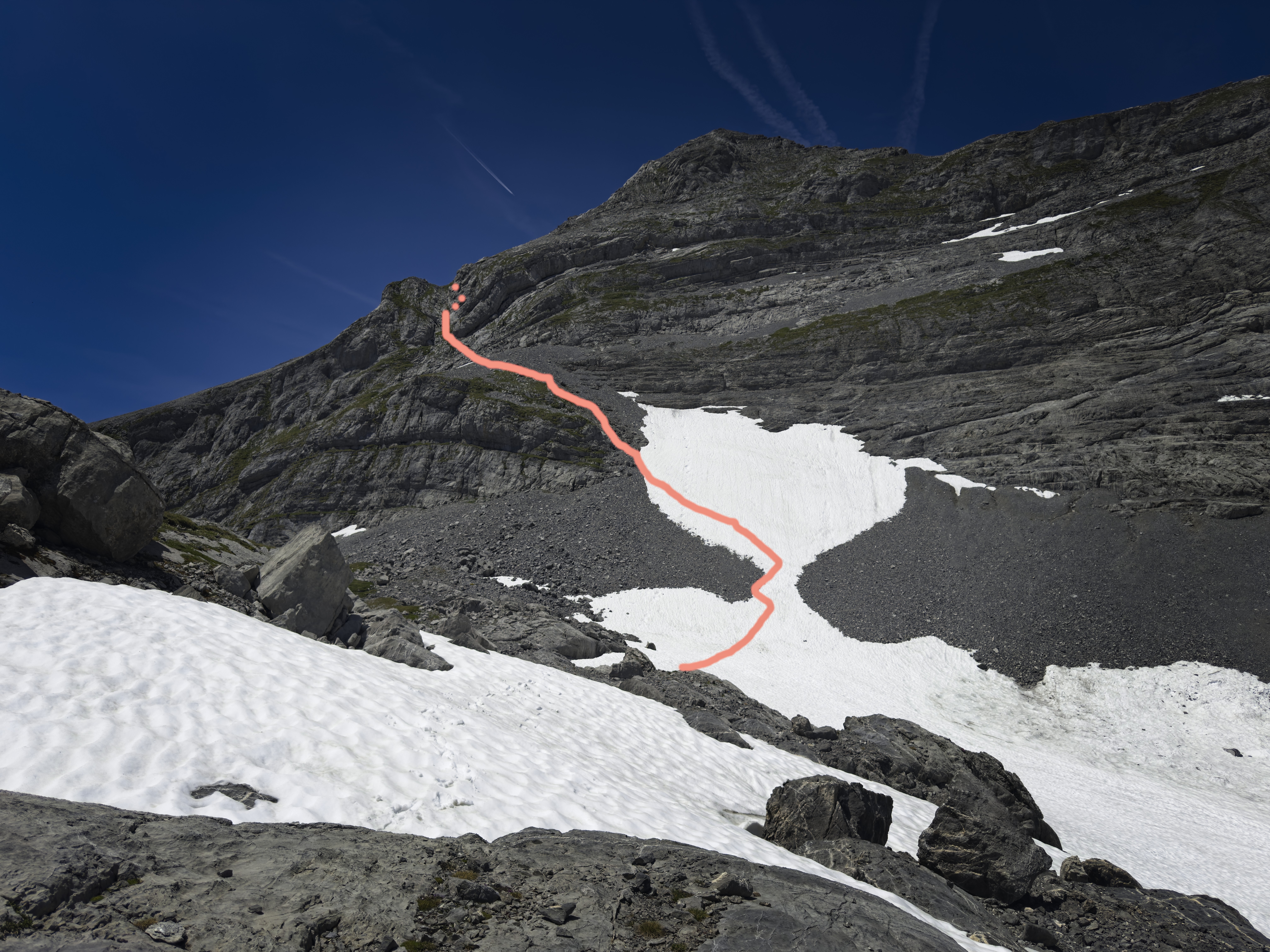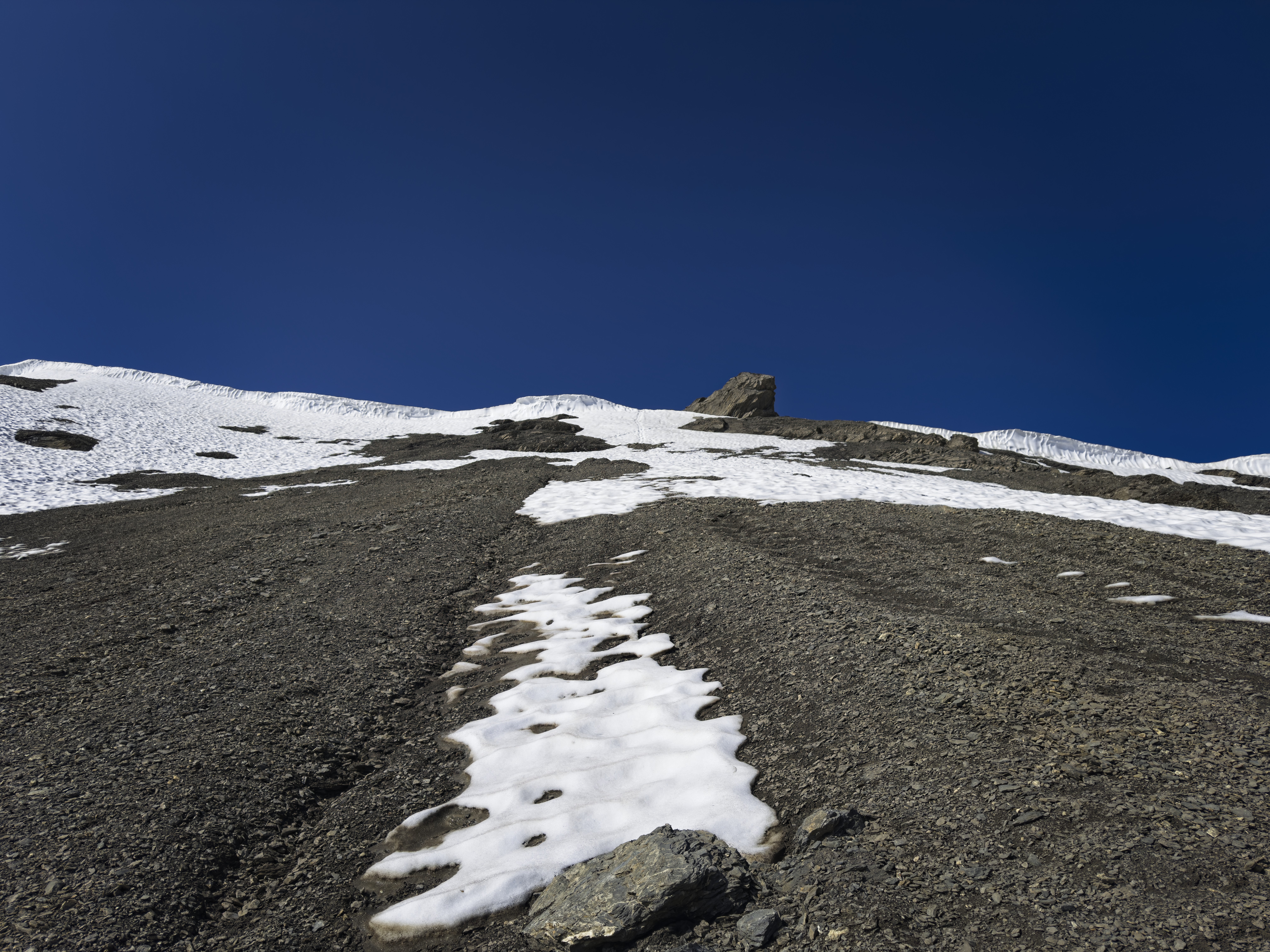 Todays plan was to climb Grisset. Again, I started early. This time I had breakfast at the Gumen lift station, then traversed over. At Ober Boden I started traveling a little north of west over heather and boulderfields with slight descends on a generally ascending line. Eventually snowfields made it easier, and I was standing on the final moraine above an old glacier between Grisset and Bös Fulen.