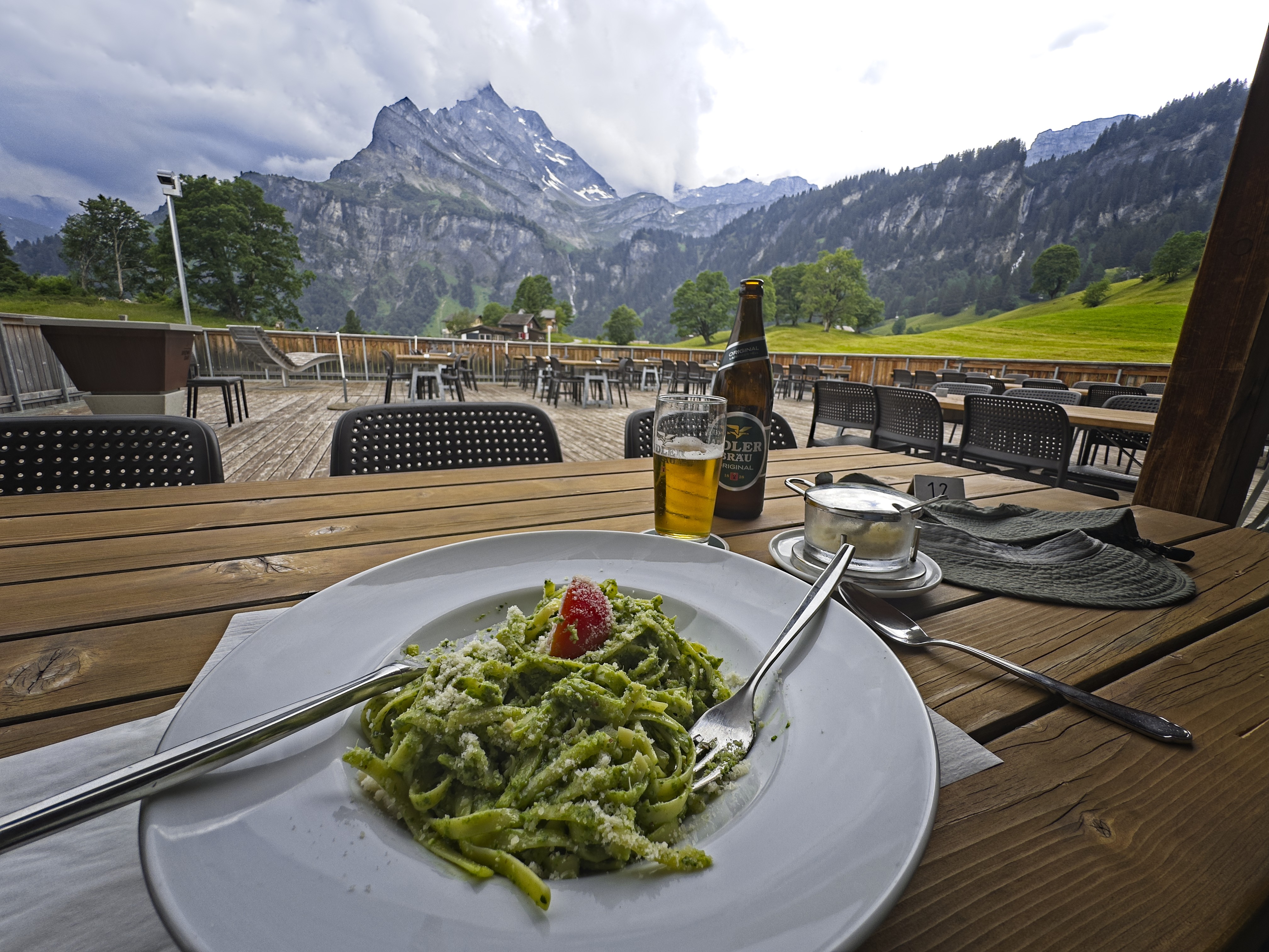 The valley was slowly filling with clouds. As I came back to town it started to rain. I sat at a restaurant by an older lady who said her father had been a hunter and mountain guide -- he'd climbed Tödi 200 times! She said she'd been on the Ortstock 20 years before, but liked the mountains better from the valley. Nearby, a table of older men sang beautiful alpine melodies. I had pesto and beer, watching clouds appear and burn off around my mountain.