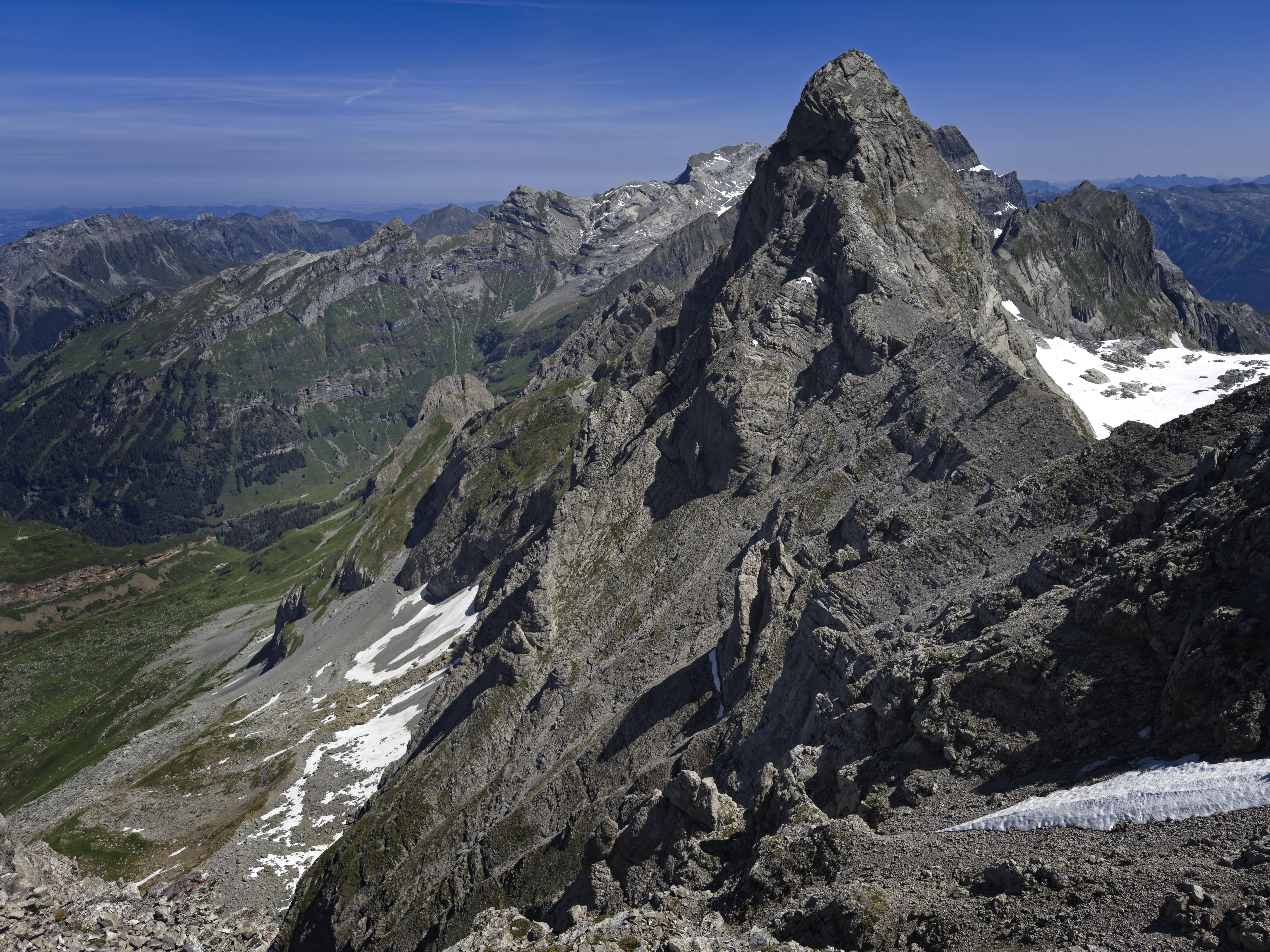 From this summit, the Ortstock off to the south is very impressive. I borrowed some binoculars from some Italian guys, and tried to determine if there were steps kicked into the snowfield which gains the northwest ridge of that peak. I couldn't tell. It looked steep and snowy. But if I could reach the Furggele Pass, then the last 300 meters to the summit along the ridge looked to be clear.