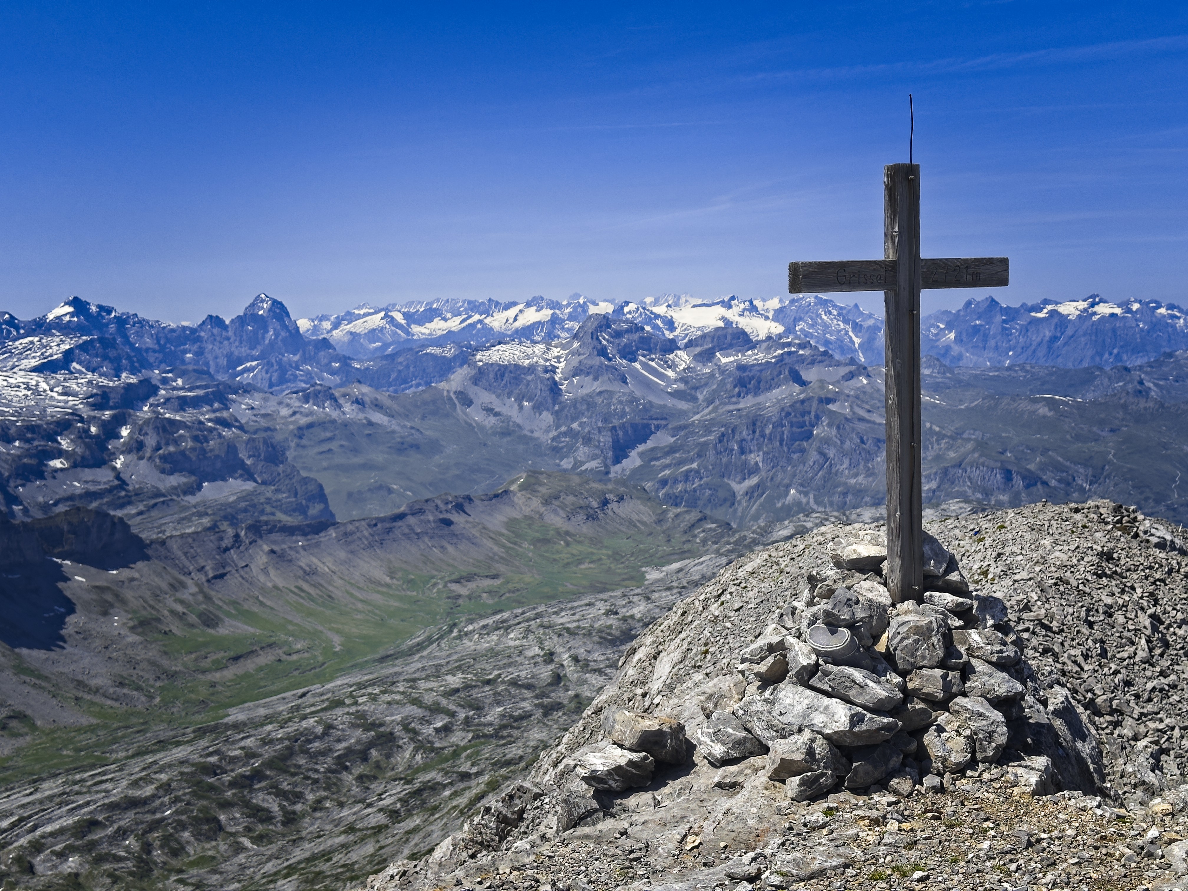 Now the way was clear to the summit, although steep. Soon I stood on top admiring the views to Tödi and other mountains of the Klausenpass region. On the way down, a woman was trying to get her big white fluffy dog to climb a rock wall which had a chain for assistance. I got under the dog and tried to lift him up but he was certain he didn't want to do it!