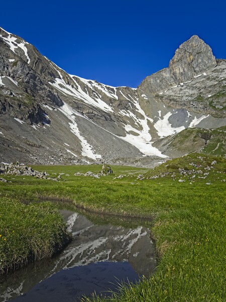 Steeply up along a waterfall to a place called Ober Stafel. then up through cliffs to a place called Bärentritt. Here was a beautiful flat meadow and a burbling stream, with the Ortstock above. Asking God for a bit of help, chiefly, for good judgment on my part to prevent me from climbing up snow slopes I shouldn't in inadequate shoes, I started up. Soon I was crossing snowfields, but they were okay. The steepest parts were snowfield. Later, I avoided snowfields for scree, making use of small dimples in the scree indicating others had done the same. Before I knew it, I was at the final slope! It remained suspenseful to the very end. The last difficulty was crossing the steep snowfield a few meters beneath a cornice. I enlarged old tracks, carefully dealing with a deep hole or moat by building good tracks around it, then alighted on a rocky slope where a few more careful moves got me to the summit of the pass.