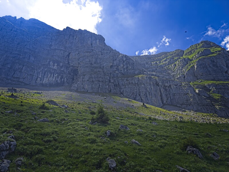 After sleeping in Mantra nearby, I decided to scramble up a peak I could see from the parking lot called Rautispitz via a route called the Troosweg. I only got a few minutes of trail, then it was scrambling up a gully on latschen game trails and scree slopes. Then a long traverse to the base of the wall.