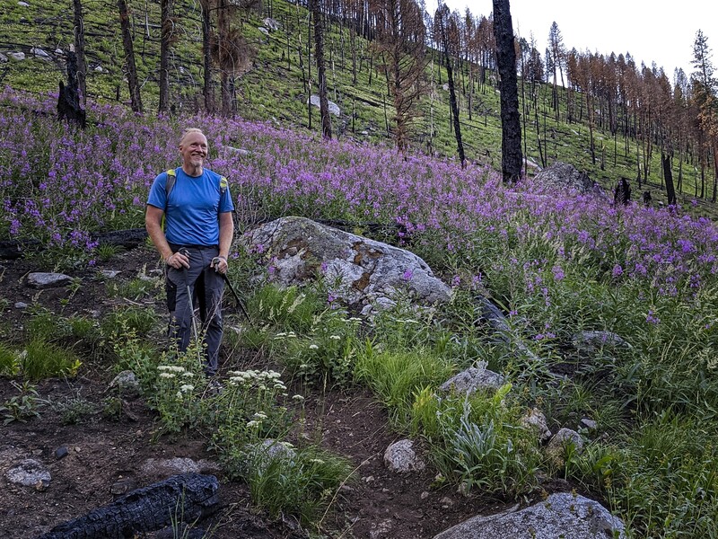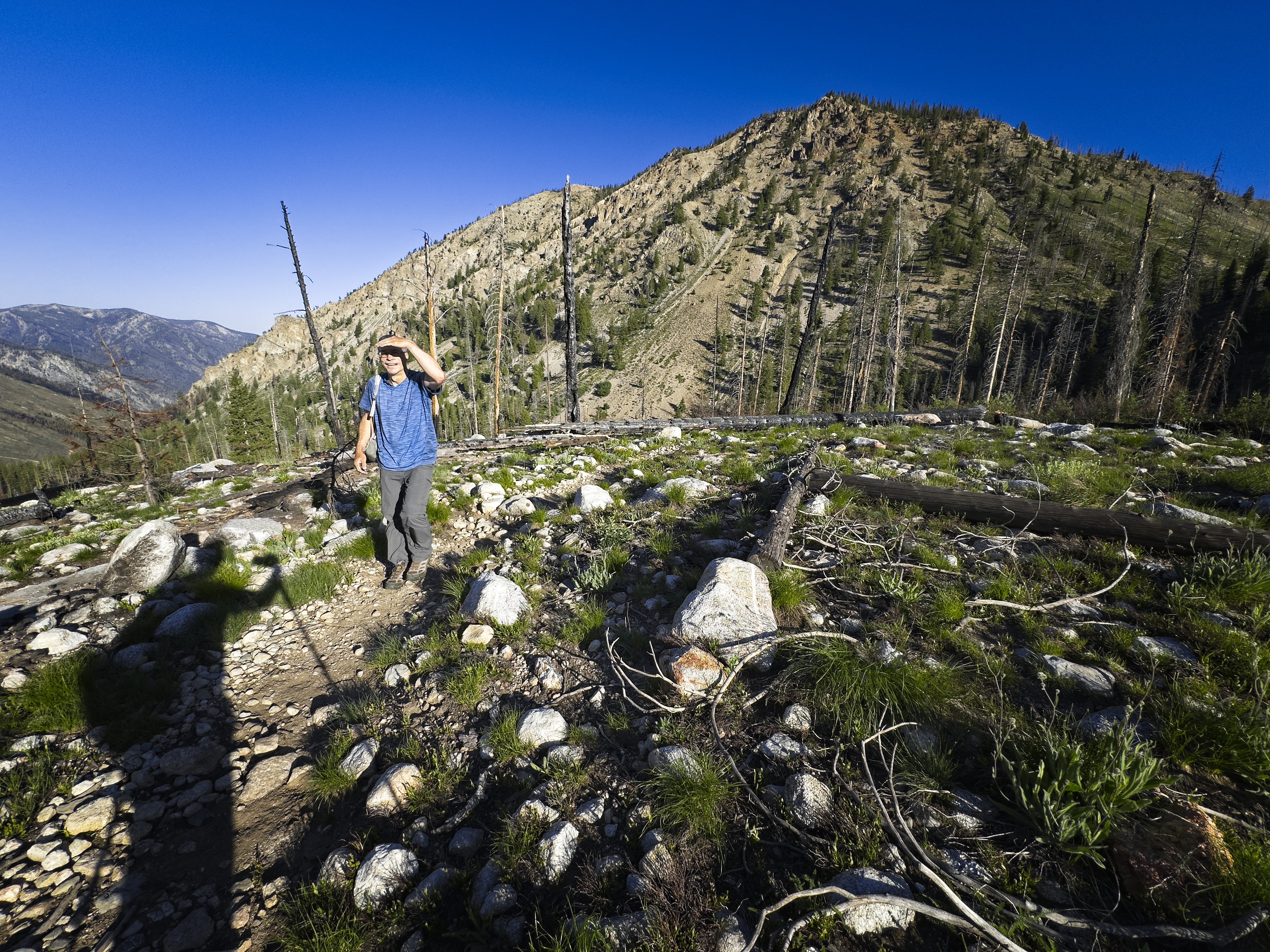 For our first hike in the Sawtooths, Steve and I chose Observation Peak, reachable by good trail from the Grandjean Campground. We loved the alpine country, though we were surprised how often we had to cross the river! I think we made it up on logs, but on the way down we just waded across the river at one point, since one of the crossings had been sketchy.