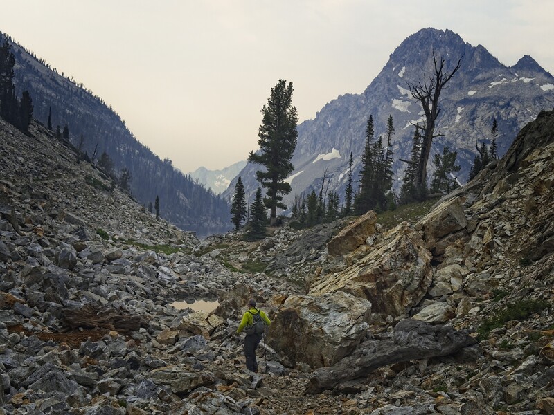 We started hiking from the Iron Creek Trailhead at 6 am, slightly dismayed by clouds in the sky. Within an hour, we could smell smoke, and noted a brown haze in the air with some alarm. As we approached Sawtooth Lake, some backpackers coming out told us the smoke was a surprise to them as well. Oh well, we thought we'd just continue until something stops us.