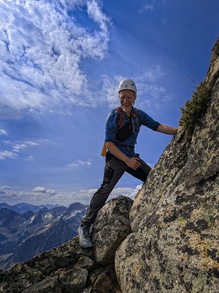 After some nice scrambling, we came to a short (5 meters high) step of 5.0 climbing. This was quite fun. Above that, there were no further difficulties, and we stood on the summit after a few minutes.