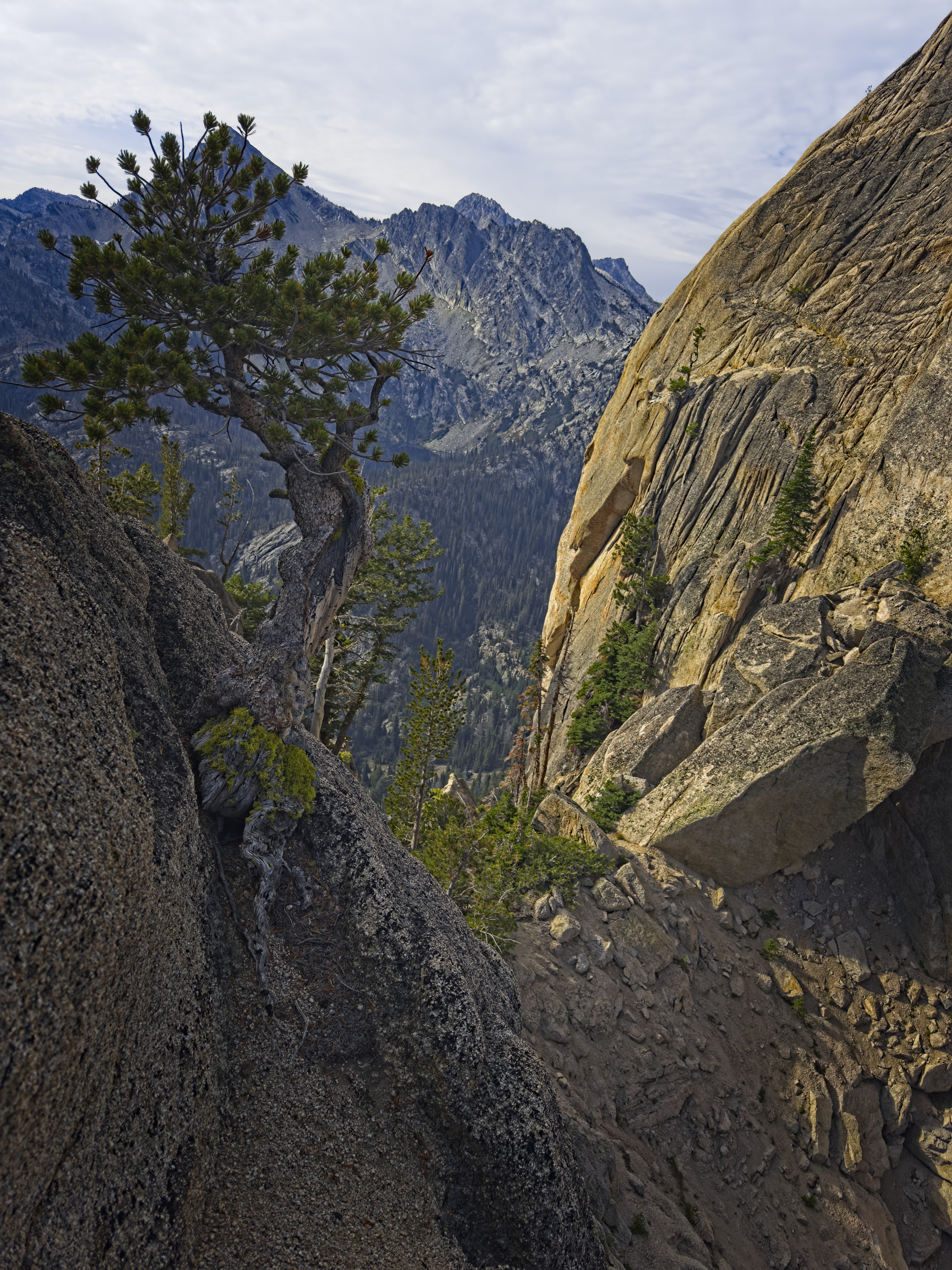 Steve and I explored a rocky gully on the north side of Iron Creek on the approach to Sawtooth Lake. We hoped to establish a new route on one of the towers of the striking, light-colored granite rock. Although we attained the ridge crest, we left the summits untouched. The rock was too friable to place protection in, unfortunately. Any attempt at climbing it would break off an outer later. The rock could be sculpted with your hands!