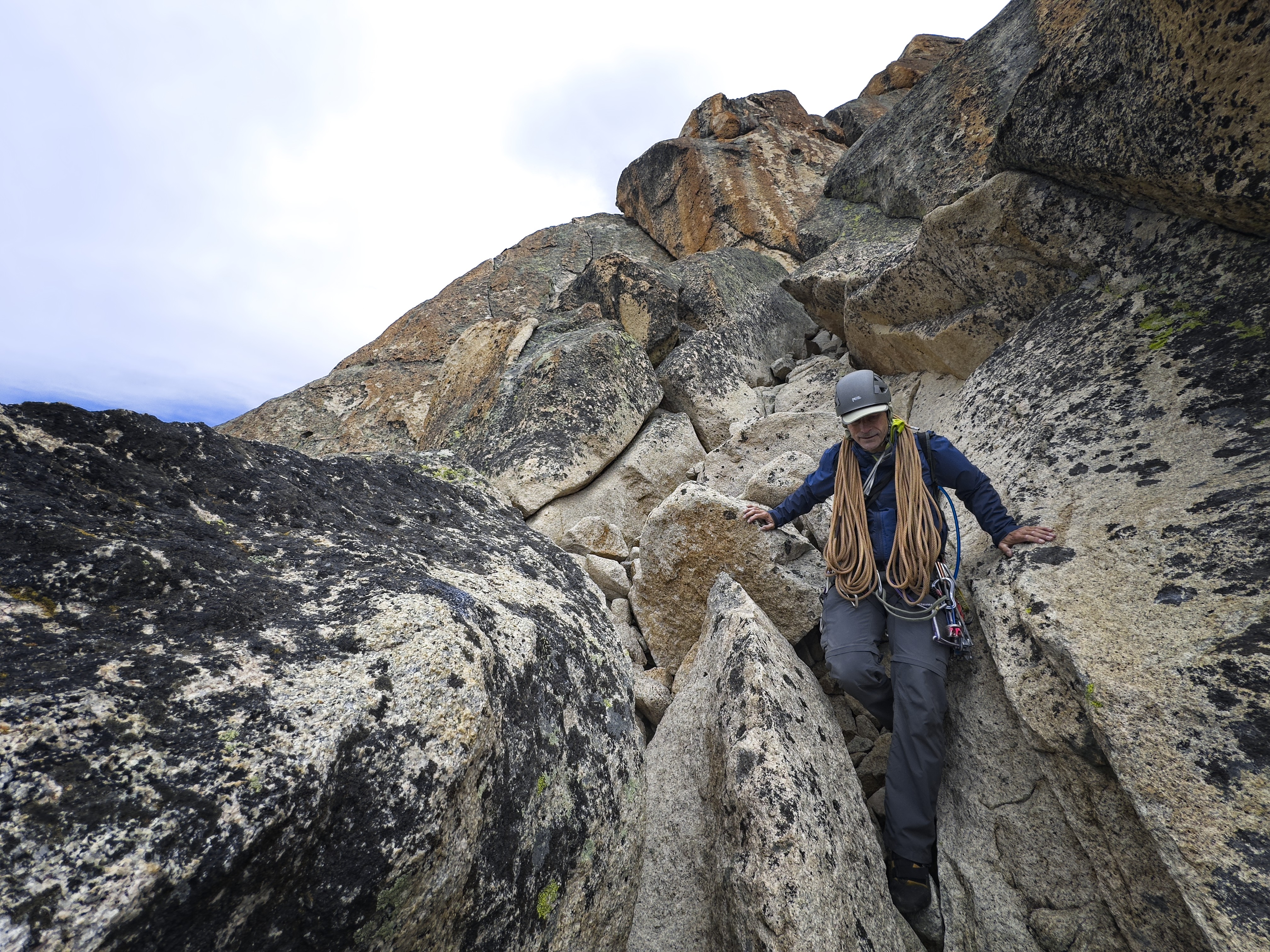 I was initially disappointed and wanted to try myself, but I realized that a) the outcome would likely be the same and b) even if I did make the moves, the follower is in just as much danger on this traverse as the leader. Finally, I was cold and the weather seemed to be getting worse. It was time to head down.