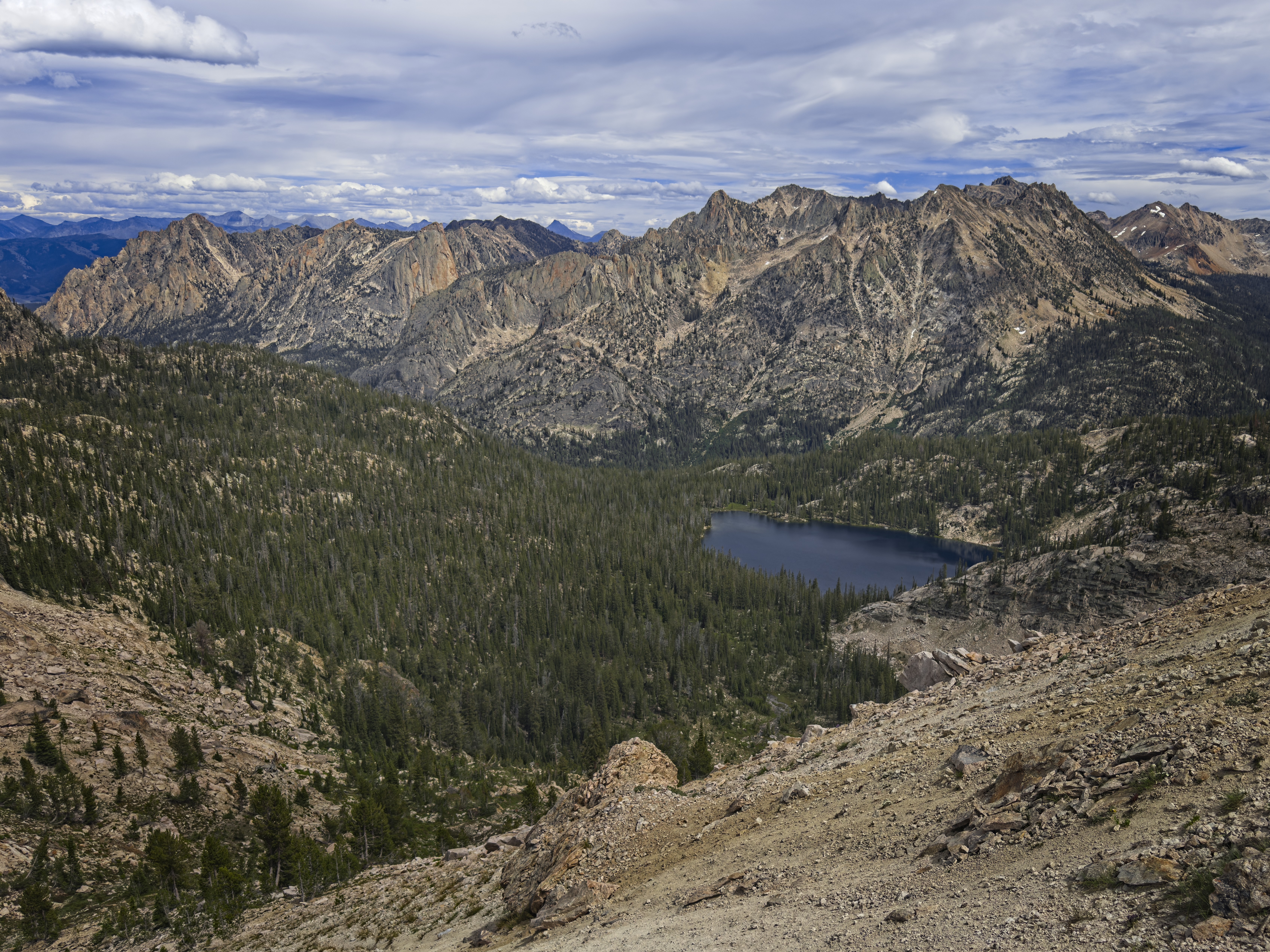 After 15 or 20 minutes crossing this face, we reached the pass looking down on Warbonnet Lake. An almost comical traversing descent of about 400 vertical feet followed. It was quite hard to stay attached to the trail at times! We were quite glad to only have our technical gear for this.