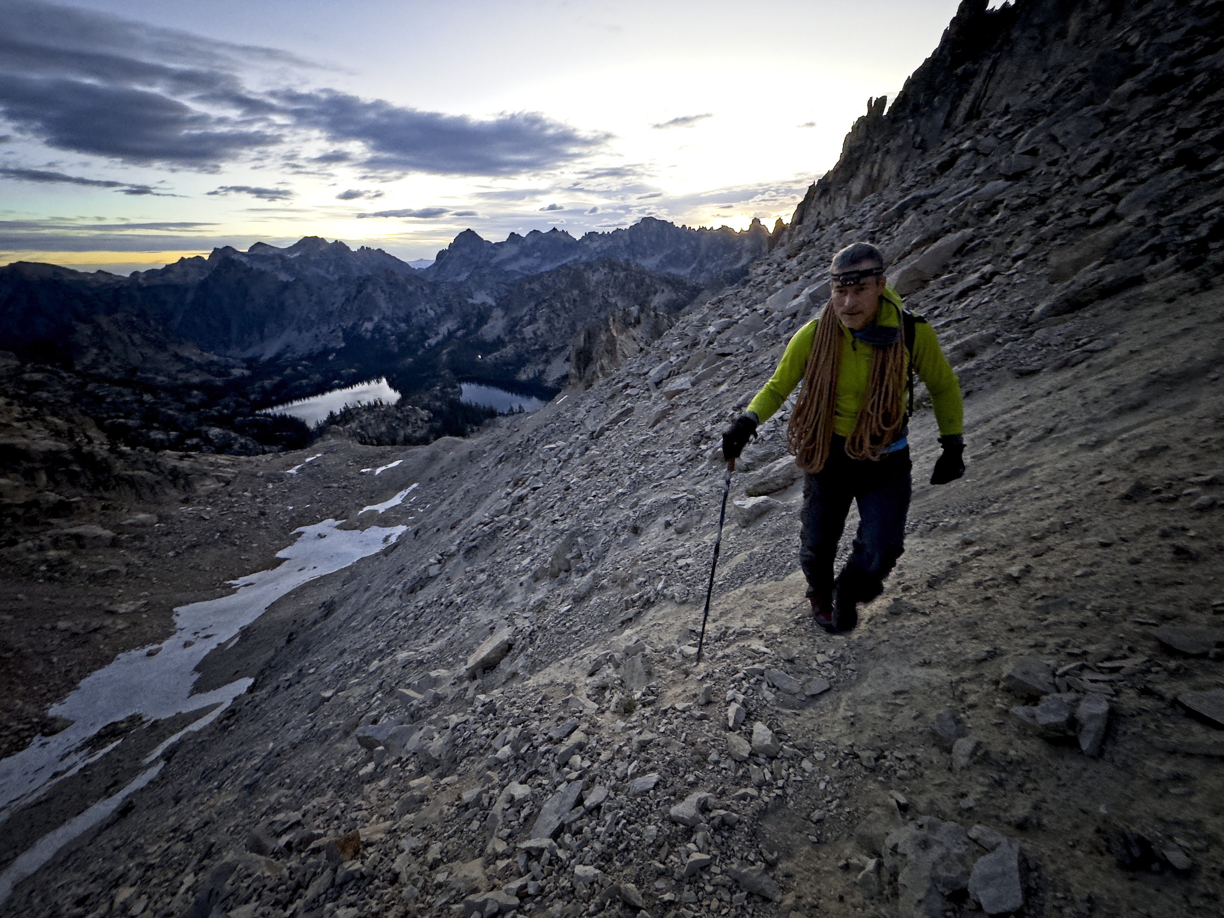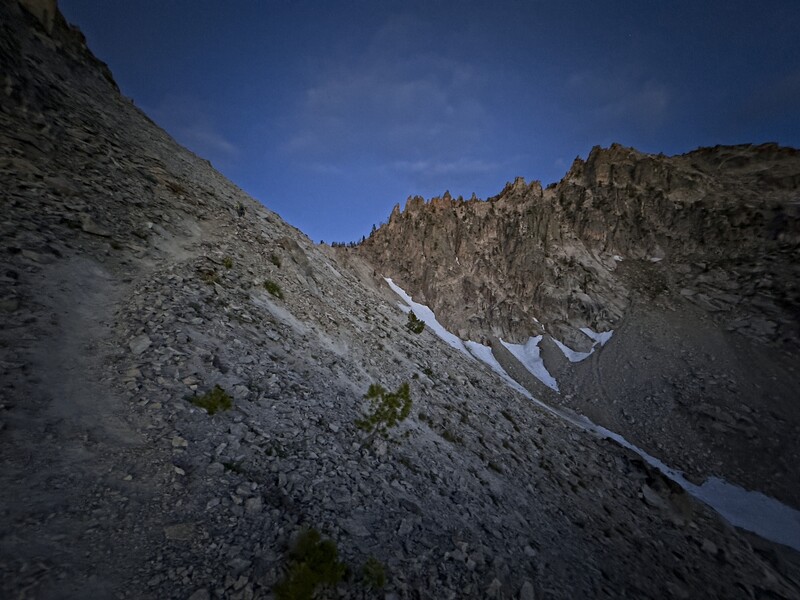 We were walking at 5 am, easily navigating the climbers trail and traversing the hillside in the darkness. We were aided by one piece of advice to gain the high pass -- we should stay left, rather than aiming for the lowest point of the pass as seen from below. This was a good idea. It allowed us to discover a climber's trail (again), and deposited us on the Northwest Face of Old Monte Verita (aka Peak 9769) exactly where a climbers trail traverses the scree/boulderfields. This trail was extremely helpful. It would have been much harder without it, so it's worth searching and finding it!