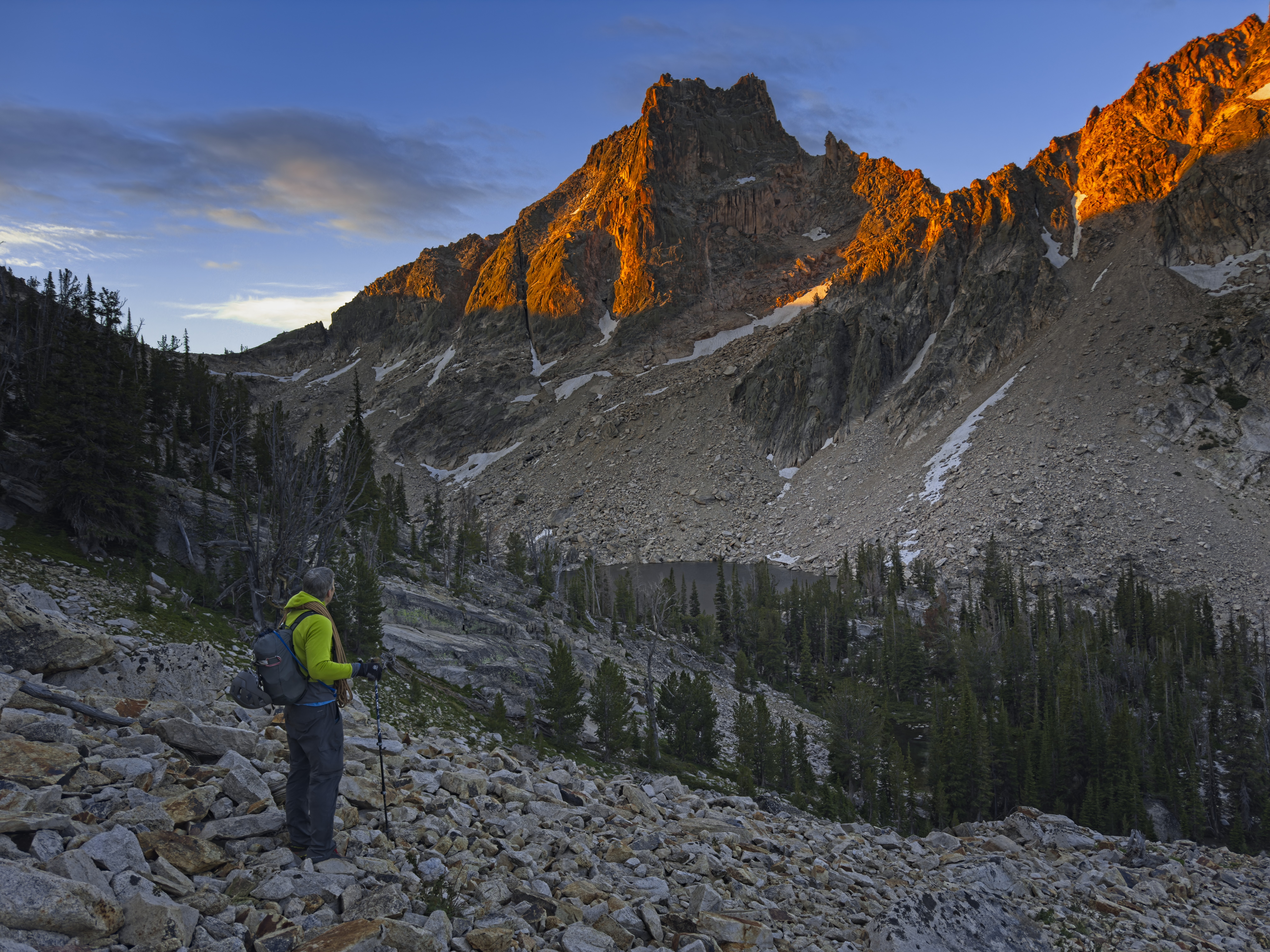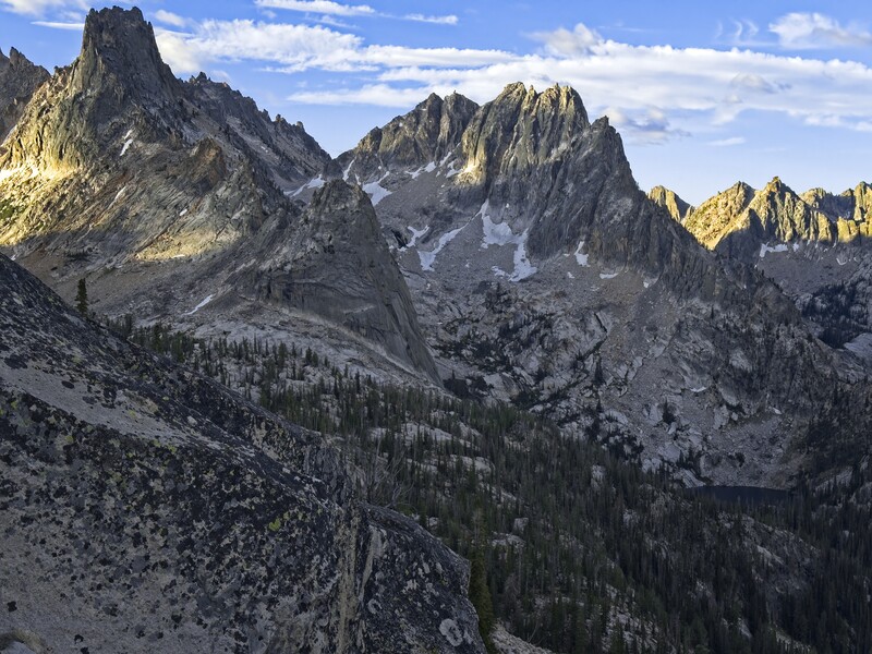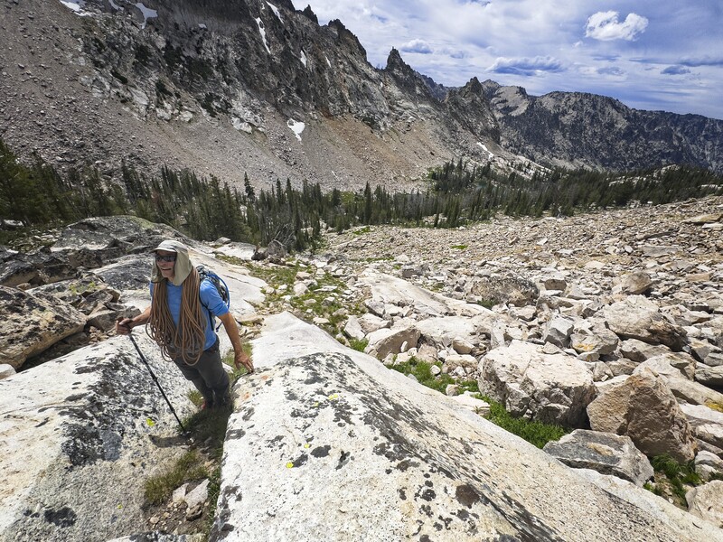 Many folks carry over and camp at Warbonnet Lake, or the Feather Lakes or the Bead Lakes right under Warbonnet Peak. But we'd heard that the long approach was rough, so we decided instead to stop at Alpine Lake and make a bigger day for ourselves on climb day. All we had to do was navigate that approach in the dawn, do the climb and make it back to our tents here at Alpine Lake. Bit of a gamble for conservative older folks like us, but we thought our systems were fairly dialed on the technical stuff, so even if we are slow on the approach and descent, we should have enough time.