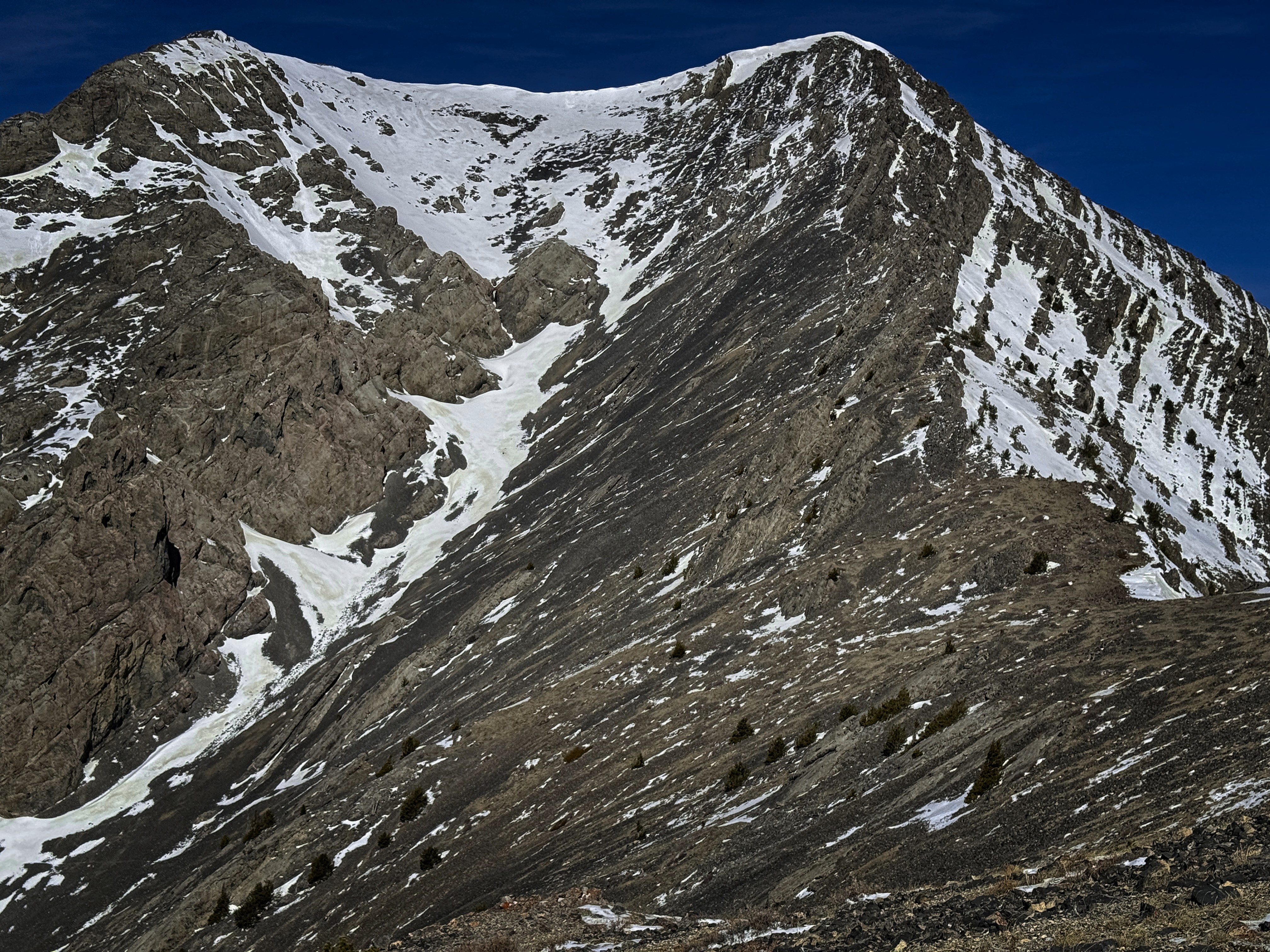 In a sunny talus-meadow, I stopped for lunch and admired the snowy peak. A broad snow gully with crags on the west side would become the object of my interest over the next hours...probably a great ski tour. Continuing, my ridge narrowed to a rocky fin, quite entertaining to walk on, leading to a high plateau at 10000 feet. Traversing on the west of the summit of this plateau (Point 10248 on a USGS topo), I descended a bit to a saddle, then starting grinding up the Southeast Ridge. I went until I was embedded in rocky towers, and took the last / highest exit to talus slopes on the left (west) to avoid difficult climbing. I was promised a goat trail along the base of the towers, which was indeed there.