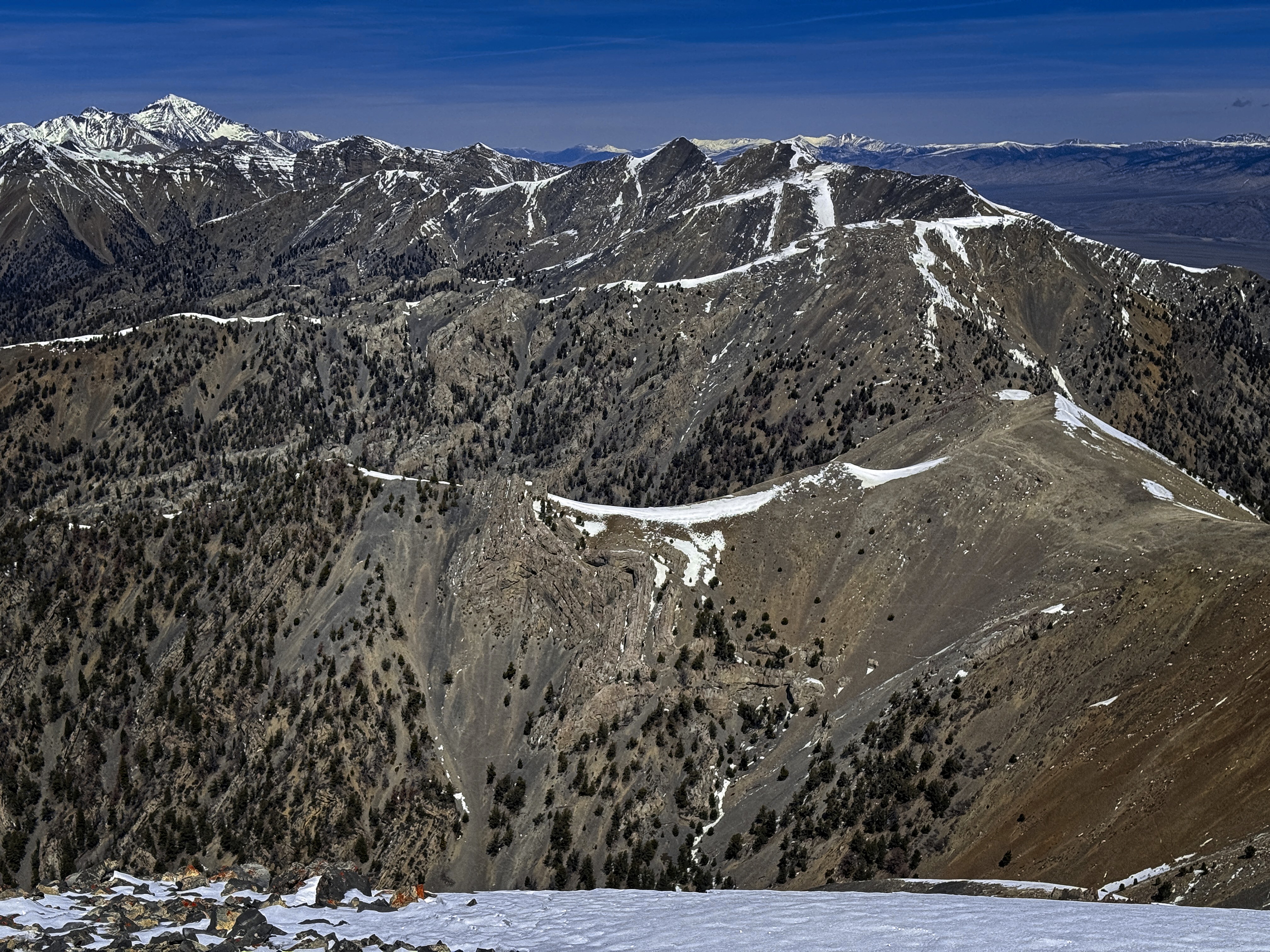 Looking around, I thought my route had to be one of the more involved ones, due to the long journey in the canyon and 1000+ feet of off-trail travel to get up to ridge-tops. Looking east, the distance between brown lowlands and walkable ridgetops didn't seem so immense. Perhaps I'll find out one day!