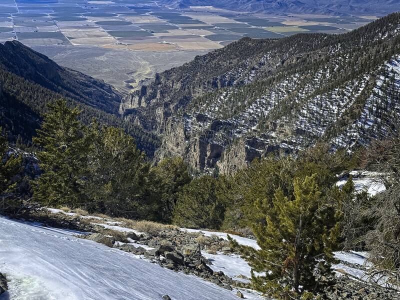Descent was quick. Once below the icy traverse, I removed crampons and continued to the saddle, then up across the plateau guarded by Point 10248, and finally down the gray hogback ridge to reach my burned slopes, down which I was flushed to the canyon floor. Happily, the mud had unfrozen, so for several hundred feet I had an easy, cushioned-step ride that was quite pleasant. I reached the canyon floor a few hundred yards north from where I left it.