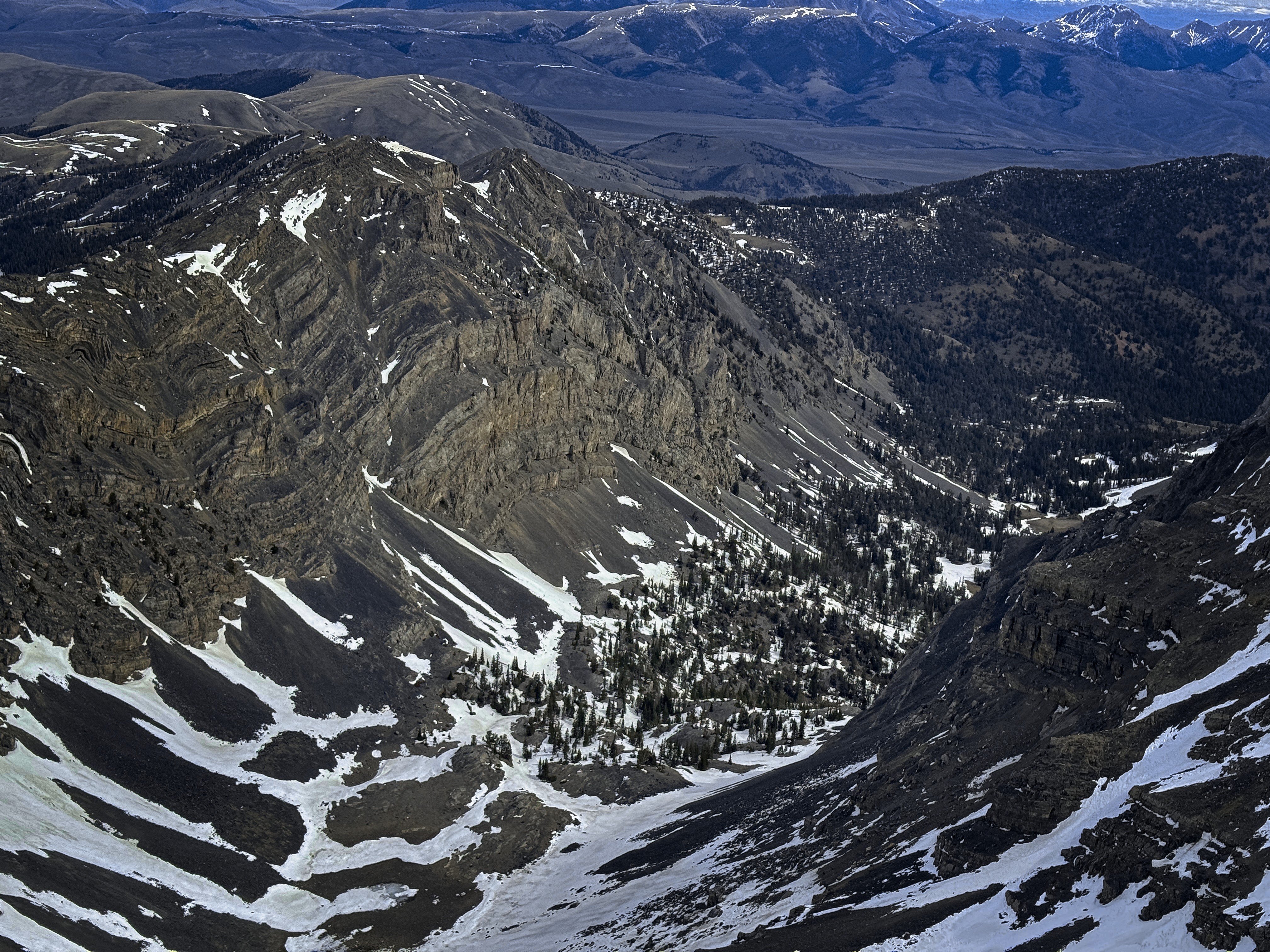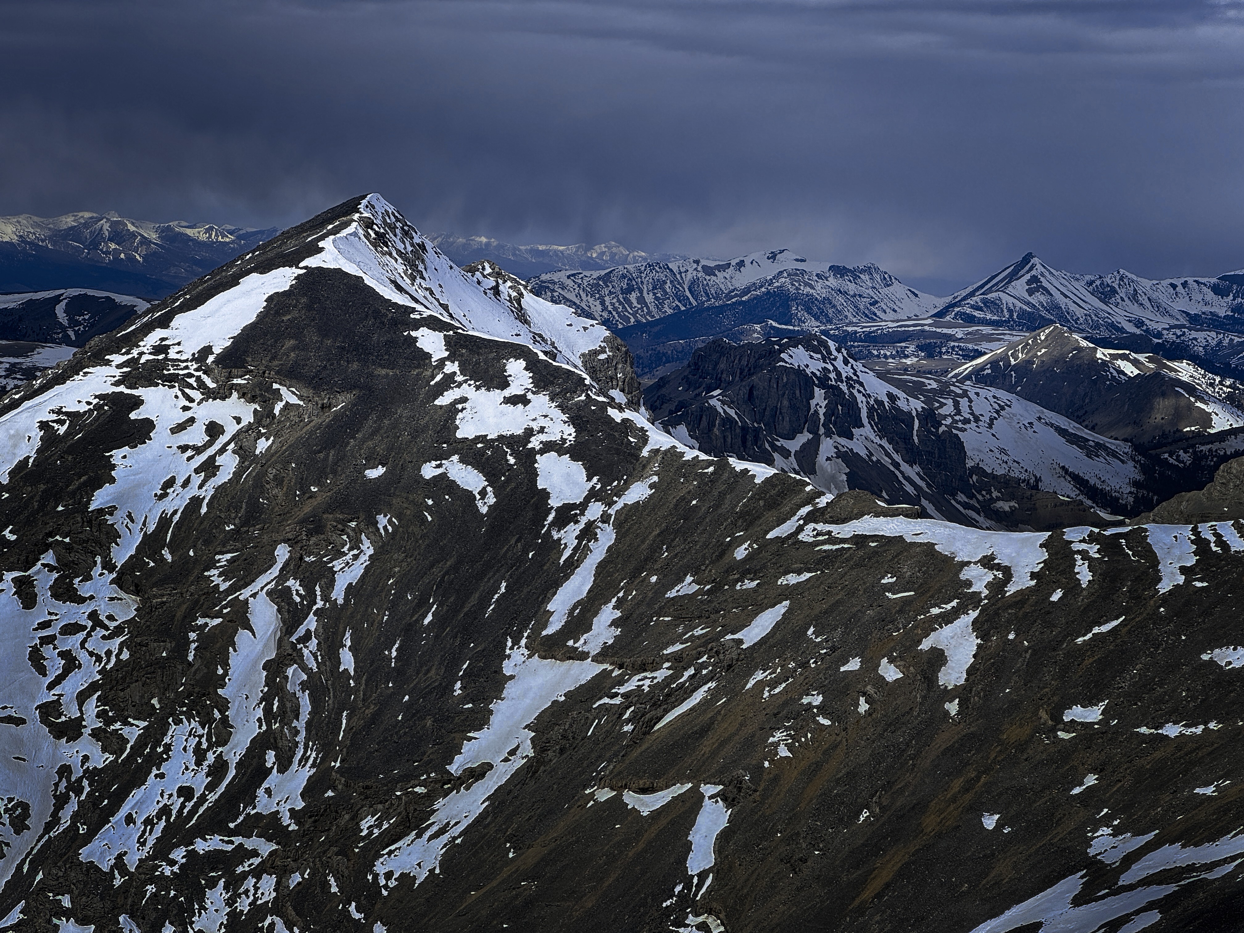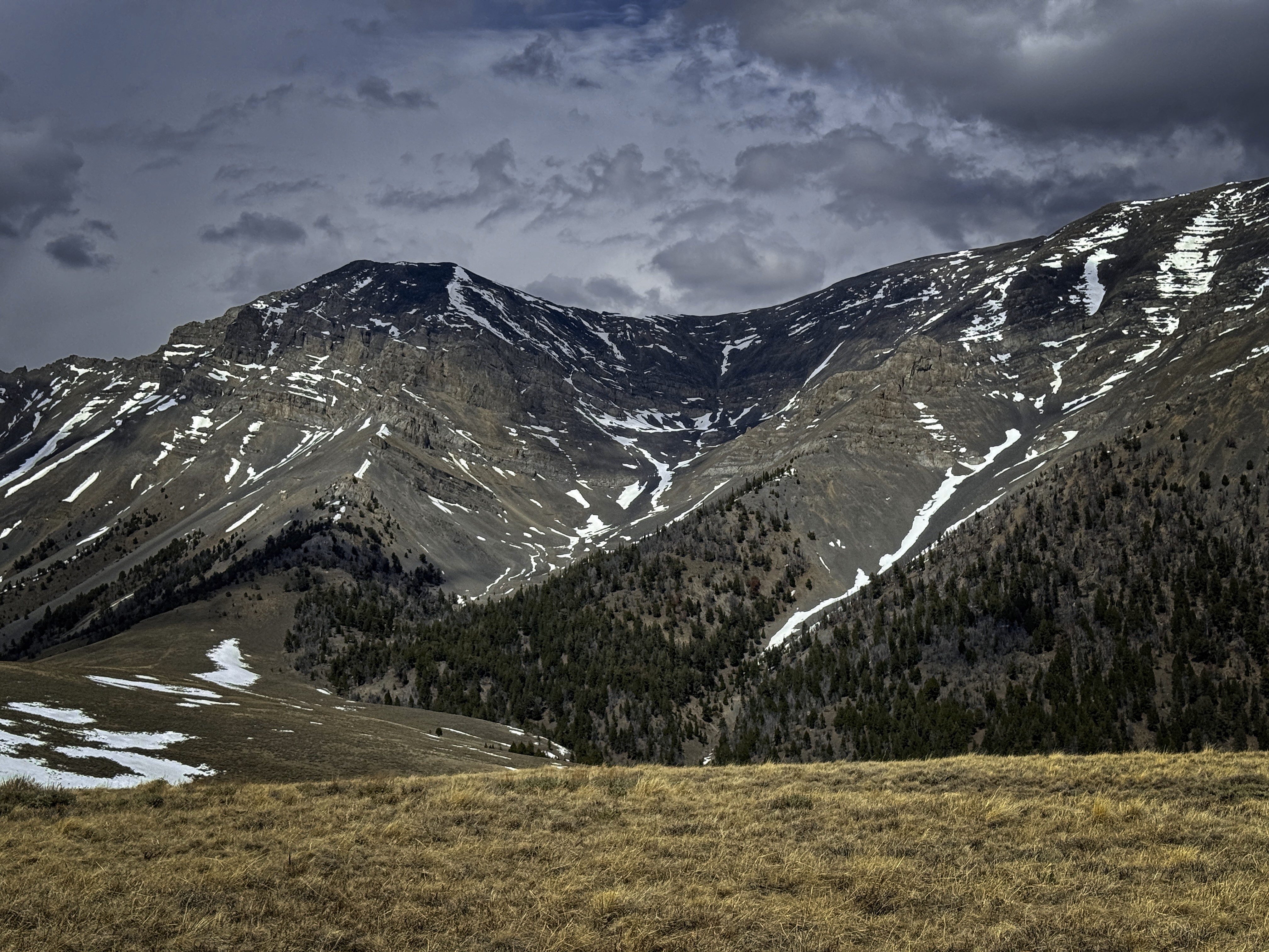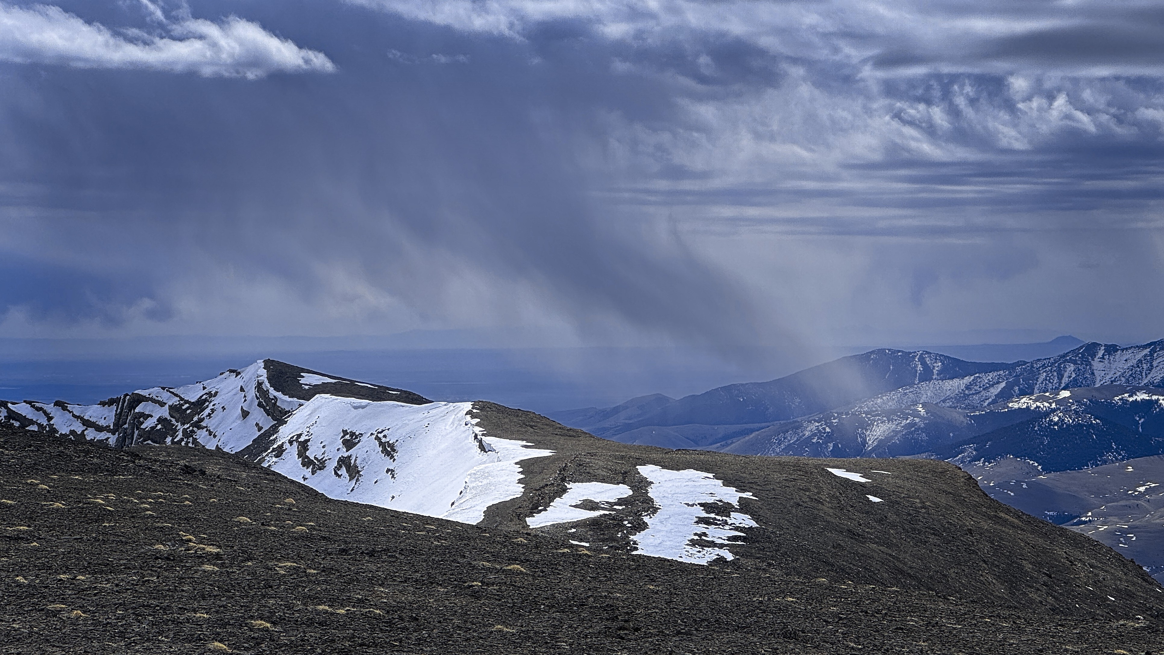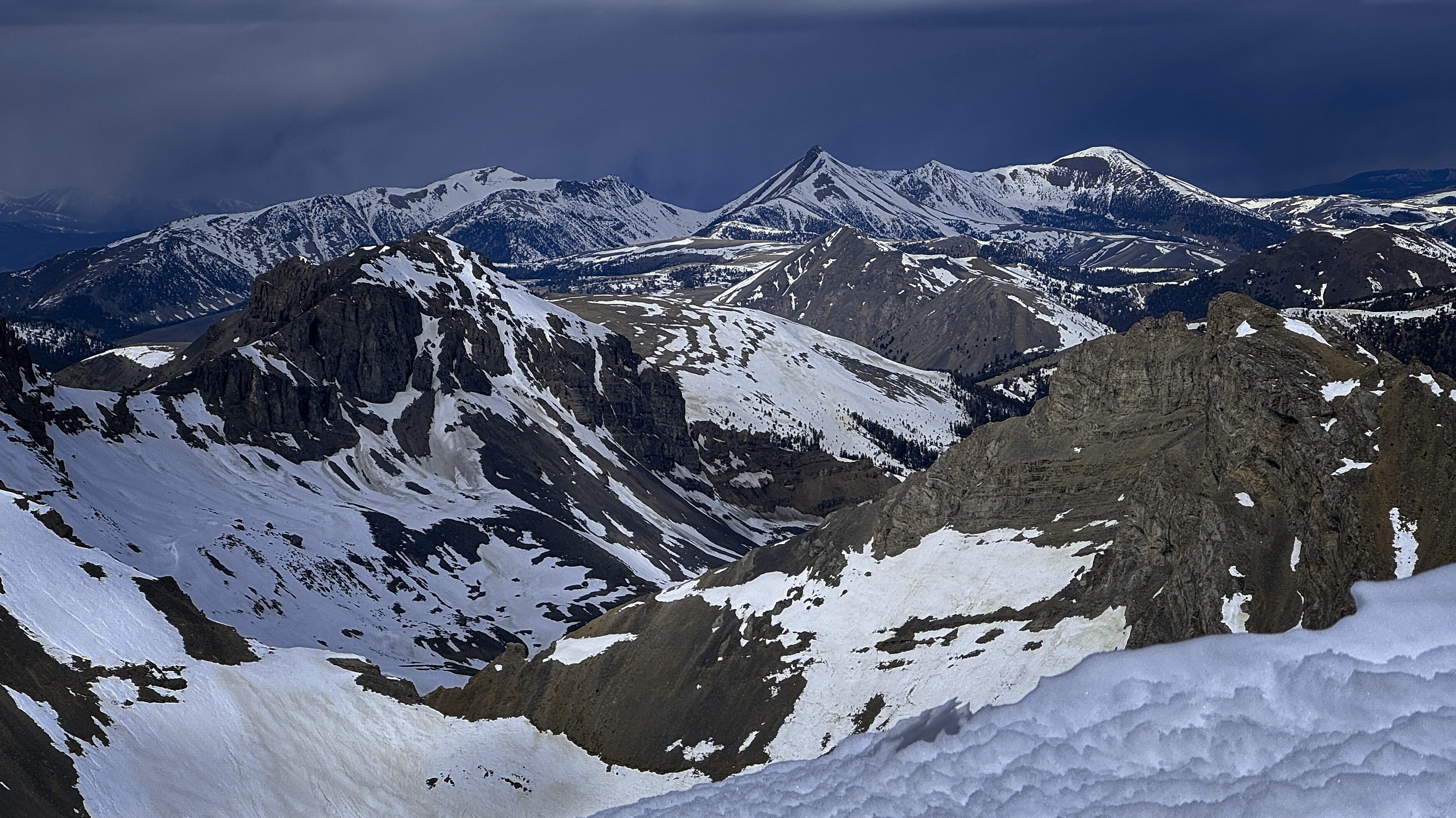 Once back to the trail, I decided to head south along the broad, grassy Beaverhead crest for a couple of miles and then turn down a valley to reach the trailhead from the east instead of the north. Sun and cloud alternated beautifully. I saw a whitetail deer running in the grass, or maybe it was an elk? Turning into the valley, I'd have a gap with no trail between the high country and a trail in the narrow valley. This was only a little bit tricky, with deep and rotten snowpatches, steep forest, and the need to avoid rocky outcrops. Elk tracks helped me out.