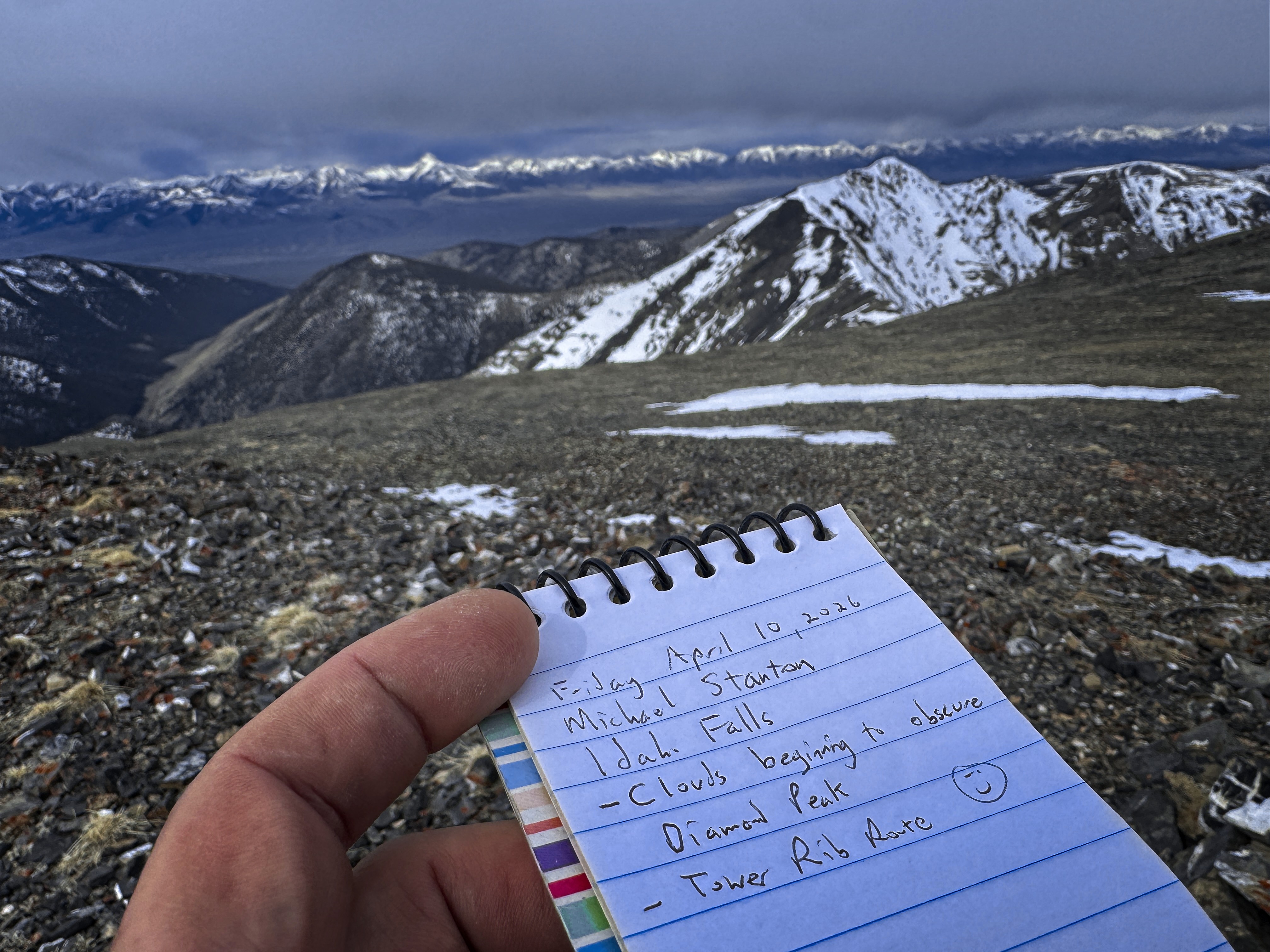 Rather suddenly, it seemed, I was at the ridge crest. I turned left and marched to the summit on snow and rock. I was the first to sign the register since last year. Being careful of the cornice, I could look down east into the Webber Creek valley. I could also see the weather coming in from the West. Diamond Peak looked amazing, though clouds were beginning to cover it. It seemed I should have just enough time to visit Huhs Horn and come back.