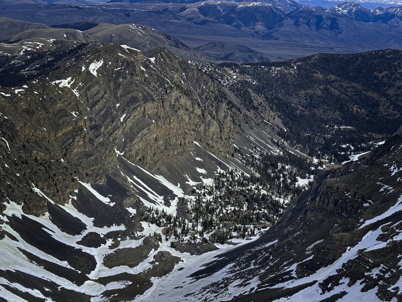 I drove down in the evening, making for an interesting drive on the dirt roads at night. The directions on the site were perfect, and I was able to park at the official Scott Canyon trailhead. In the cold morning I hiked quickly to warm up, and soon I was looking across at Tower Rib. If there was sufficient snow, I thought I'd just kick steps up the West Face, but alas, there was not! I left the trail, traversing sagebrush mountainside to a little forest, then began following Tower Rib up, easily in open forest. I switched to boots at the highest trees, and soon was traversing on the west side of the lower tower. There was a faint trail, you can just follow your instincts when it occasionally disappears. Such trails look so much more well-defined on the descent!