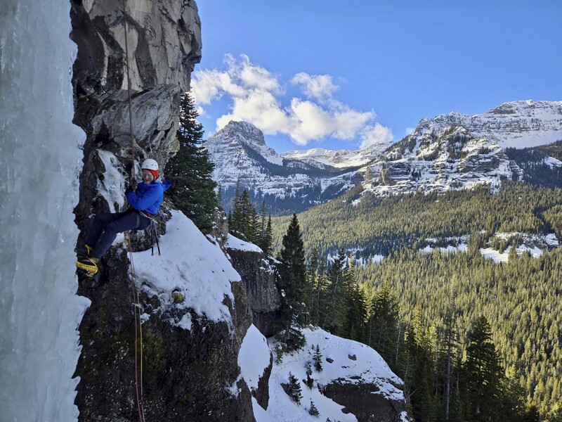 Next we got on The Matrix (WI4-), which sometimes needs some rock gear, though on this day there was sufficient ice. What a fun climb! Robert brought up a haul line. I reached him at the belay, then abseiled on that line. We saw that he could abseil on the single lead line with stretch, only just barely! He could touch down at the base of the initial vertical pillar perfectly with stretch. A really nice cave to belay and hang out in for snacks and hot tea.