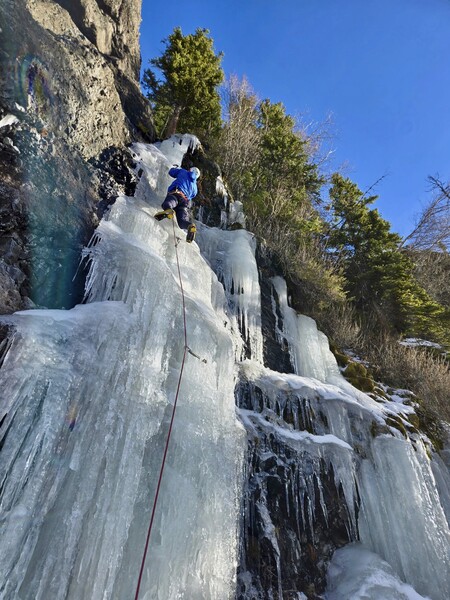From here we walked around the Frigid Aire (WI4), which Robert led. It had a couple of vertical sections separated by a lower angle skirt. He left the screws in place so I could "pink point" the route. This was great fun. I really appreciated the last 1-2 screws, as the terrain was vertical and the ice a bit thin, aside from the column on the right Robert had wisely used for the gear.