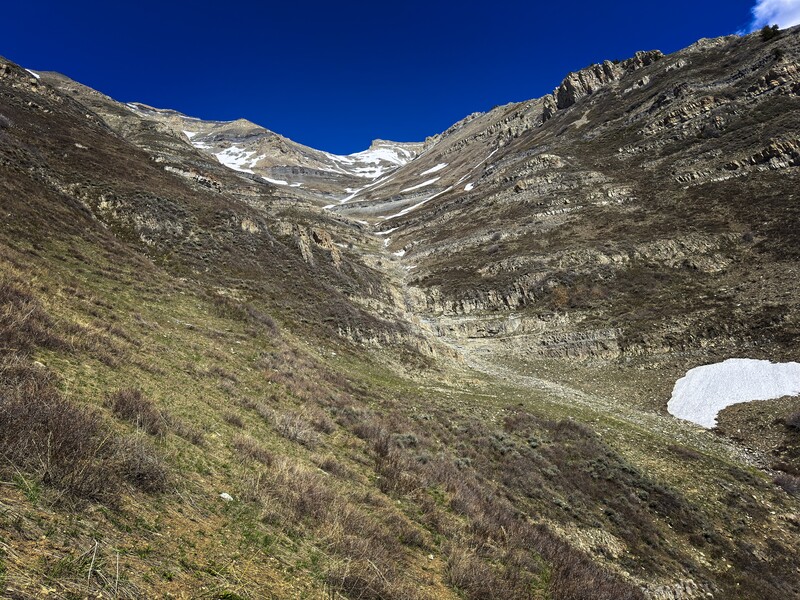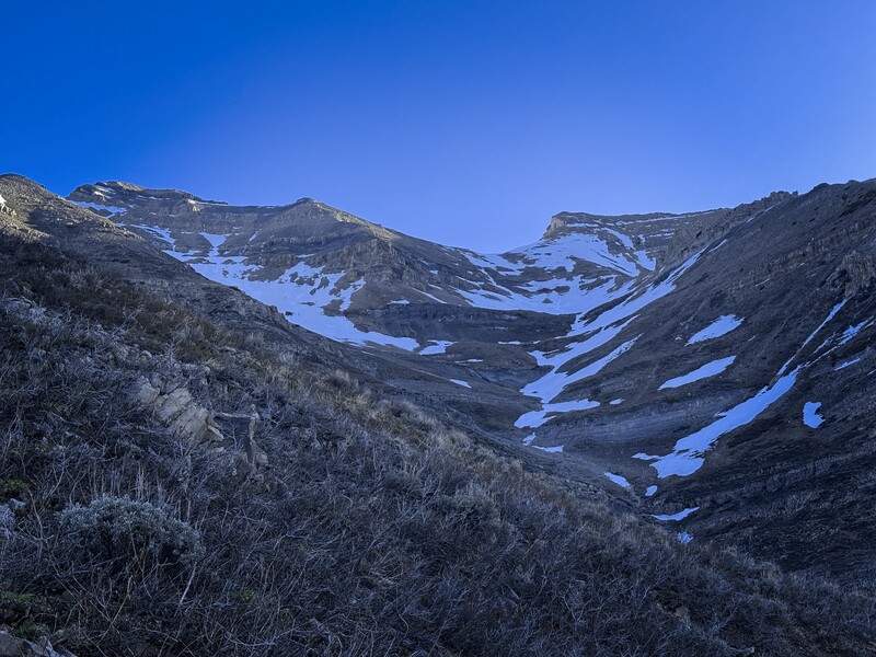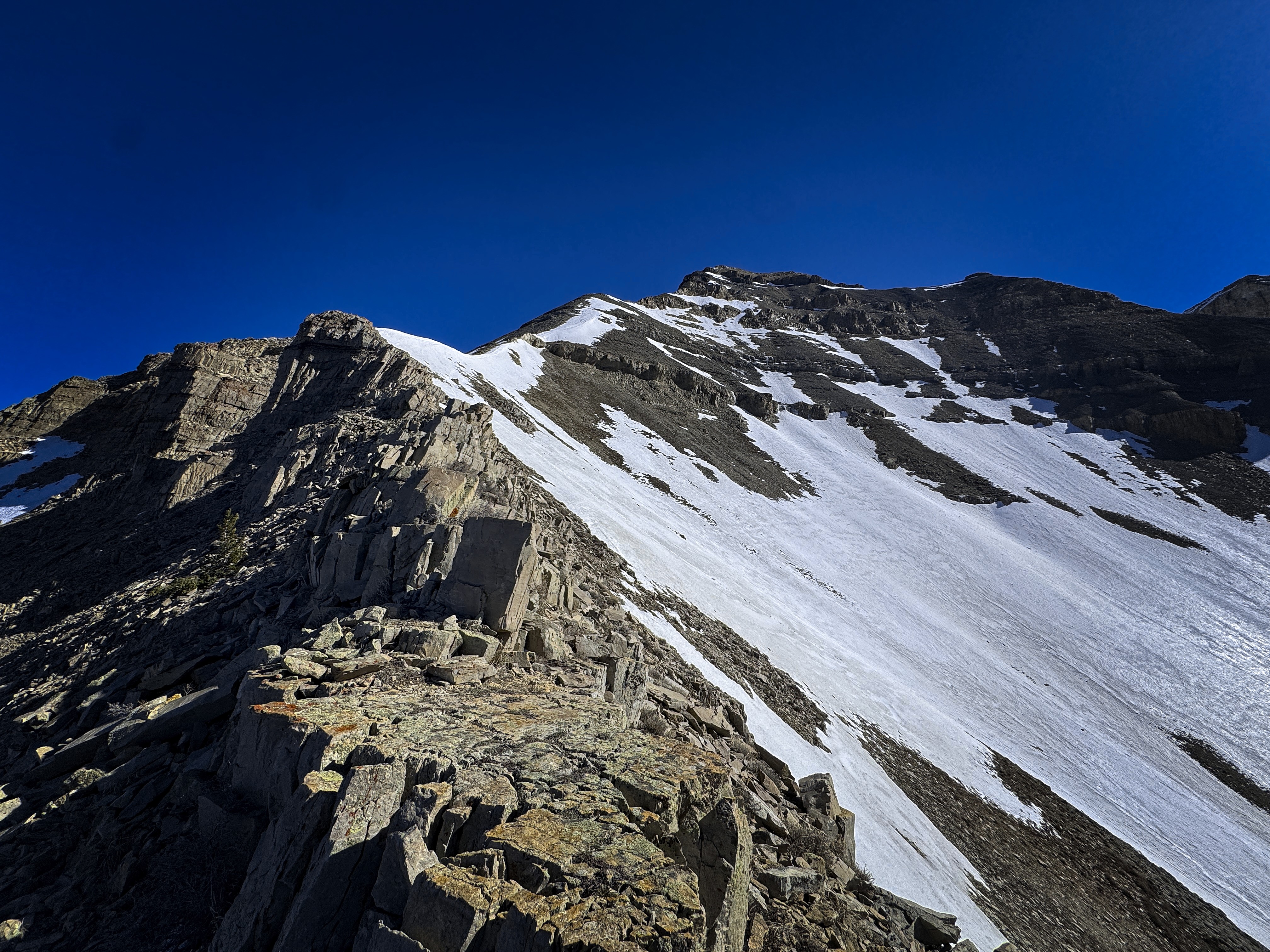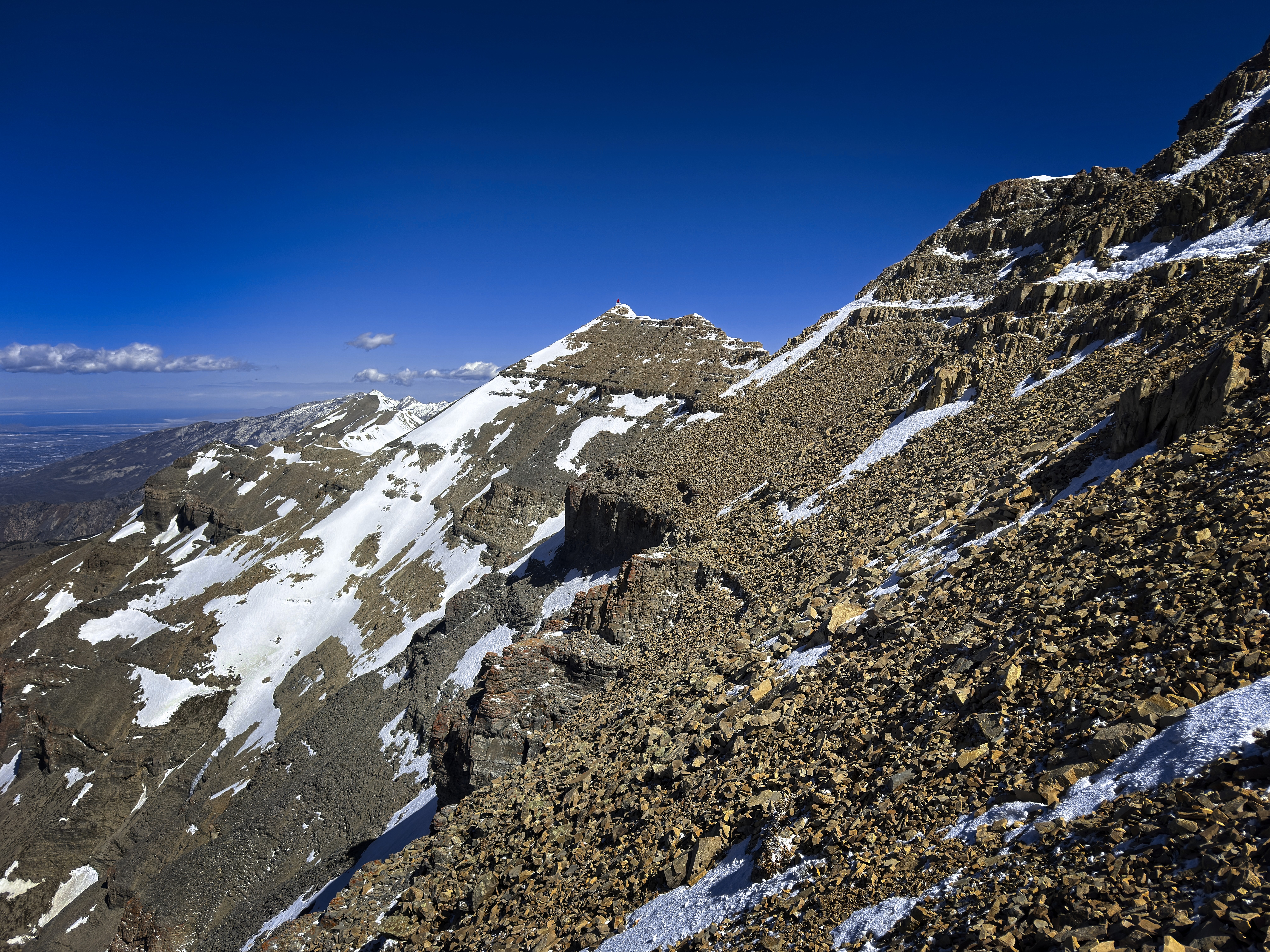 I arrived at the Baldy saddle, and wondered who built the terraces with fruit trees (I guess?) spreading out in many rows. Now I left the ridge, following a trail up into the canyon just right of the ridge. About 400 feet up, I gained the ridge crest and stopped to changed into boots and eat something. It seemed crazy that there was still sagebrush at this elevation! I motored up the ridge for over a 1000 feet, then reached snowfields on the right that began painting over the ridge crest. Time for crampons and axe here! The snow was good, hard but not icy. I reached a fairly level area, then climbed up to the final headwall. Here, you can climb the ridge directly at 4th class, or traverse to the right in order to mostly avoid rock climbing, though not completely.